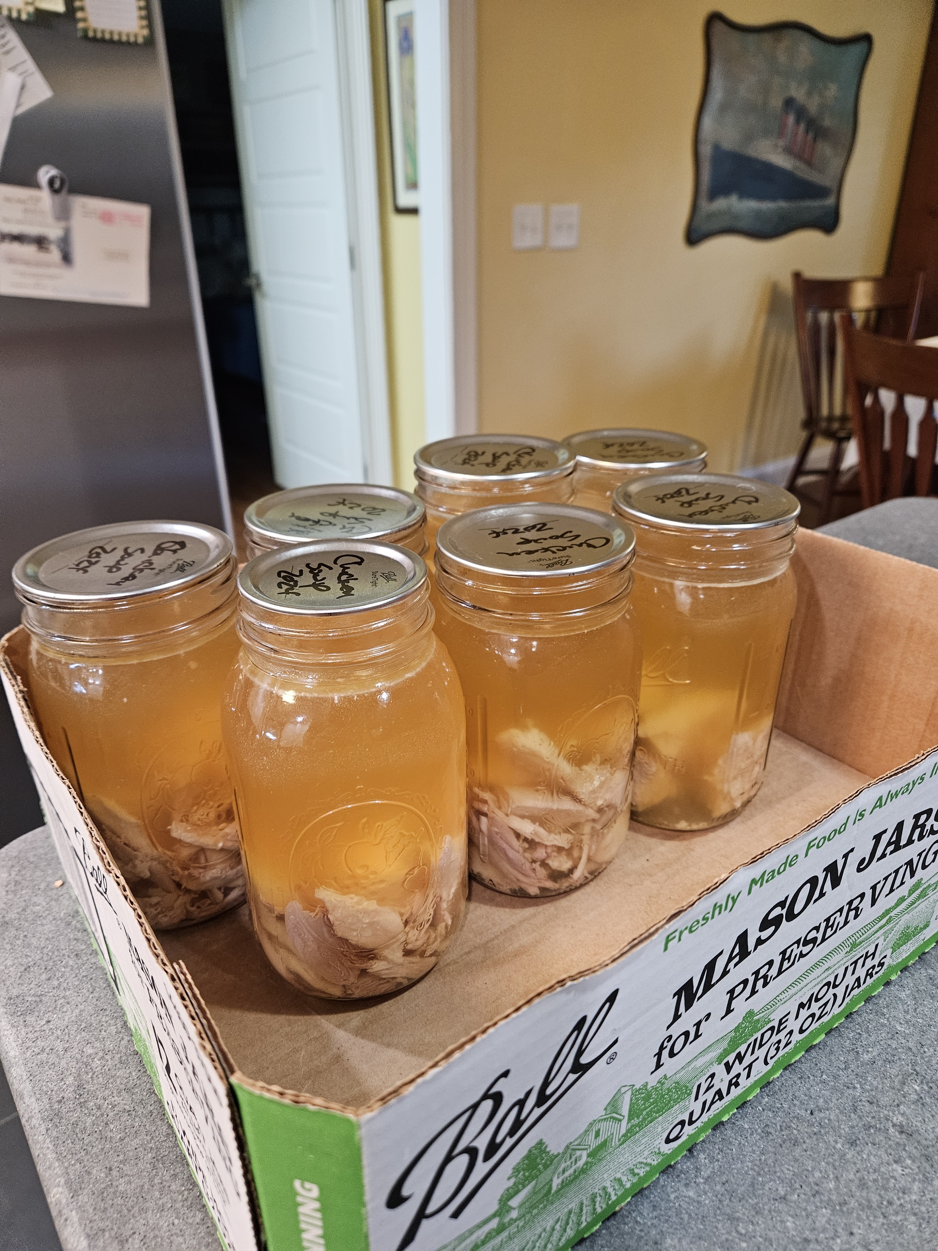 First step was to pull all the meat off of the bones. Then I took all the bones and the skin and I put it in a large pot and covered it with water and boiled it for about 90 minutes. Then I used a large slotted scoop to remove all the bones, etc. and I ladled the broth through a fine mesh sieve into a large food storage container. I let the meat and the broth cool overnight in the refrigerator. In the morning, I skimmed the fat off of the broth and I canned according the the Ball Blue Book.