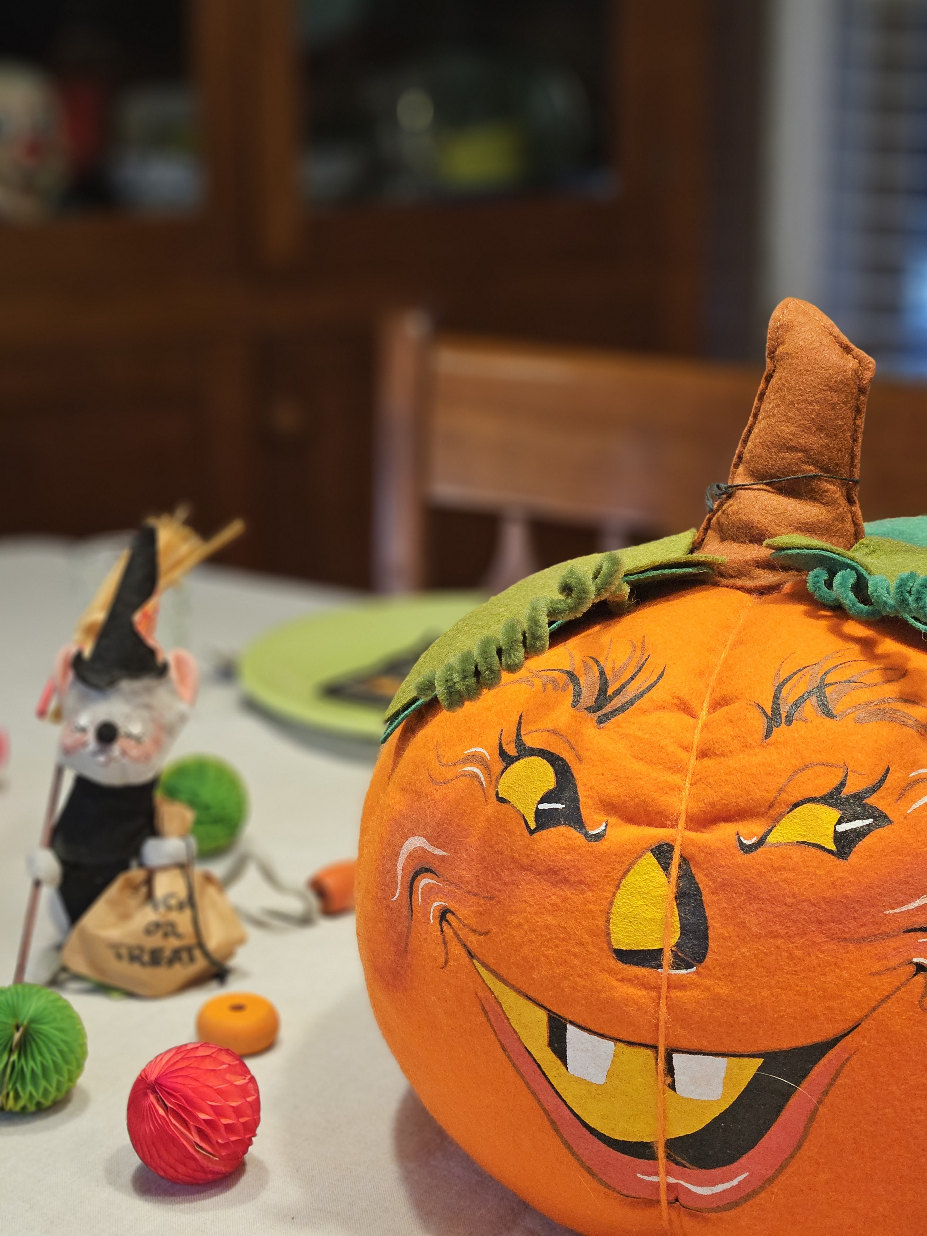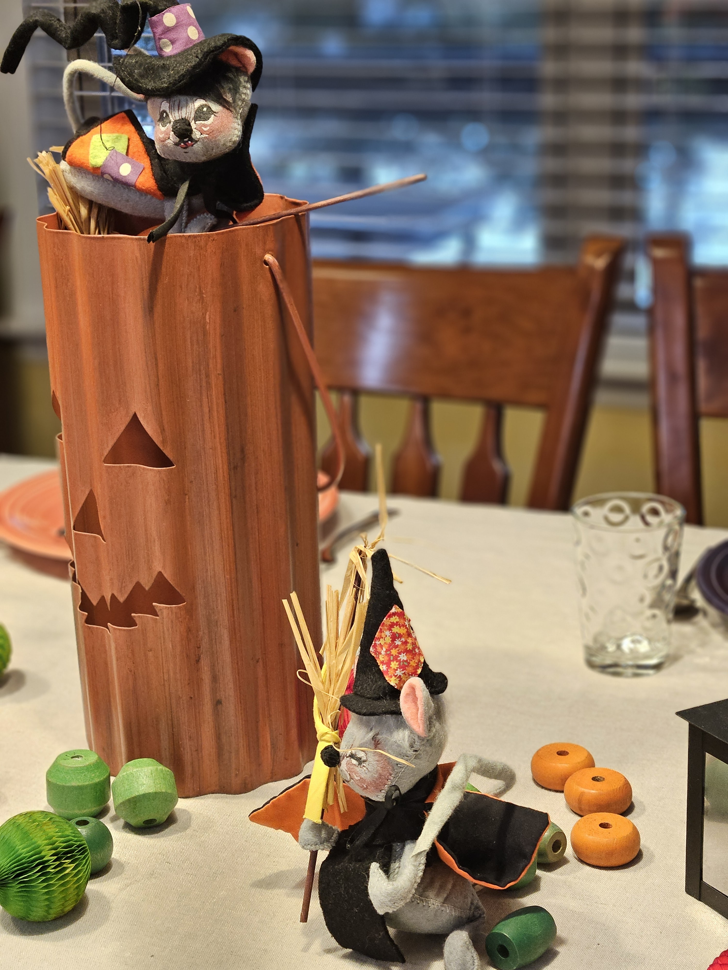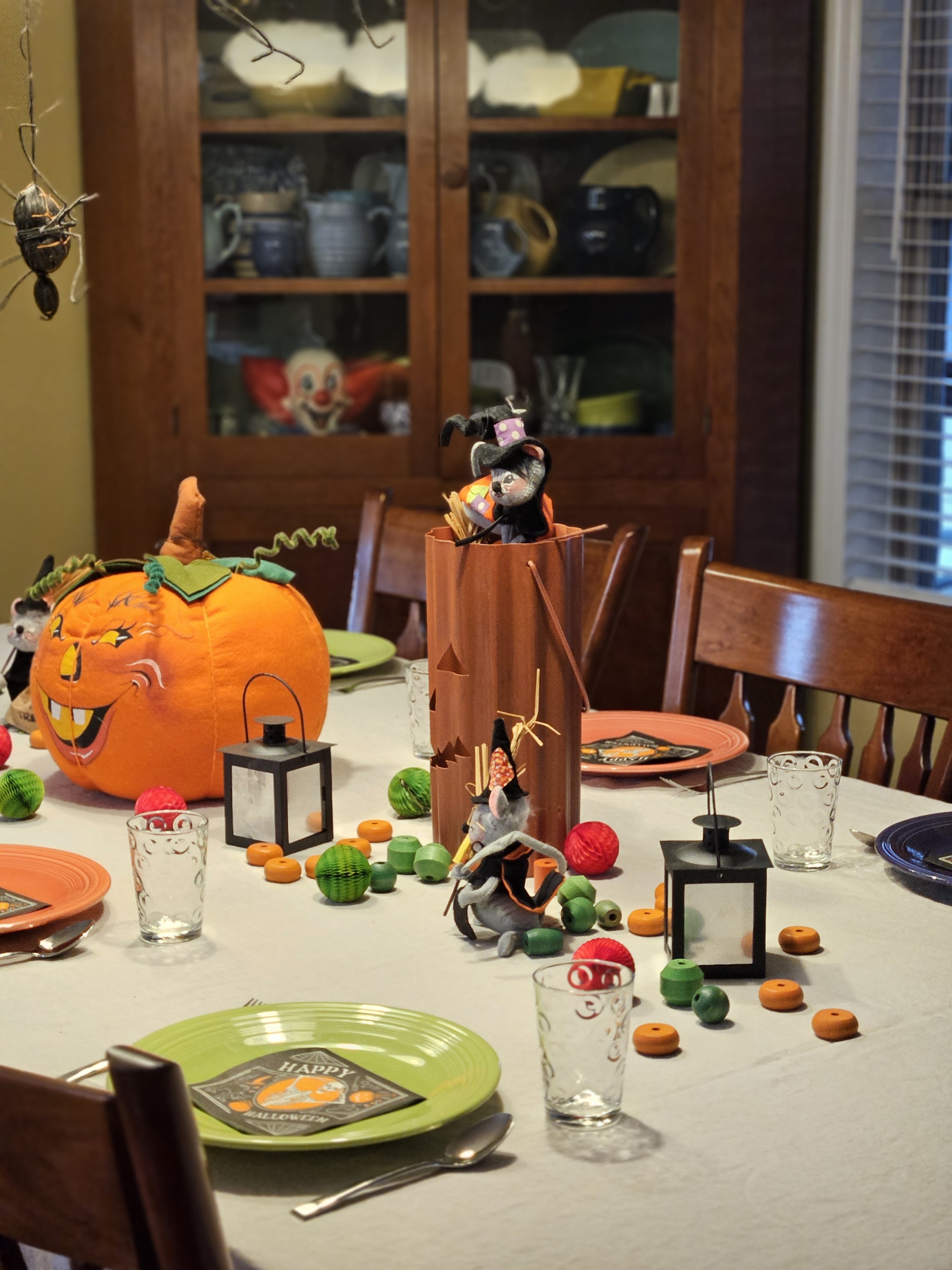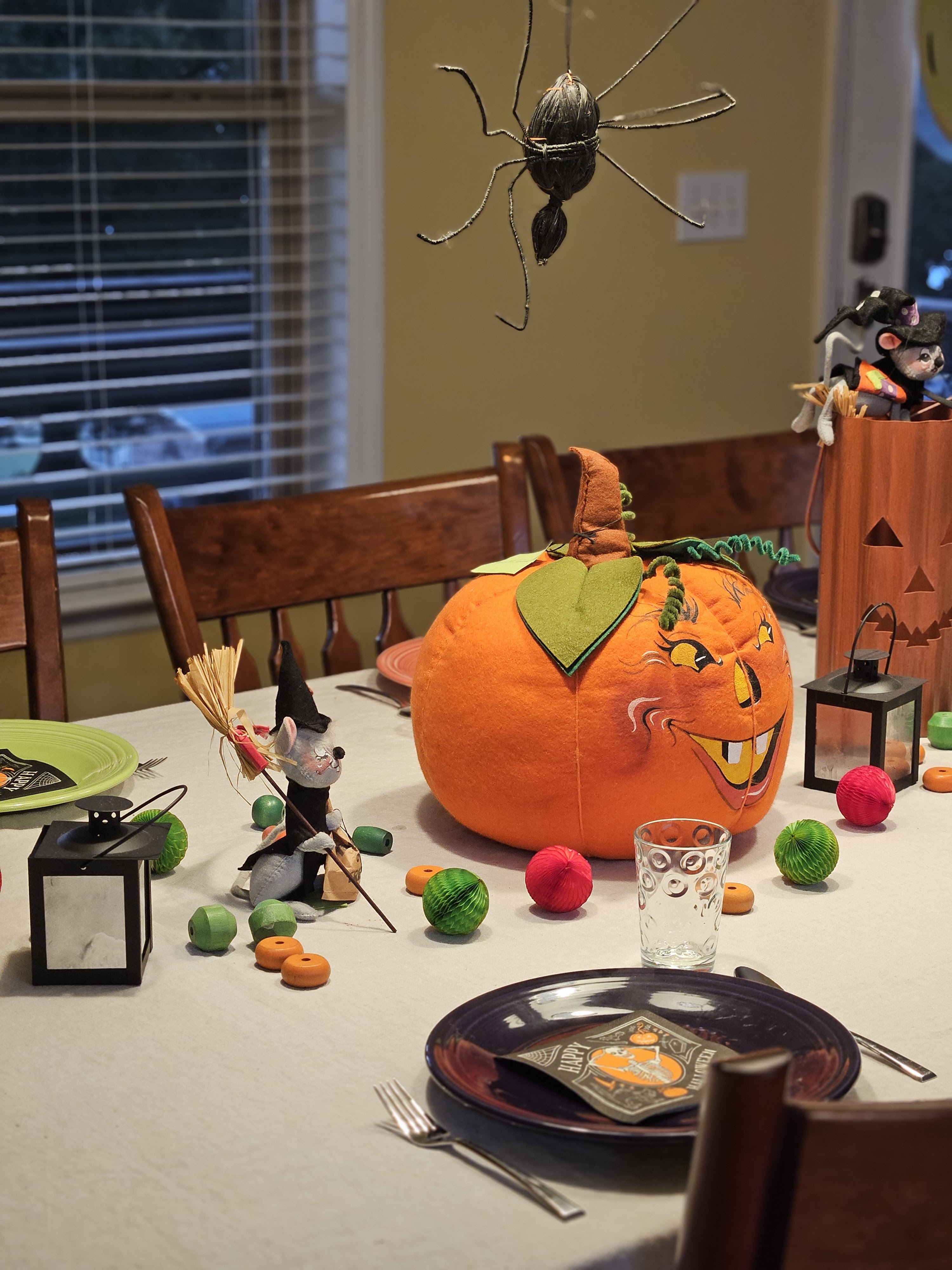 For this table I started with orange, acid green, and purple Fiestaware plates–because I have them and they’re really durable, so great for kids. I used my Vintage Annalee pumpkin and mice and sprinkled in some orange and green wooden toy beads and some honeycomb balls in orange and green. I added a metal jack-o-lantern and some black lanterns with antique mirrored sides. I hung a couple of spiders from the light fixture for a little bit of creepiness.