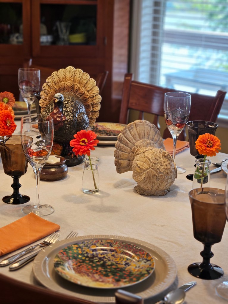 I added a colorful turkey to the display along with vases of orange flowers. The place settings are Ballard Designs for Southern Living Putty colored dinner plates, Sakura Vincent salad plates, Lenox brown water glasses, and stained glass wine glasses.