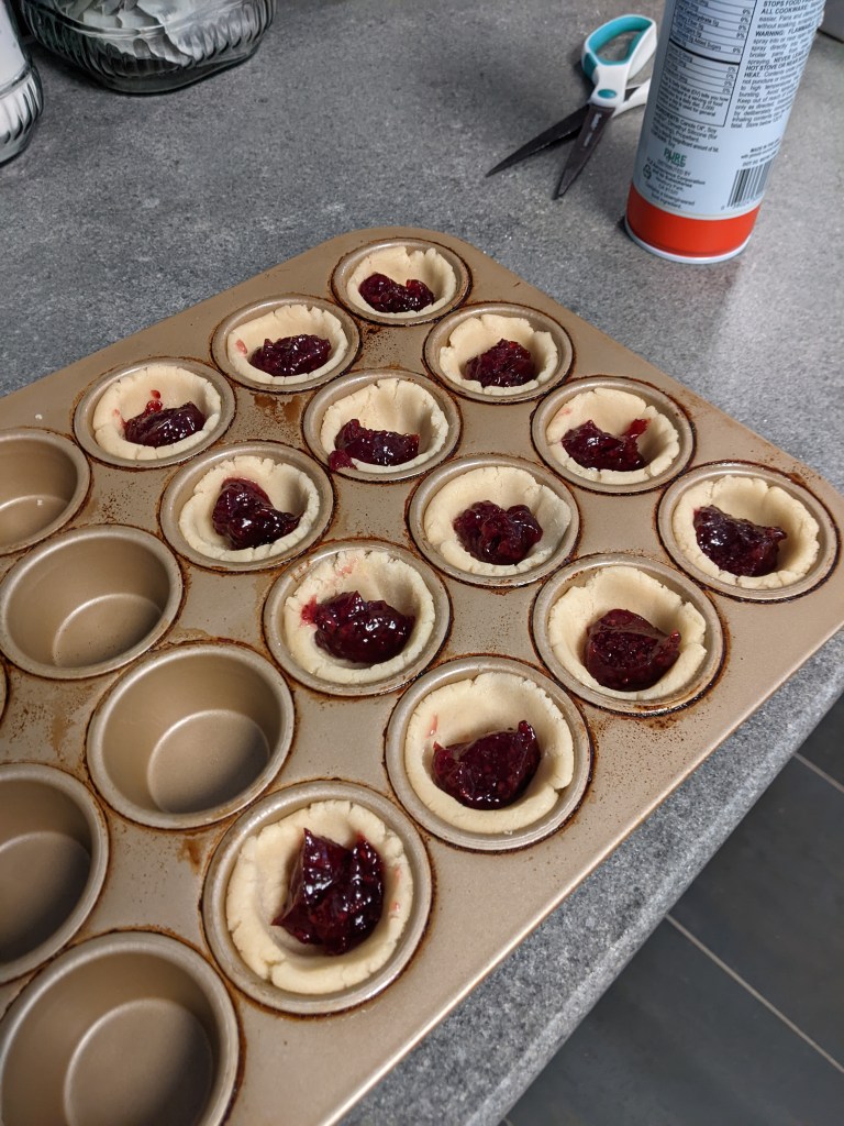 I rolled the dough into about tablespoon sized balls and placed them into well greased mini muffin pans. I flattened them into the bottoms of each cup.