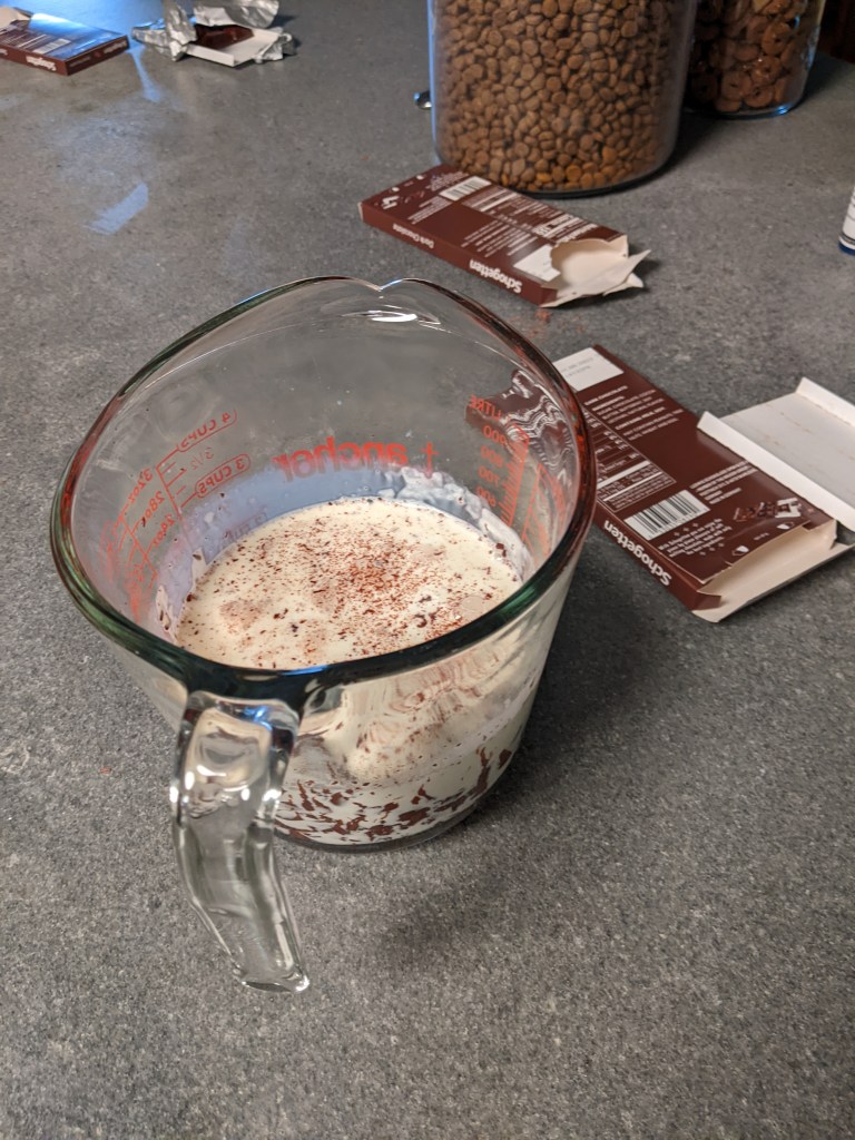 I microwaved one cup of whipping cream for 2 minutes and poured the chopped chocolate into the measuring cup.