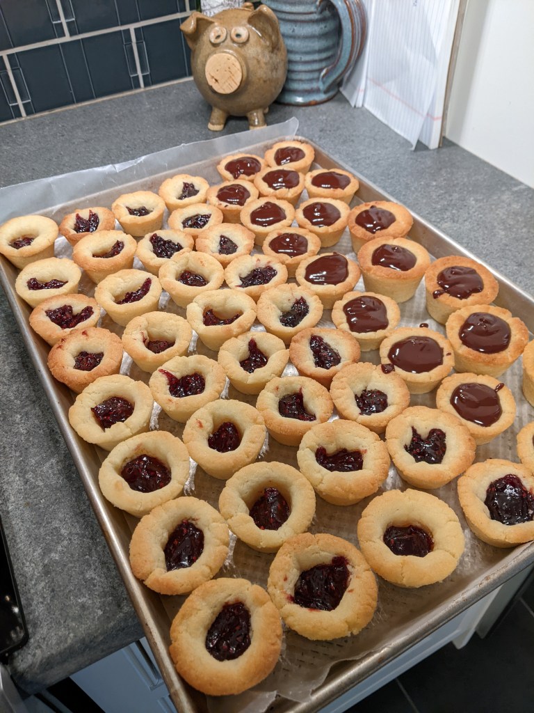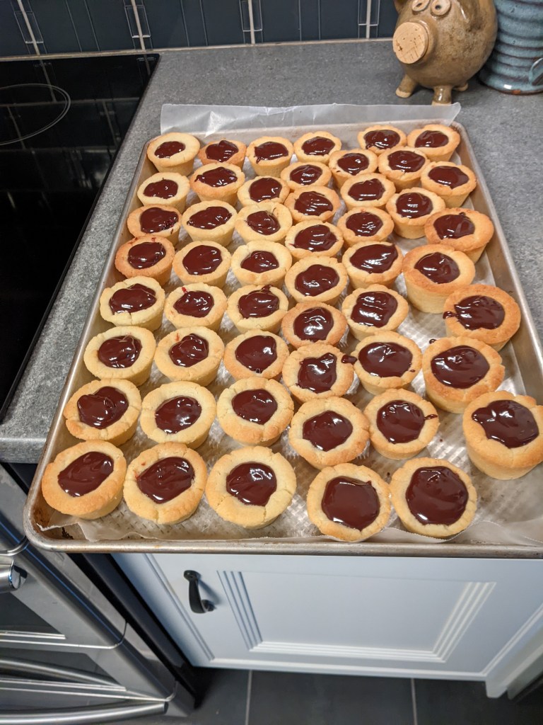 Once they were completely cooled, I removed all the cookies from the muffin tins and placed them on a waxed paper lined tray. I found that the best method was to twist the cookie gently in the cup before lifting it out.