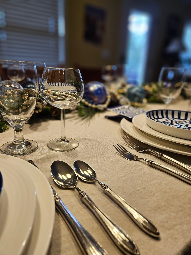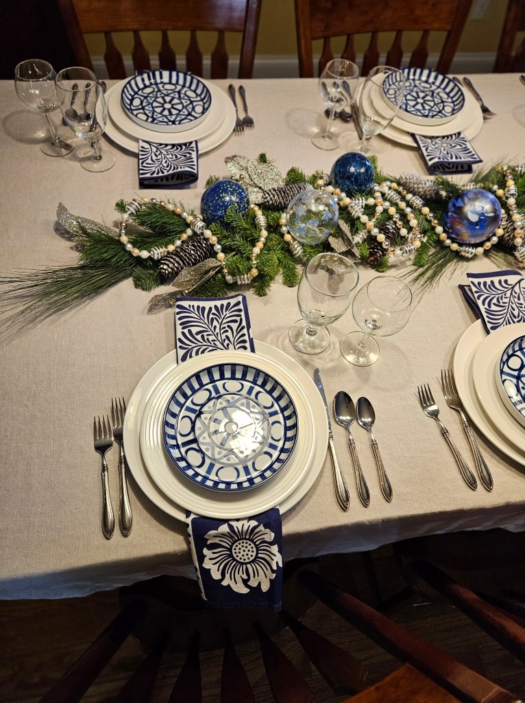 I started with faux greenery and some glittery leaf picks and I added handblown ornaments in various shades of blue and some pinecones that I painted silver. I topped that with the Shiny Brite glass garland. The place settings are MaxaDura service plates by Wedgwood, RAK buffet plates, and Dansk Arabesco salad plates. The napkins are from Williams-Sonoma.