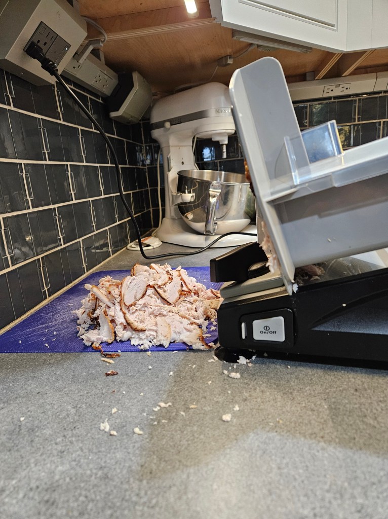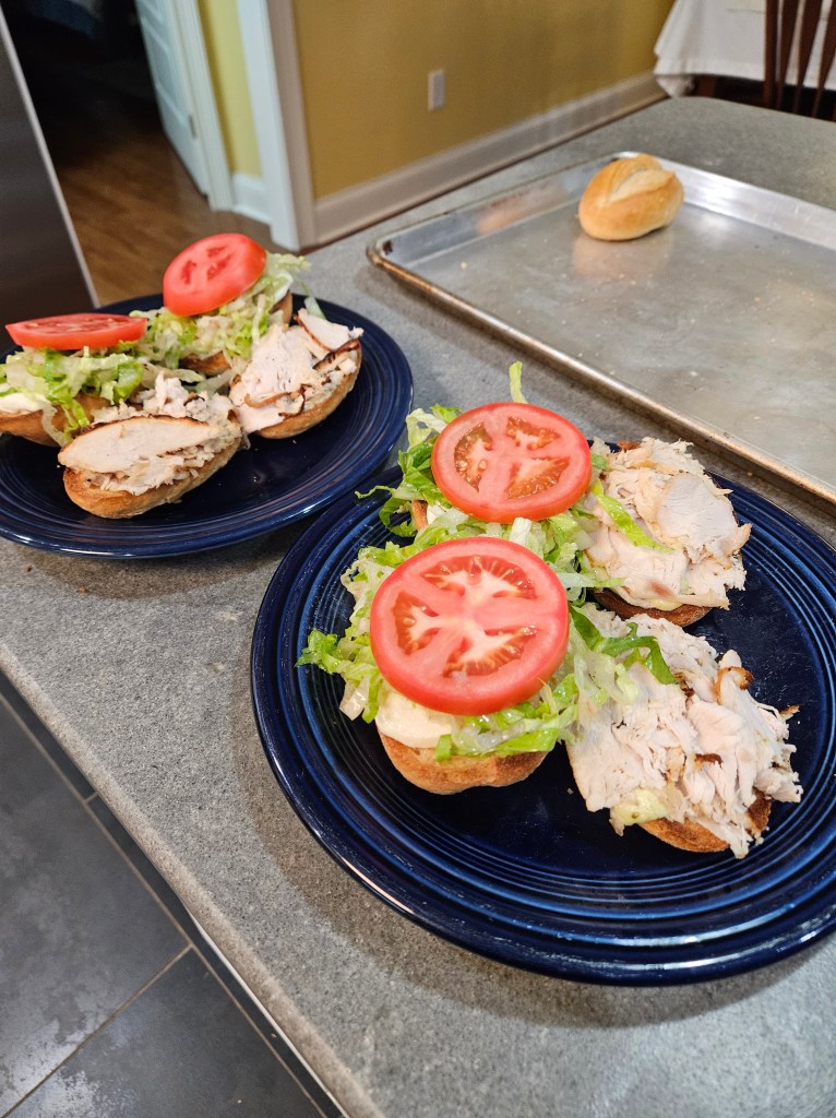 My husband loves sandwiches about as much as anyone you’ll ever meet. Deli meat has gotten crazy expensive, and then with all the recalls, we just don’t like to buy it. So, this week, I bought a turkey breast at the grocery. I let it thaw in the fridge and I took the meat off the bone and put a dry brine on it and set it in the fridge overnight. The next morning I roasted it. (Go to this post if you want to learn more about this part: https://cathyathomeontheriver.com/2021/11/16/thanksgiving-preparations-make-ahead-recipes/ ) I also used the carcass for turkey broth.