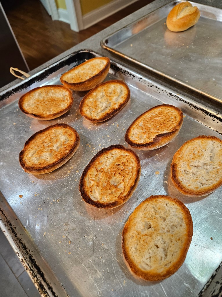I started by toasting the rolls–I broil them in the oven. You have to keep a close eye on them because they can go from too pale to burned in an instant.