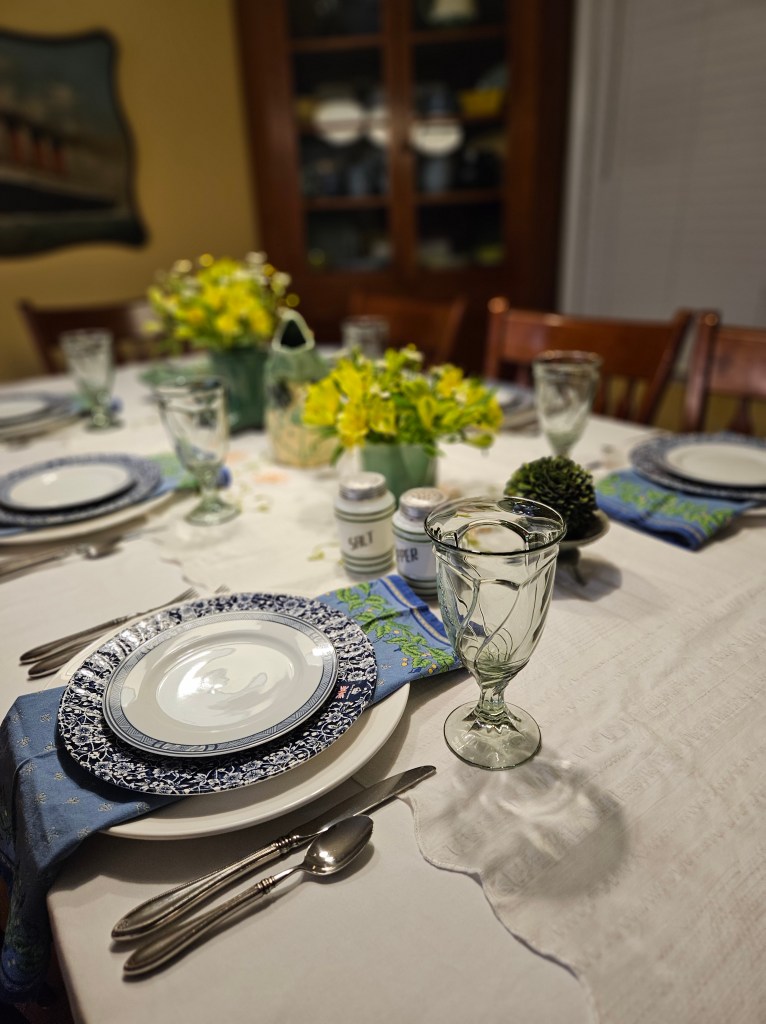 I had another idea for this table using some more items that I bought to sell. This time, the place settings take their nod from the napkin. I used Royal Stafford Victorian Calico Blue dinner plates and Blue Dynasty Salad plates. I like it.