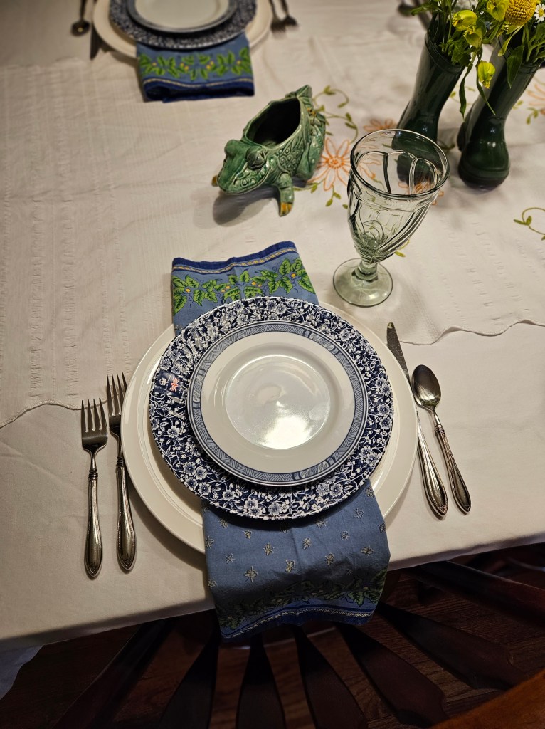 I love this centerpiece. And my husband, who normally doesn’t comment, likes it too–especially the frog pitcher.
