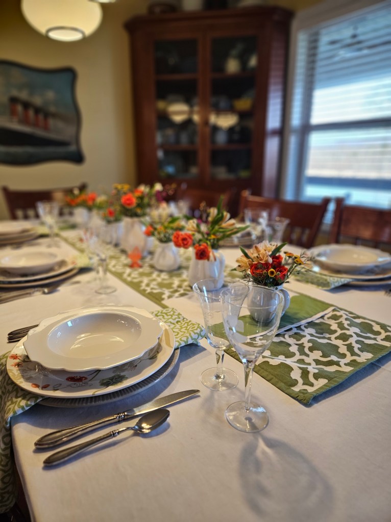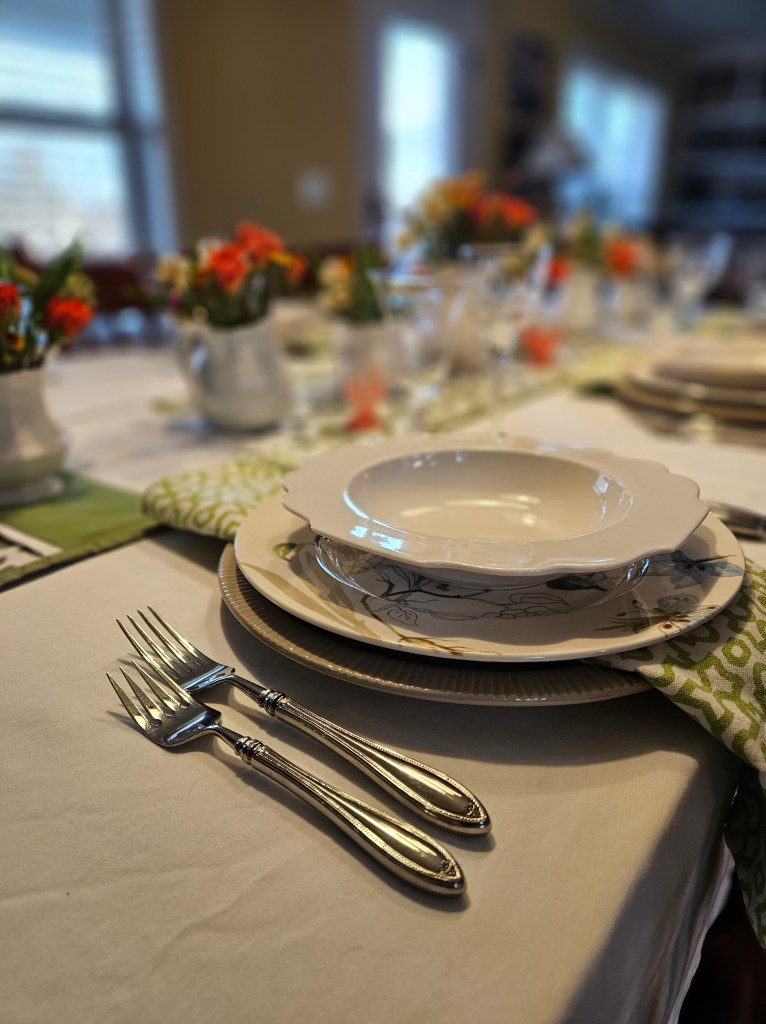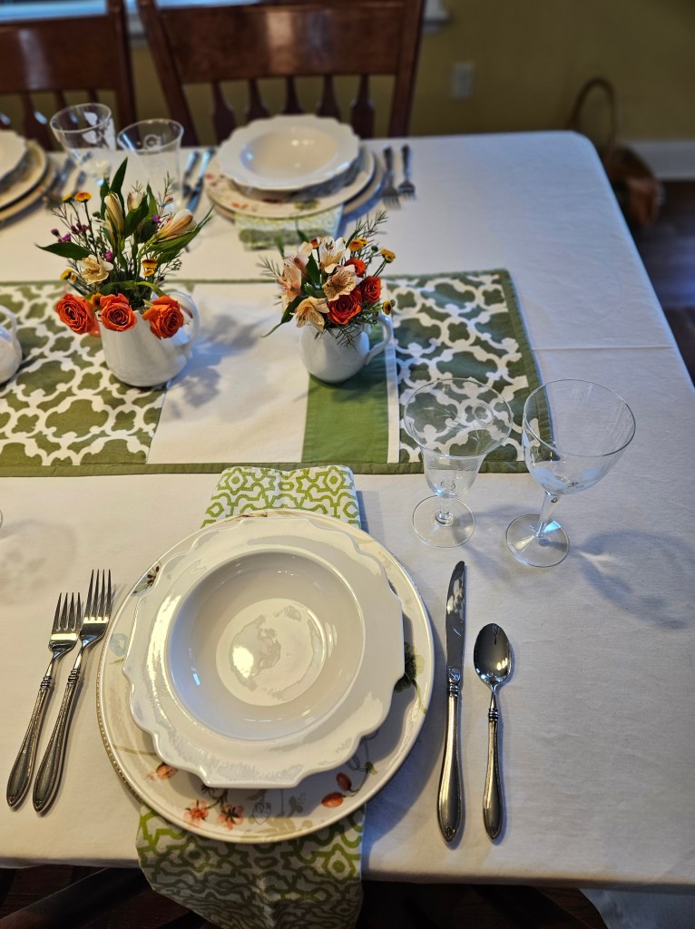 I used the trellis print napkins because I thought they echoed the design in the runner. I thought the rim soup bowl also echoed that same design.