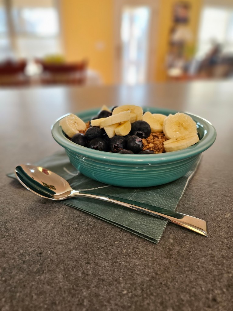 To serve, you top with granola. (Here is a link to my high protein Nutella granola :https://cathyathomeontheriver.com/2023/10/21/high-protein-granola/) Then top with berries of your choice (I prefer blueberries because they will stay good all week whereas other berries don’t), sliced banana, and a dollop of jam (if desired). The Blue Bicycle makes Blueberry Lemon Jam and it is quite good. I figured that one out too. Here’s the link: https://cathyathomeontheriver.com/2024/06/07/blueberry-lemon-jam/