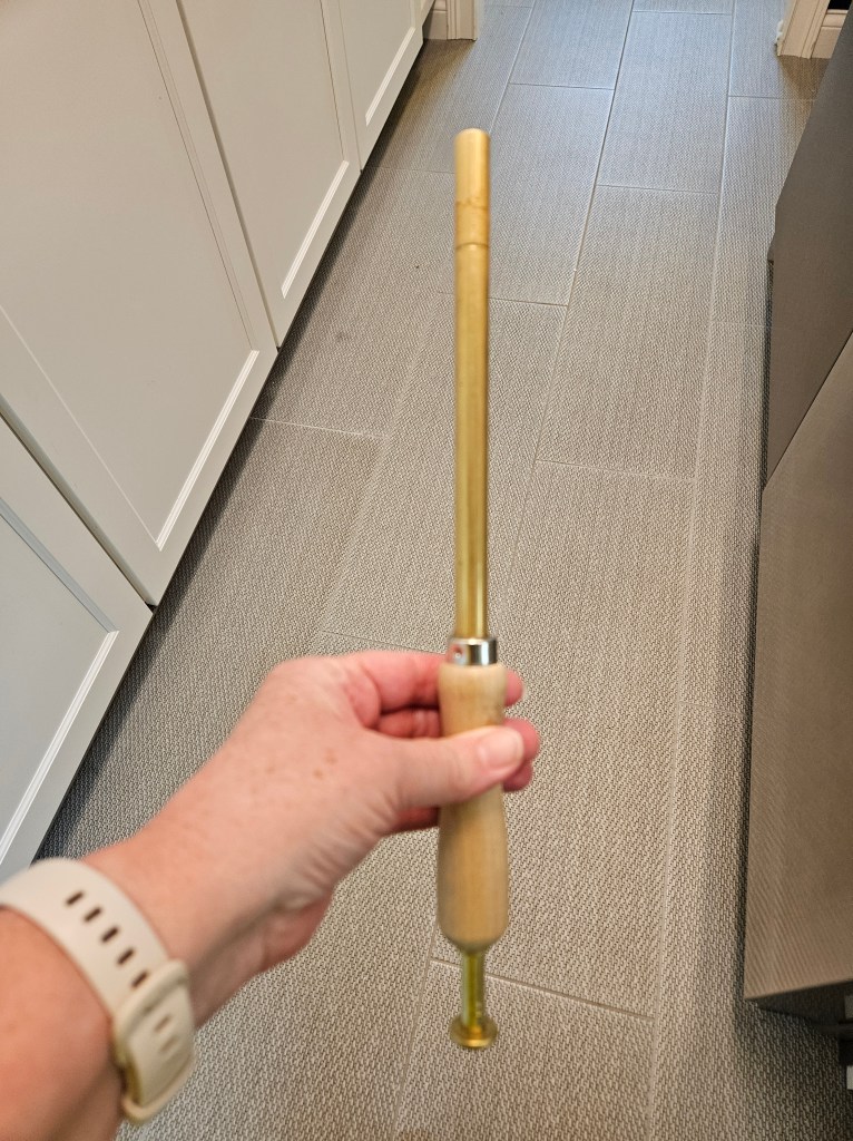 Then you use a special tool to pack a little “dose” of mushroom spawn–which is a dampish sawdust product that is full of the spores. Here’s what that tool looks like: