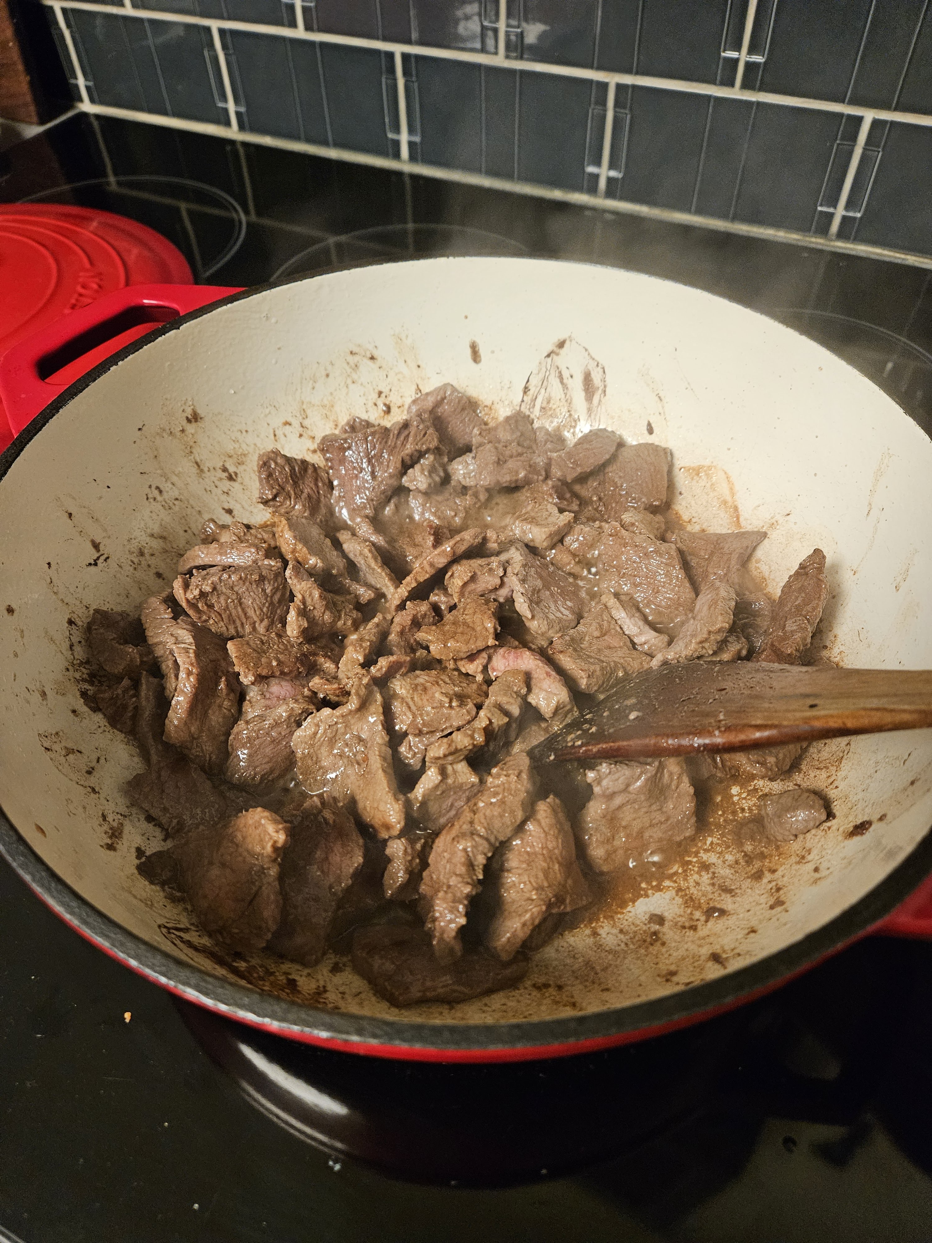 Start by heating oil to shimmering in a large skillet or braiser. Once the oil is hot, add the meat. Cook until brown.