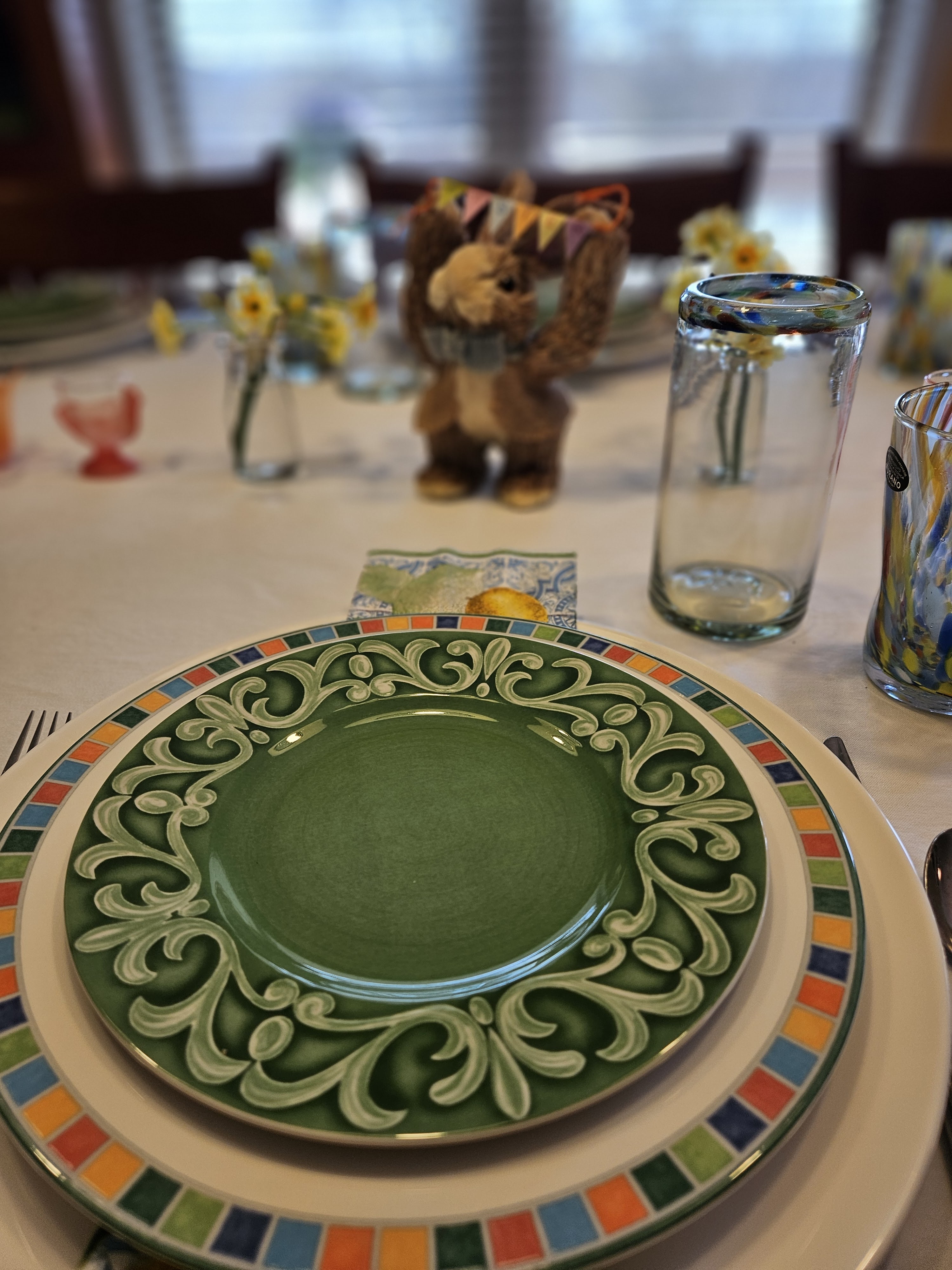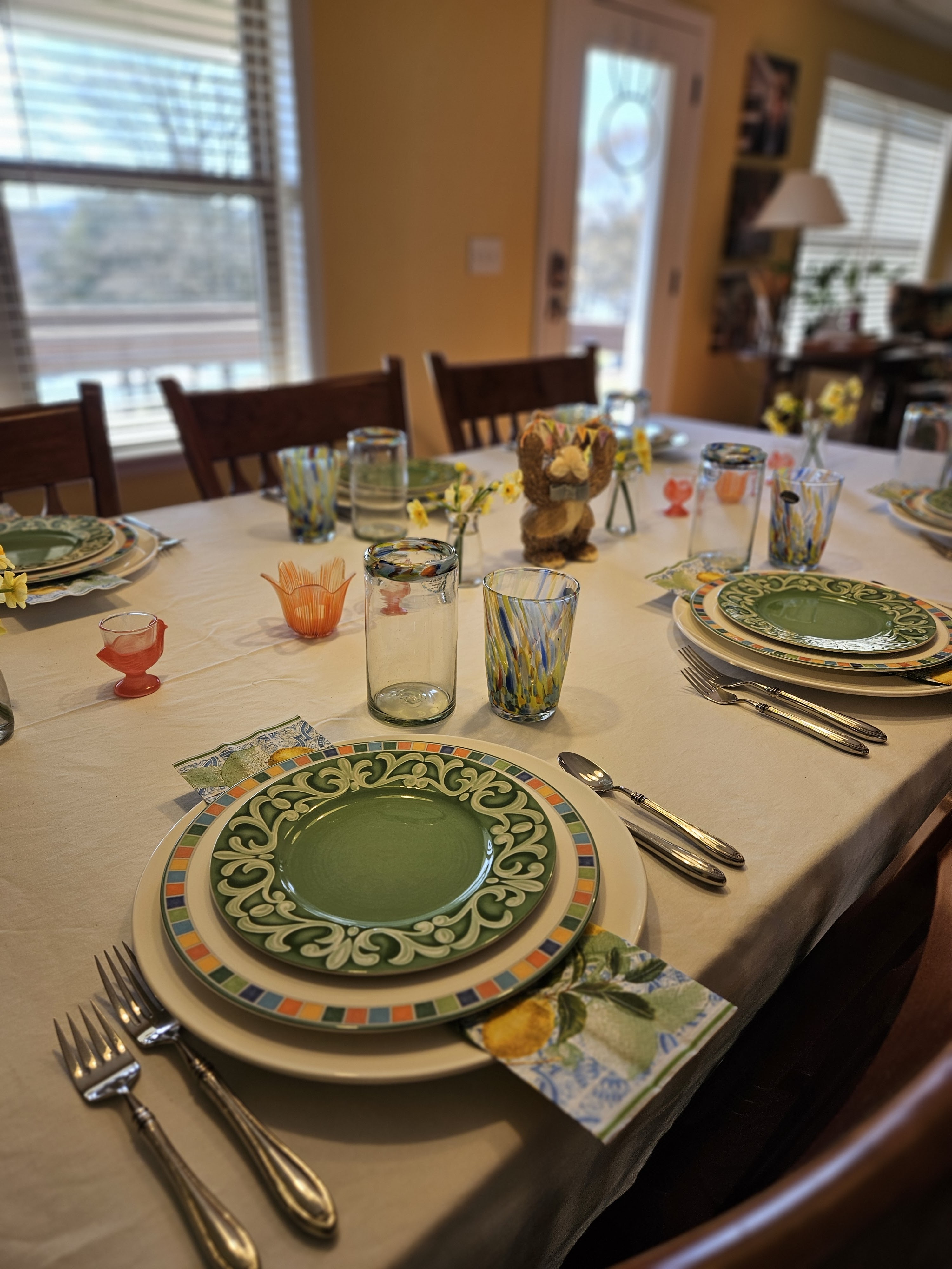 The place settings are the Wedgwood MaxaDura service plates; lemon paper napkins; Villeroy and Boch Alea Caro Dinner plates; Villeroy and Boch Switch Summerhouse Arabesque; Mexican Confetti Glass tumblers; and Murano tumblers. The centerpiece is French glass egg cups; little bottles with narcissi; orange floriform candleholders; and a coir bunny.