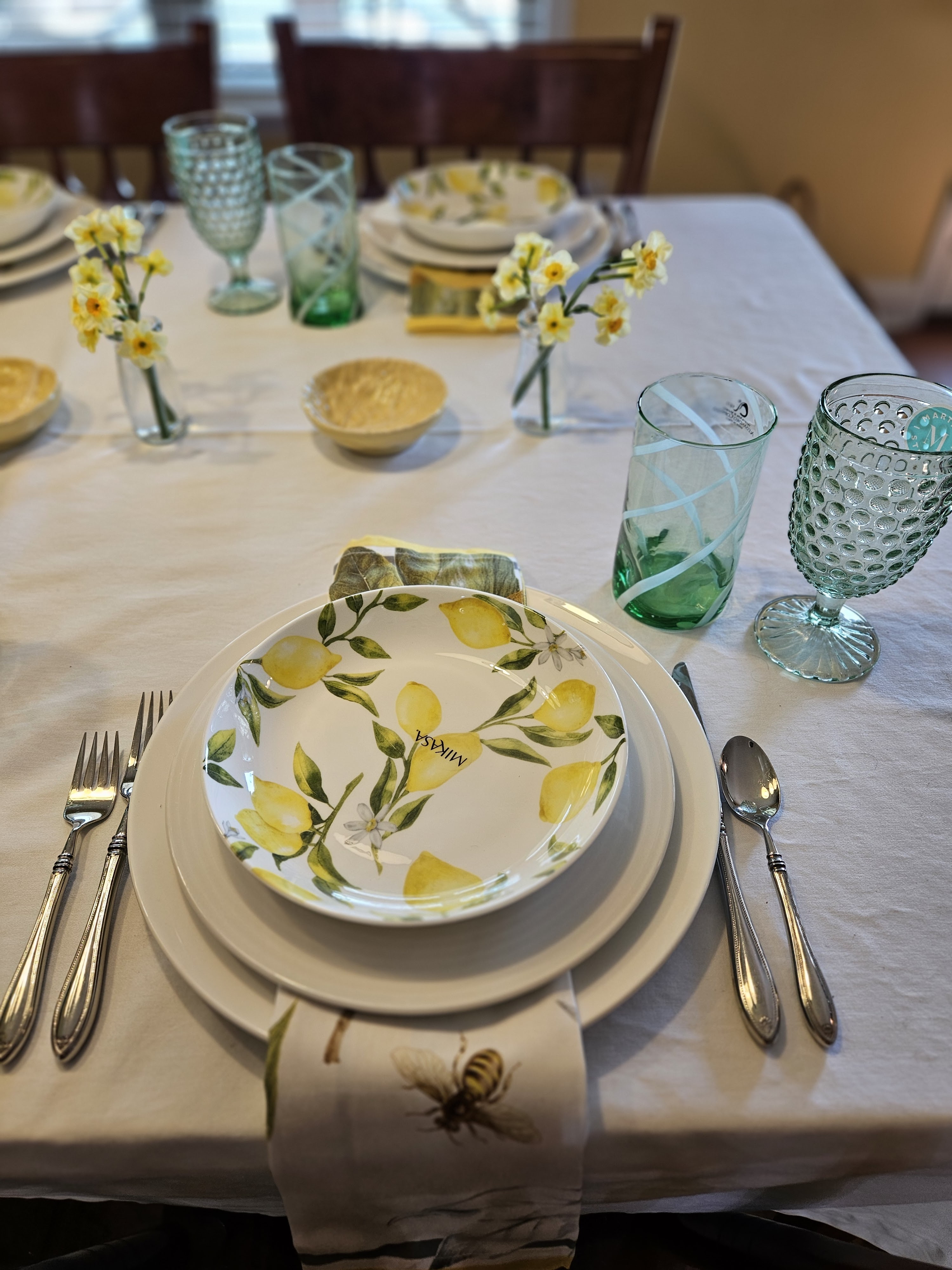 This is a fun table with yellow and green. You could use fresh lemons for the centerpiece. I used a Majolica daisy pitcher, narcissi in glass bottles, and Bordallo Pinheiro cabbage bowls.
