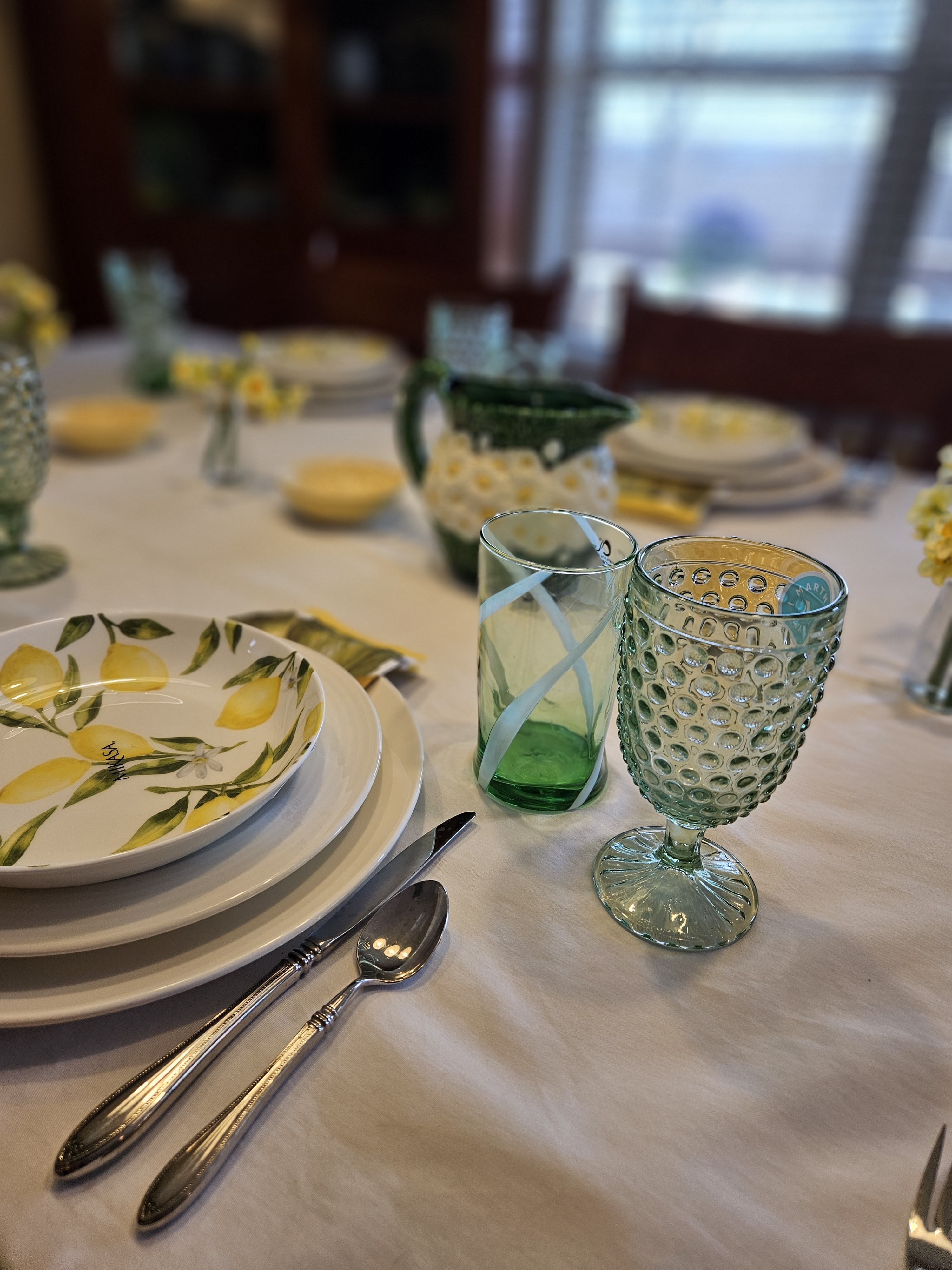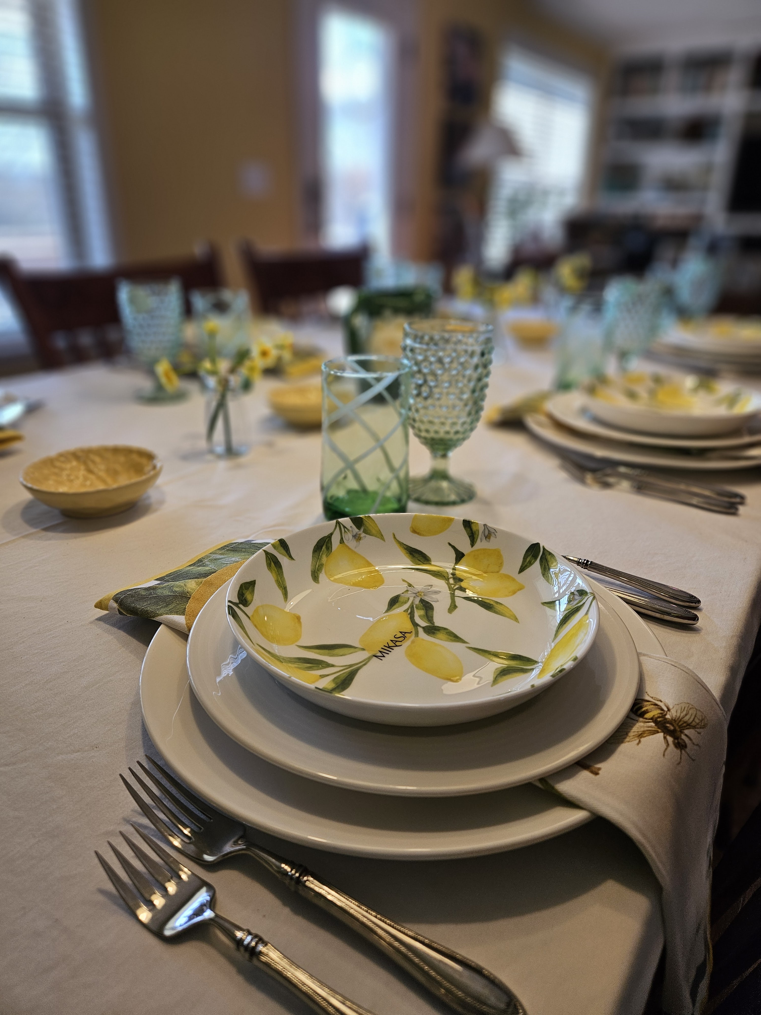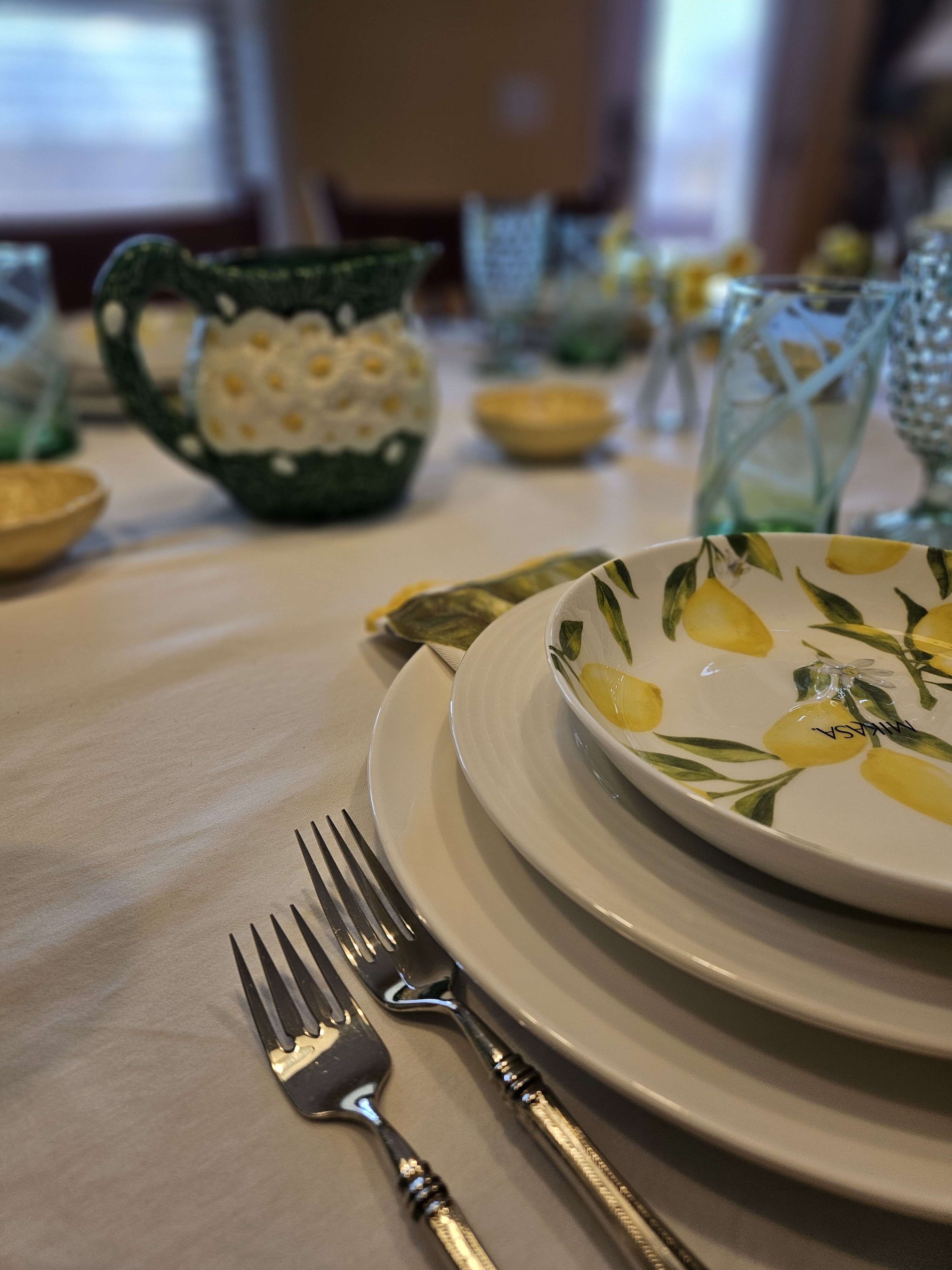 The place settings are my Wedgwood MaxaDura Service plates; Williams-Sonoma Lemon napkins; RAK buffet plates; Mikasa Lemons pasta bowls; Murano green glasses with white swirl; and Martha Stewart Chauncey Hobnail goblets.