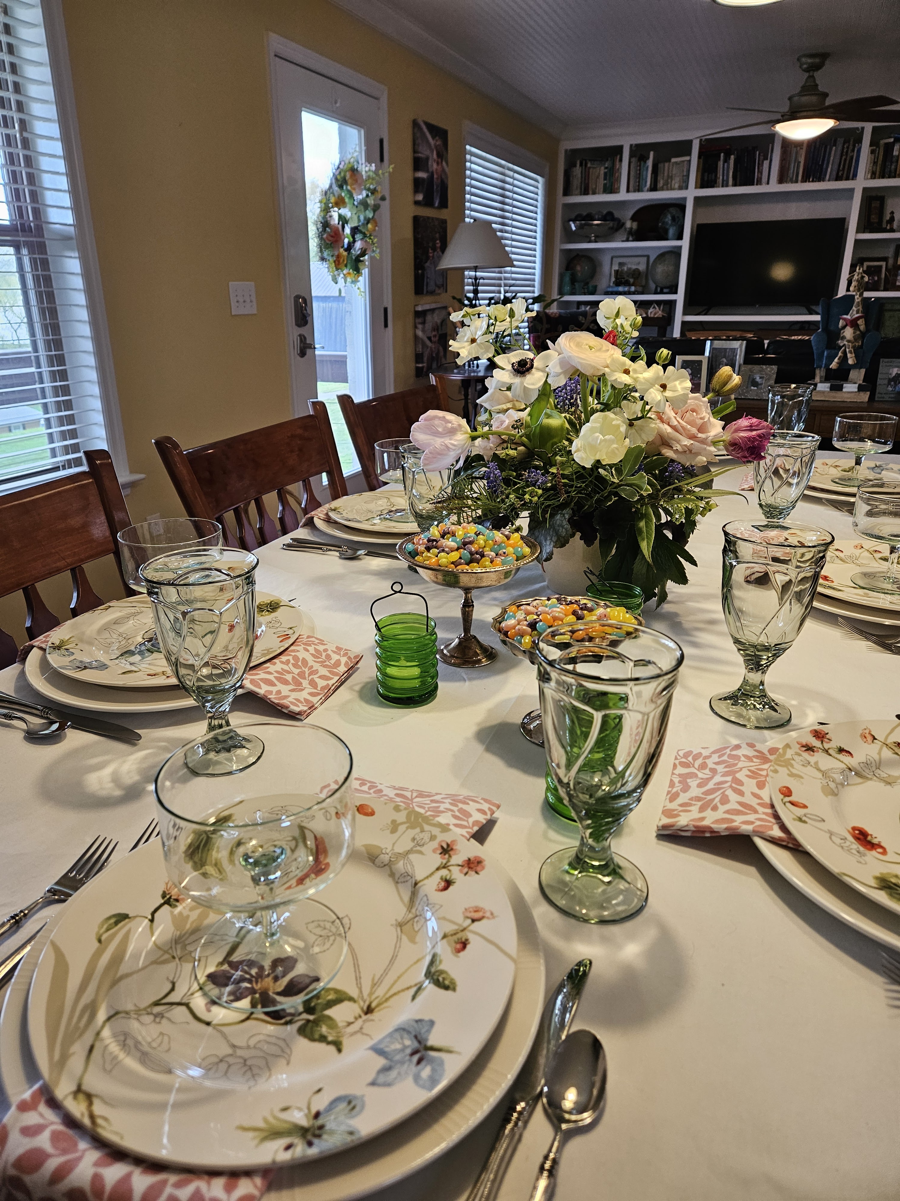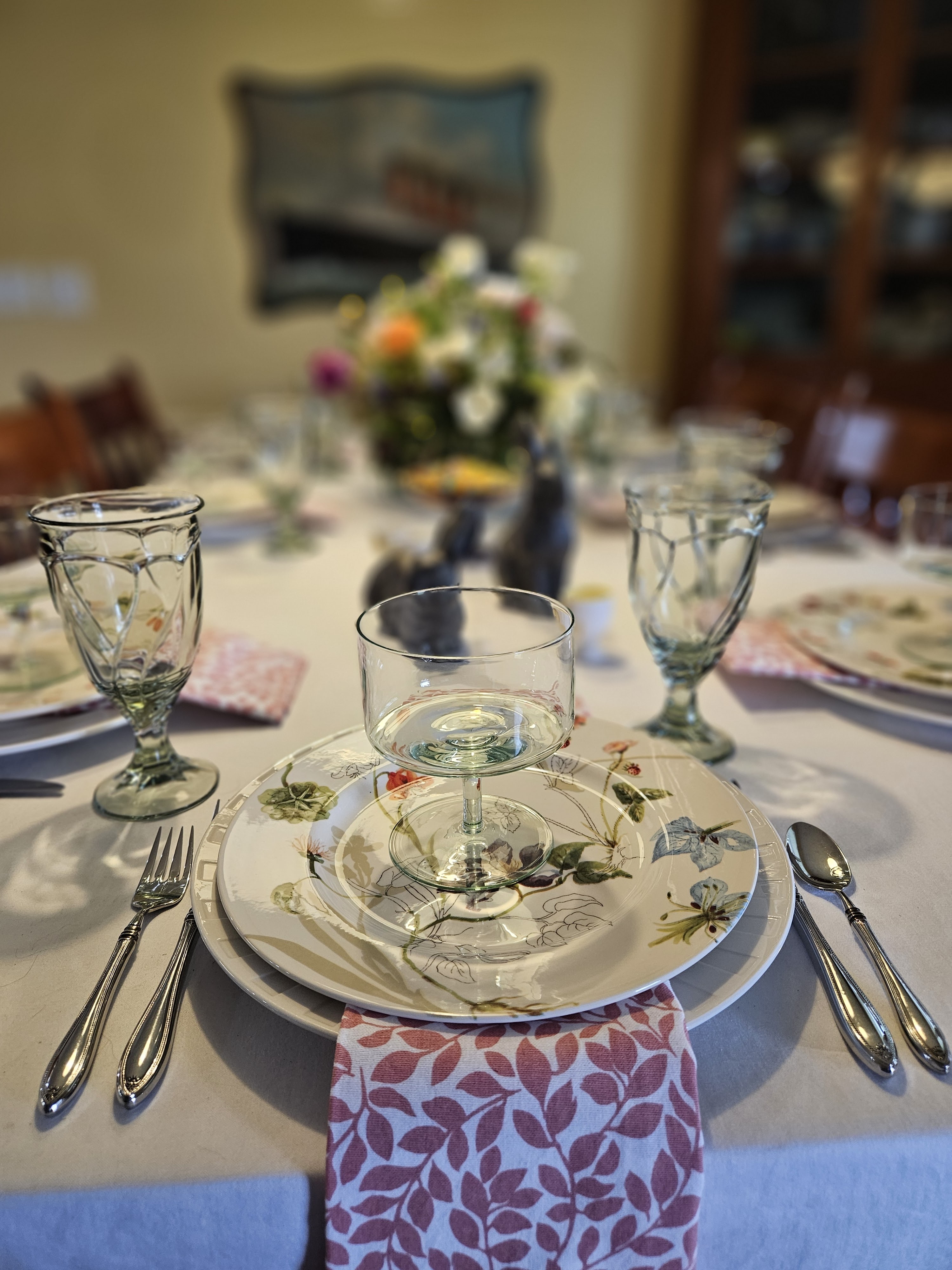 The place settings are the Wedgwood MaxaDura Service plates and 2 Oneida chop plates; the Royal Stafford Sketchbook dinner plates; green glass compotes; Noritake Sweet Swirl iced tea glasses; and some napkins from Williams-Sonoma.