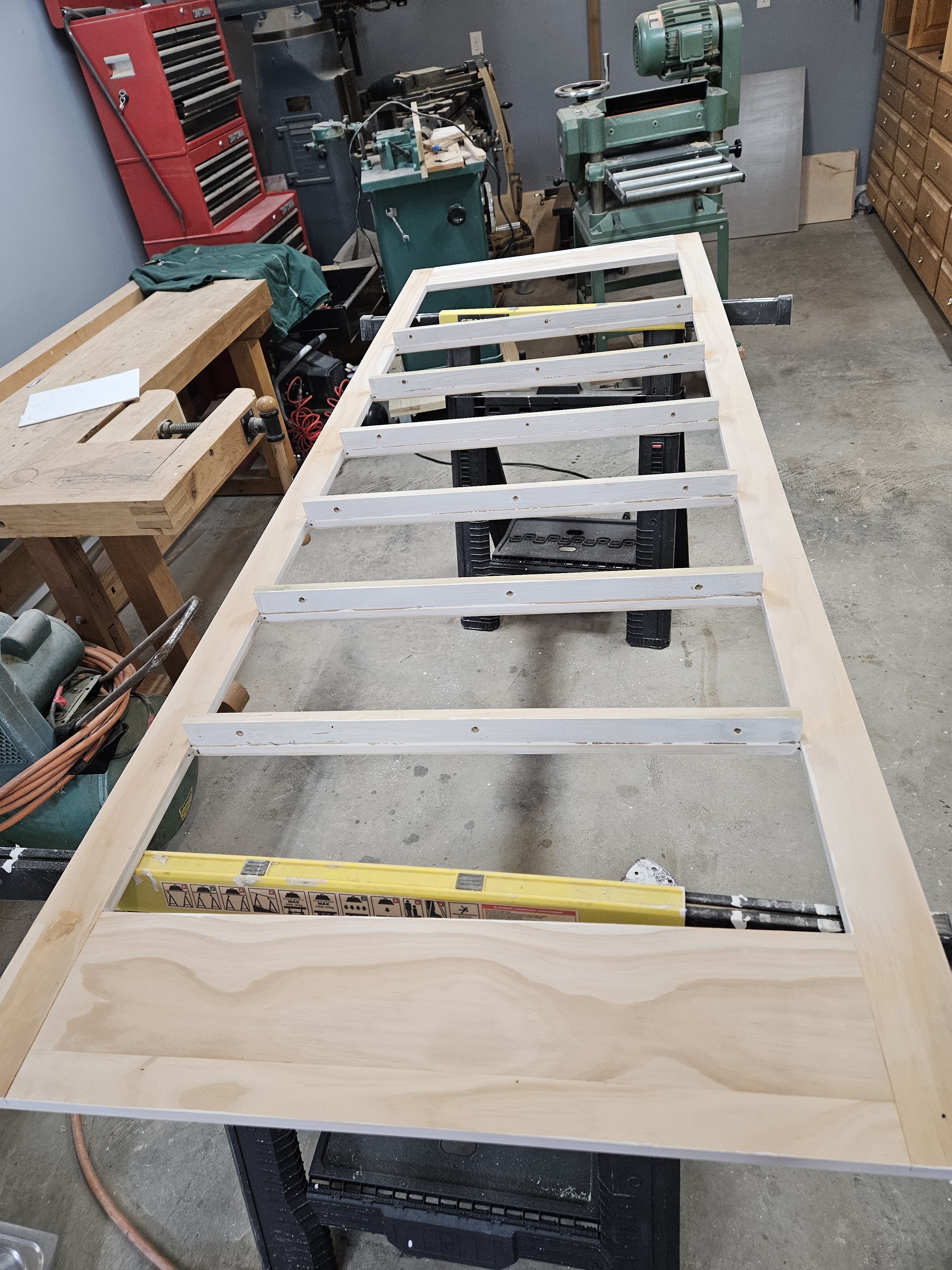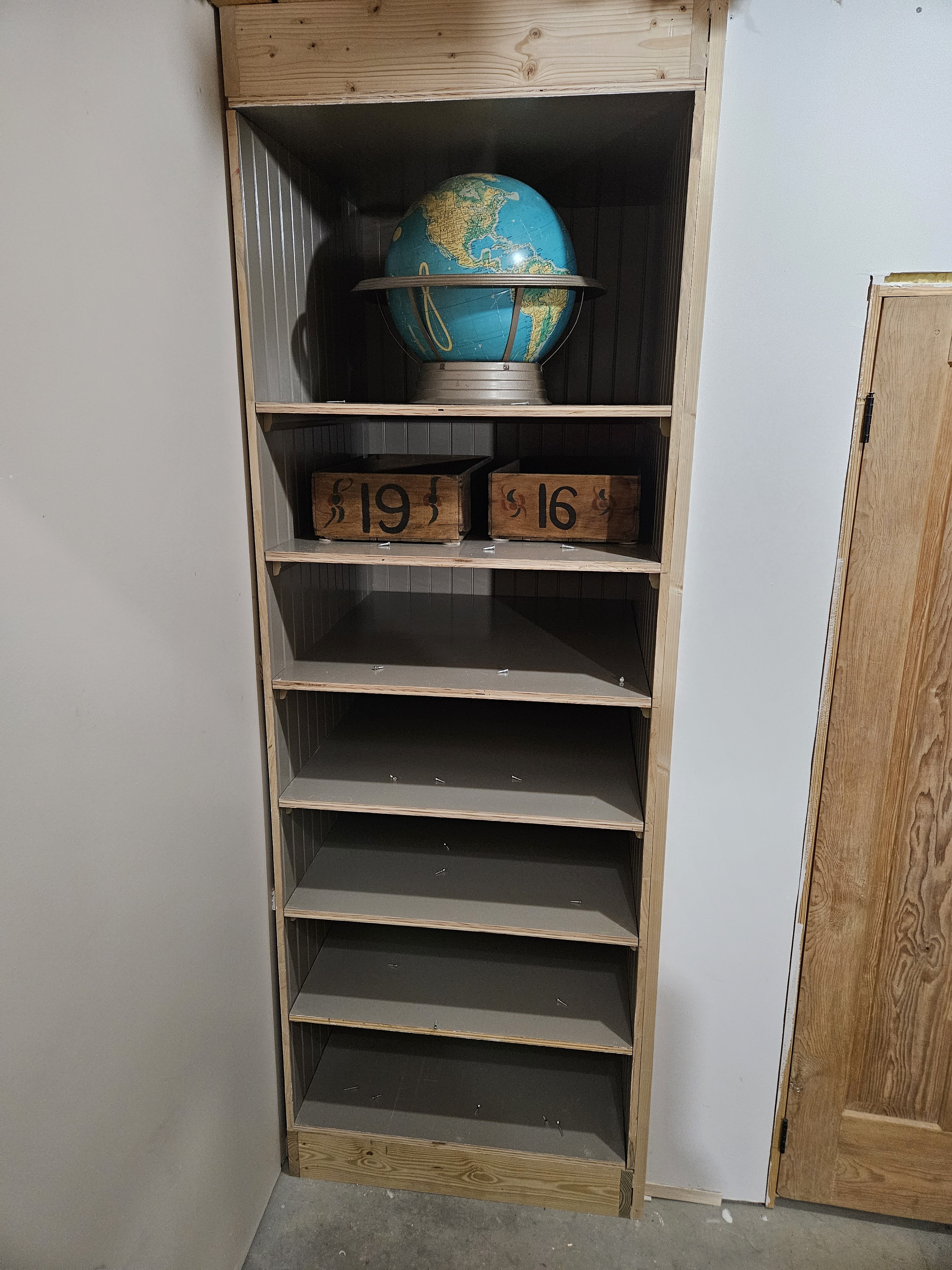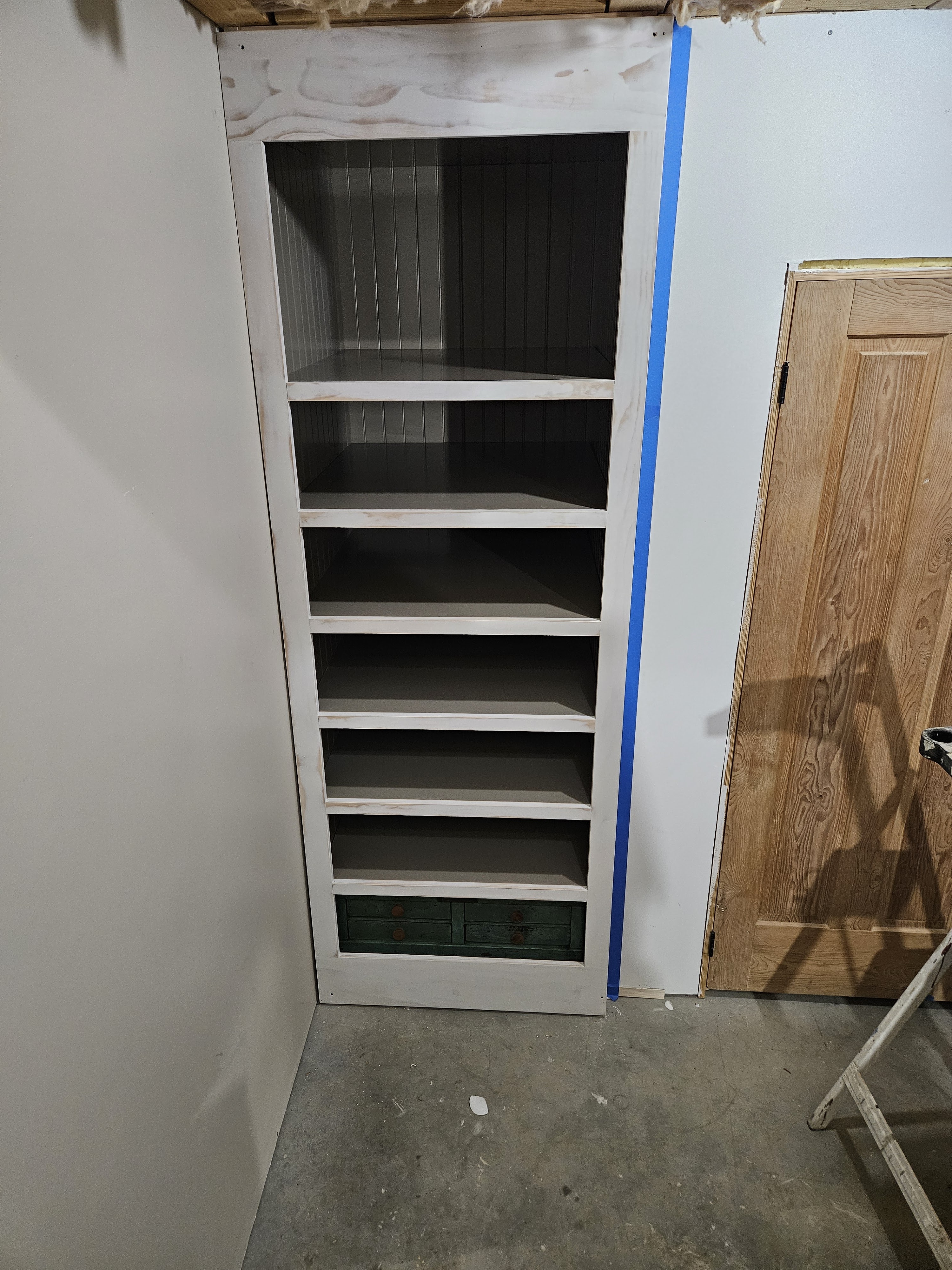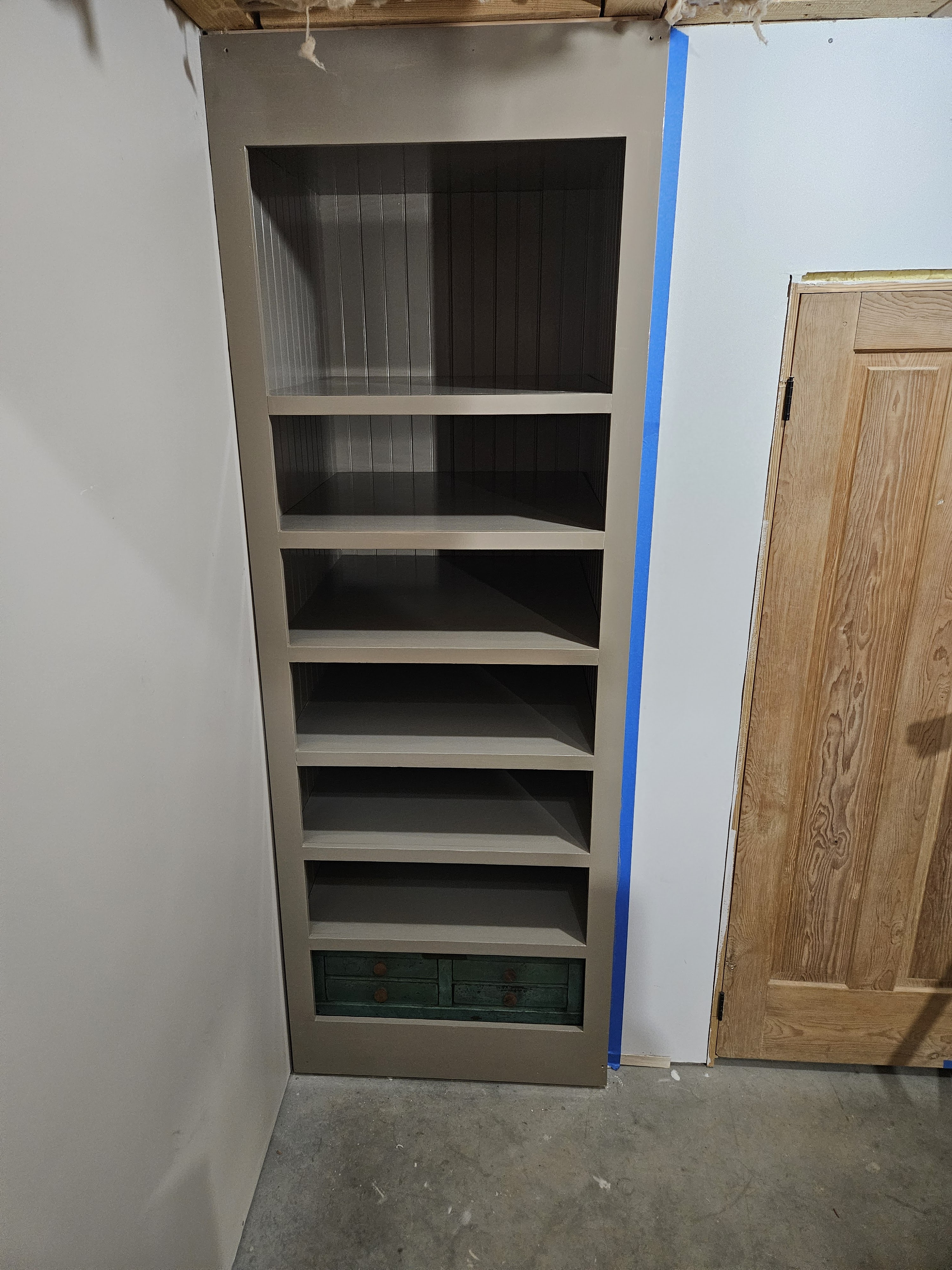 We had to put the green cabinet you see (actually the base from an old NCR cash register) on the shelf before we added the face frame because the opening is too small for it to fit through.