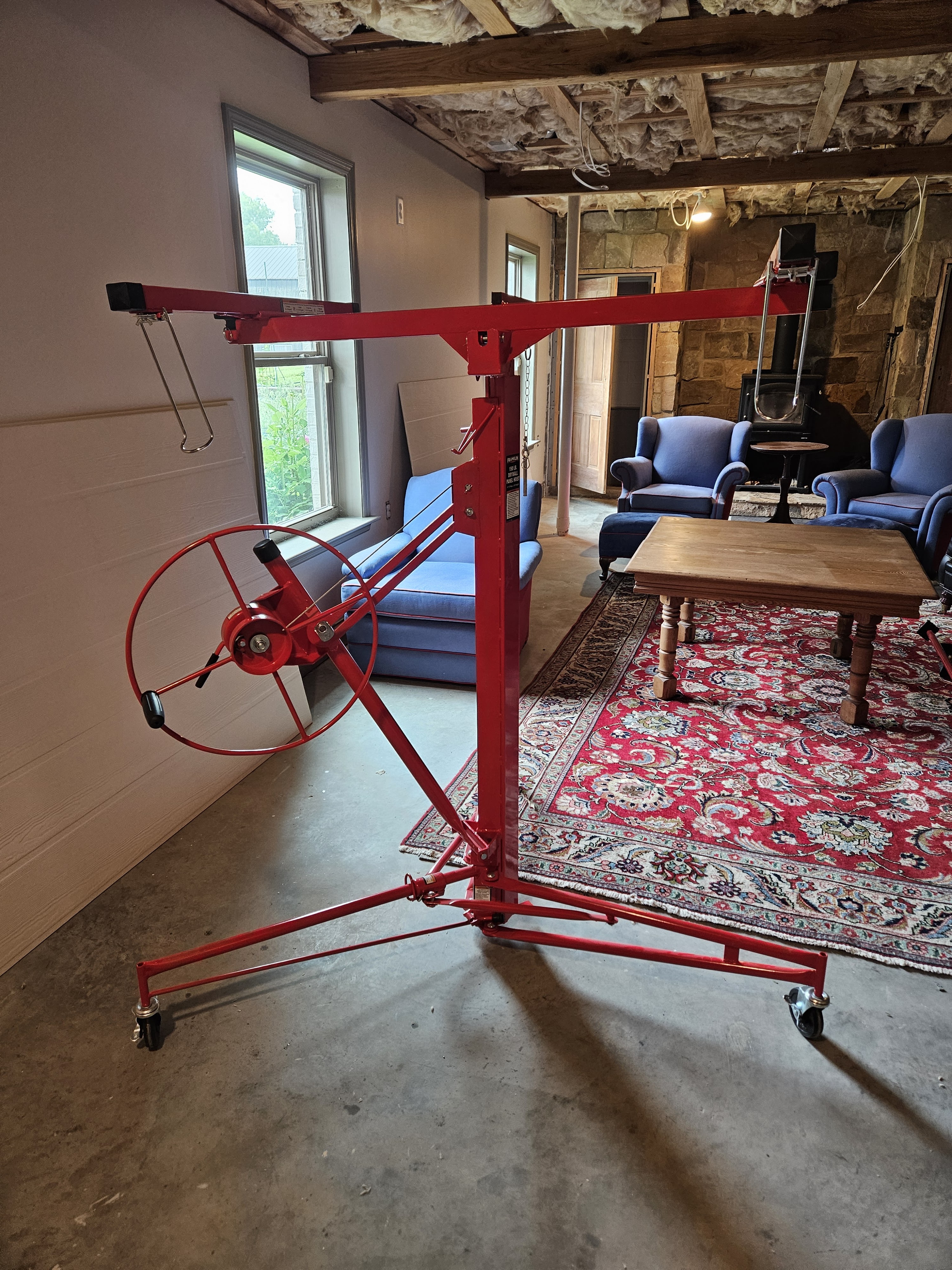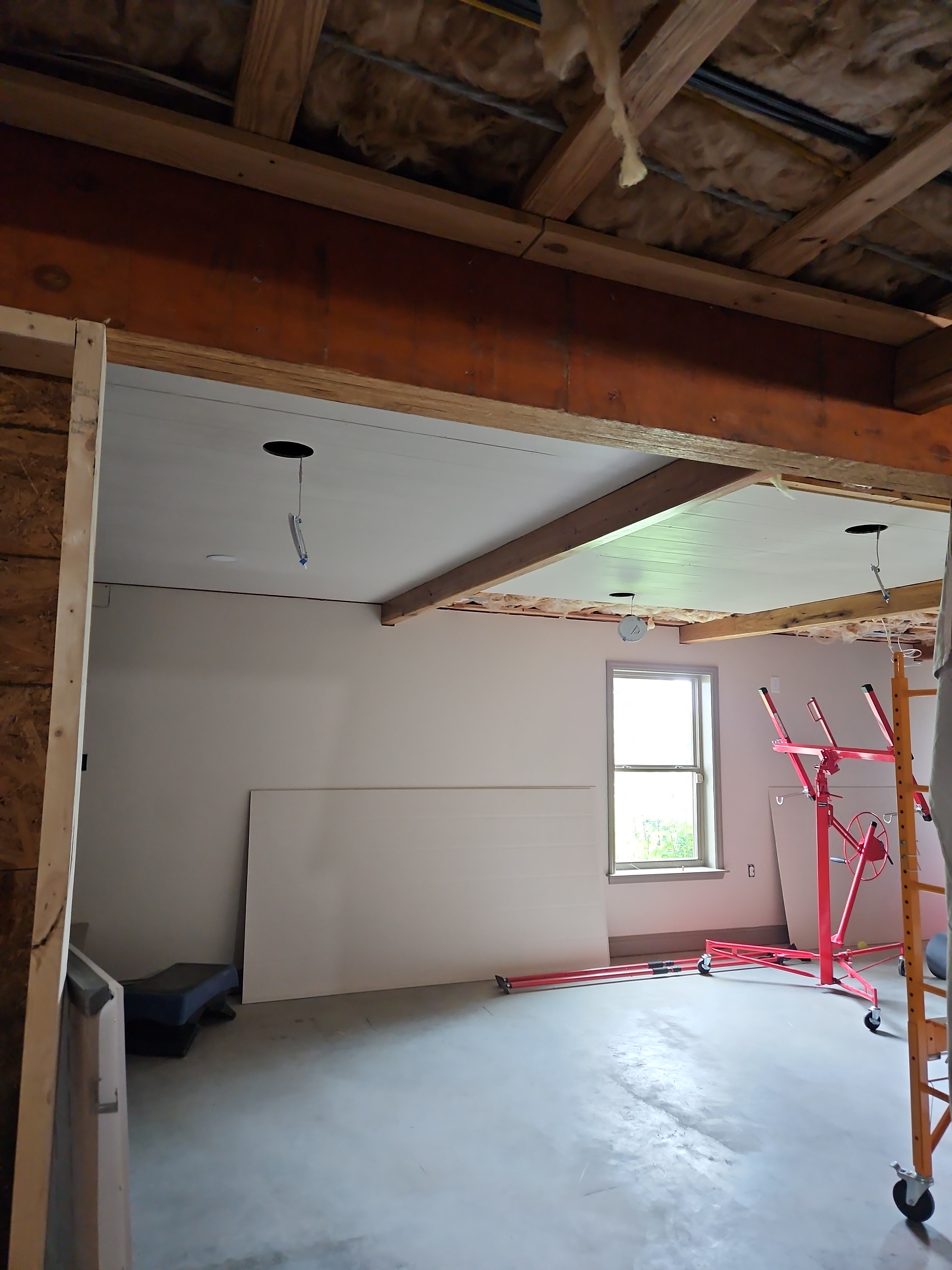 My husband bought a panel lifter to maneuver the sheets in place, and hold them in place while he fastened them to the ceiling. It’s a little janky, but it is a HUGE help because these sheets weigh a TON. I highly recommend one of these if you’re putting up drywall, or any sheet goods on the ceiling.