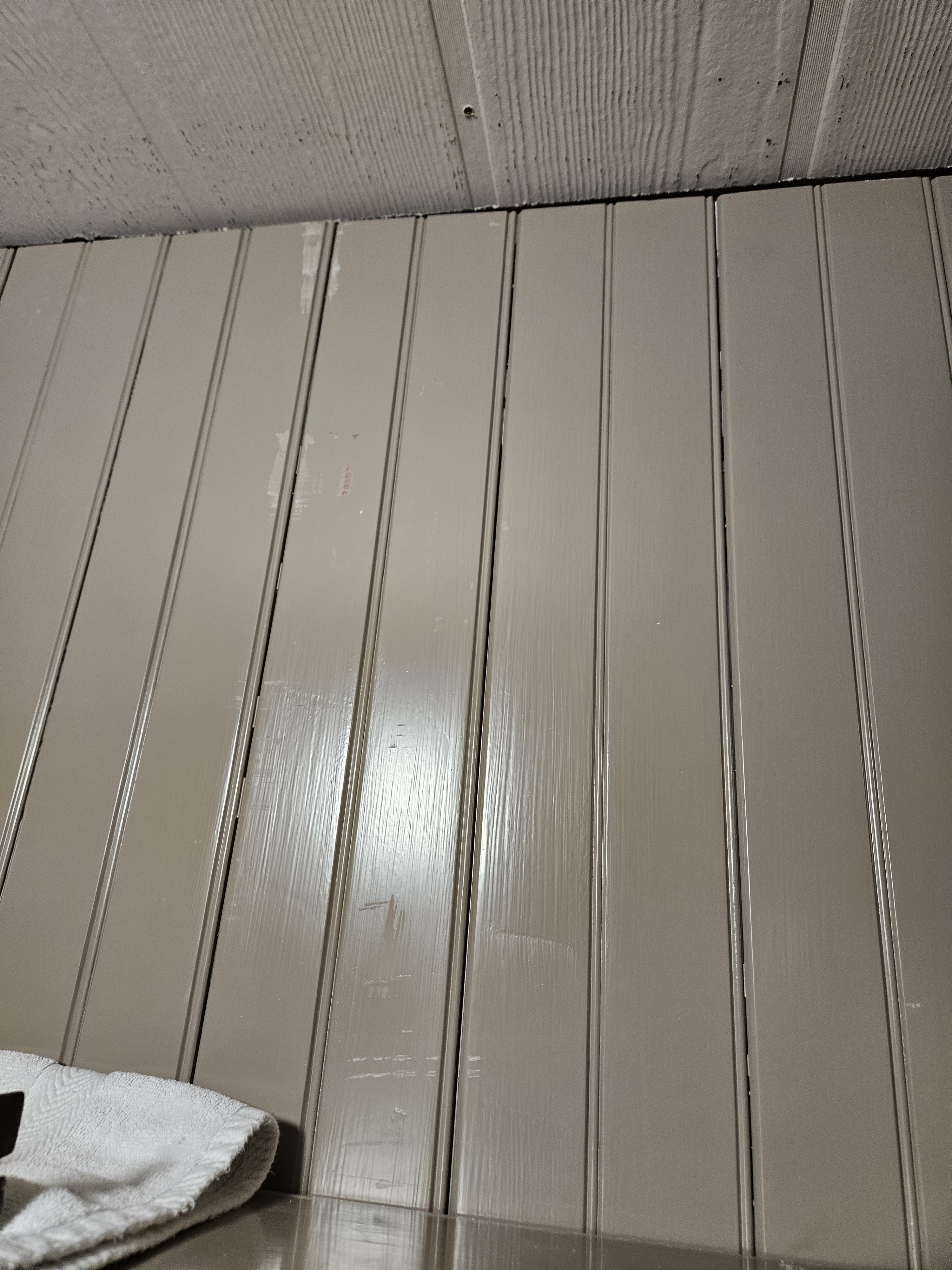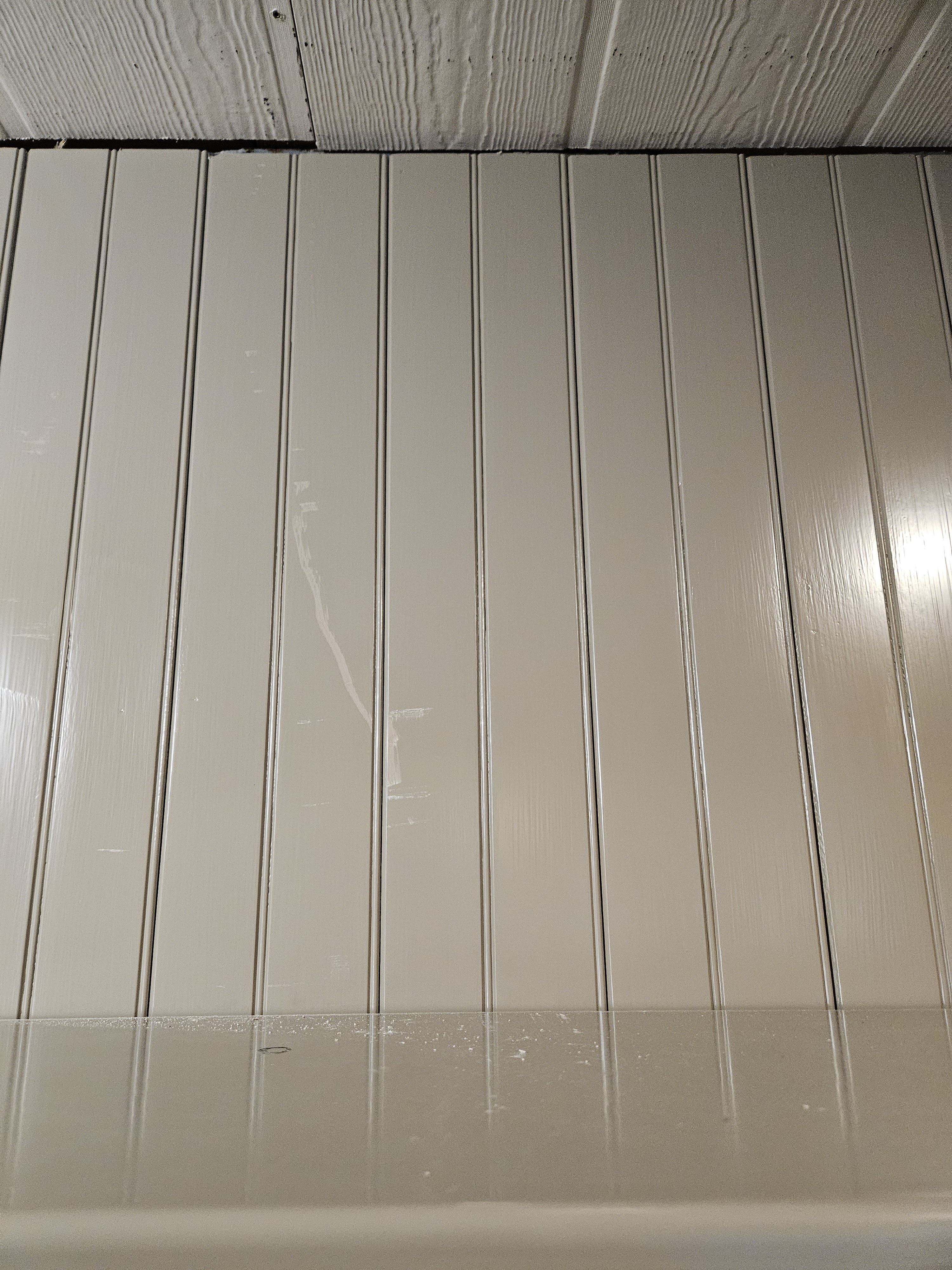 In retrospect, we shouldn’t have done the mudroom wall prior to putting up the ceiling, because it did end up getting kind of scraped up in the process. I will sand lightly and repaint. I will give the shelf a second coat of paint too while I am at it since it only has a single coat which isn’t really enough.