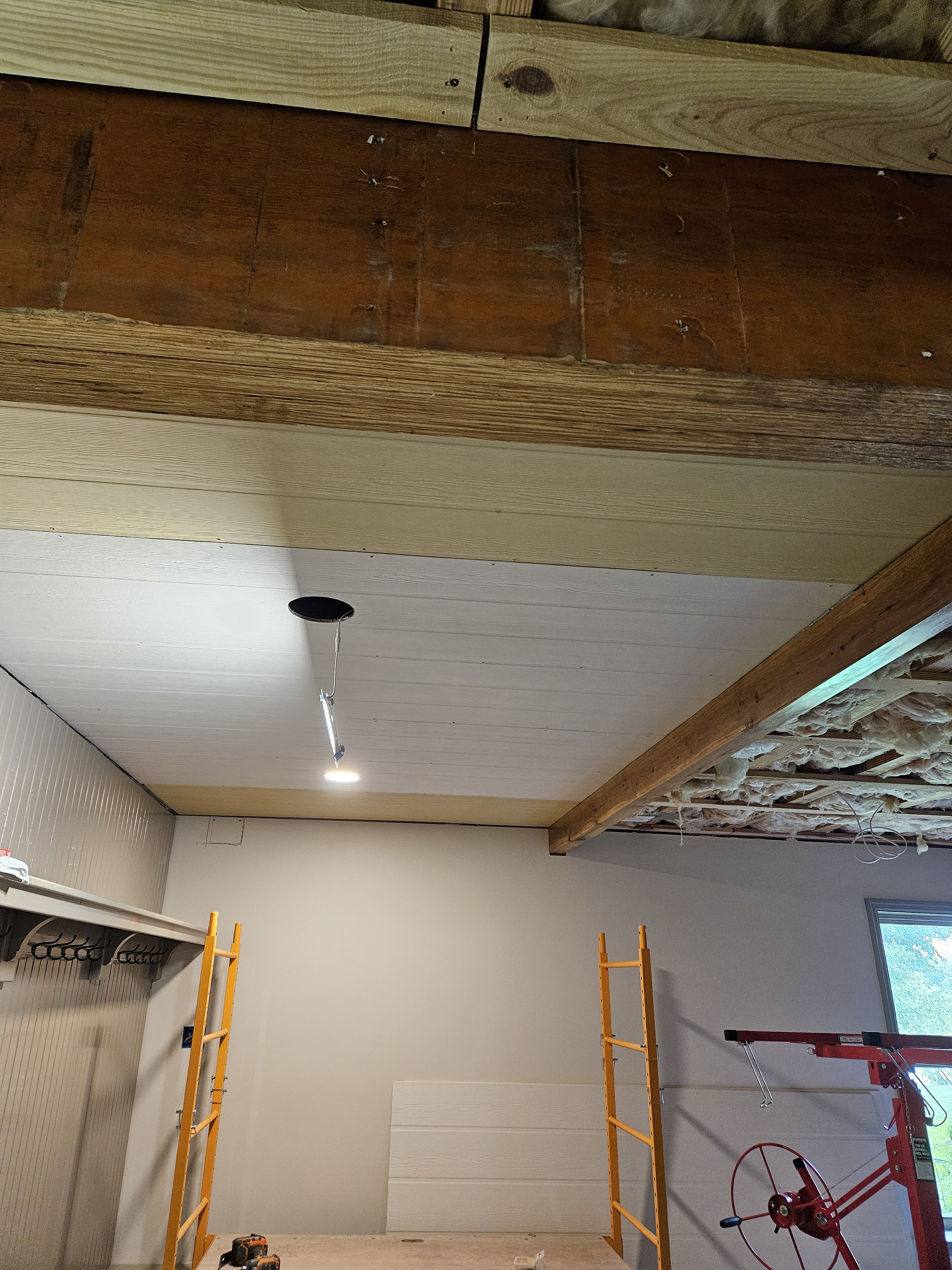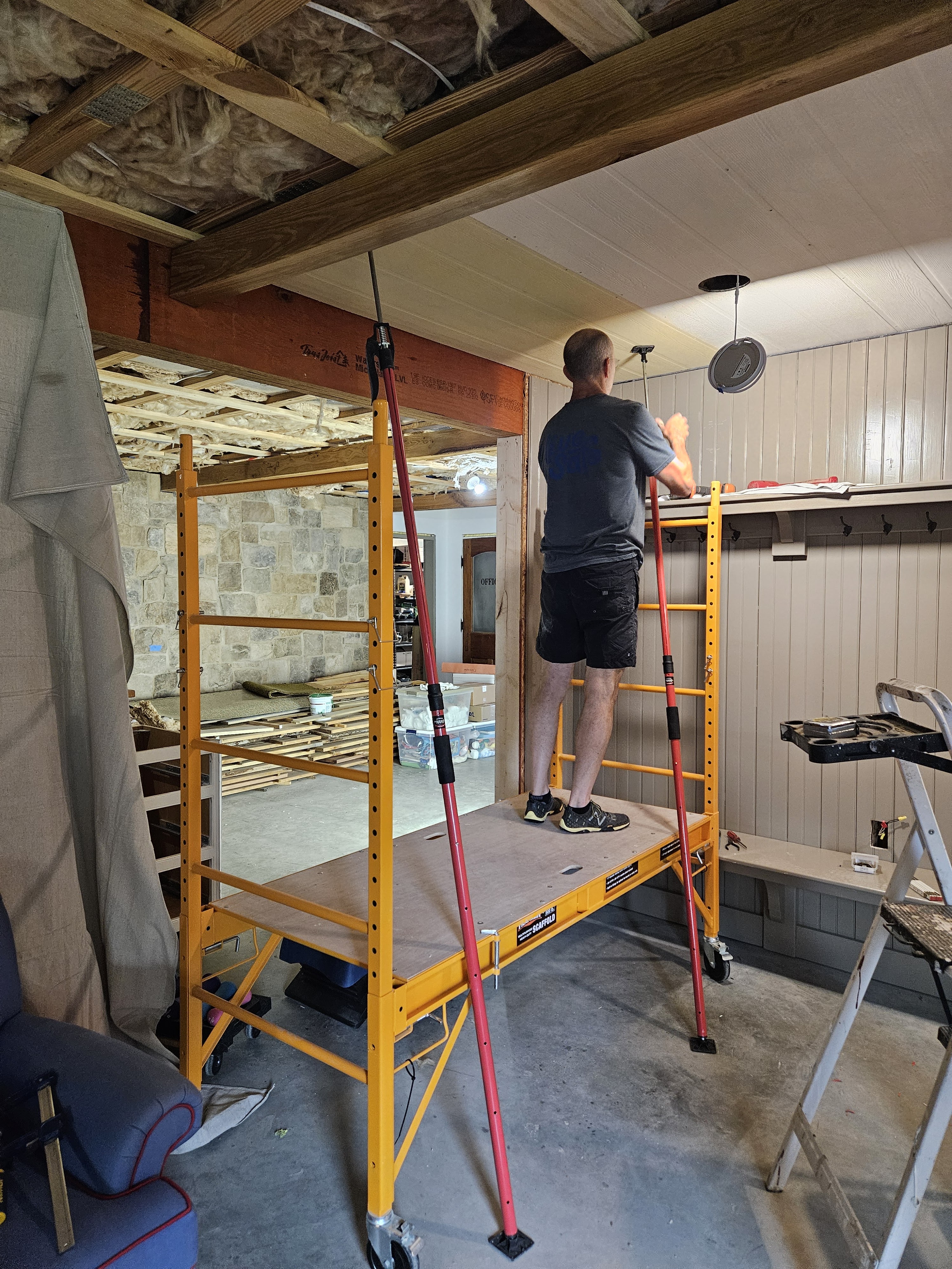 Part of the challenge is that we are tucking the short ends between the tops of the beams and the floor joists, and this stuff doesn’t really bend much. When we started on the first section, my husband was standing on a step ladder, while I manned the panel lifter and the adjustable poles that held things in place while they were being maneuvered and secured. Then we got smart and pulled out the rolling scaffold, which, again, I highly recommend if you’re doing a bunch of renovation work–painting a ceiling, putting up moldings, working on the ceiling, etc.