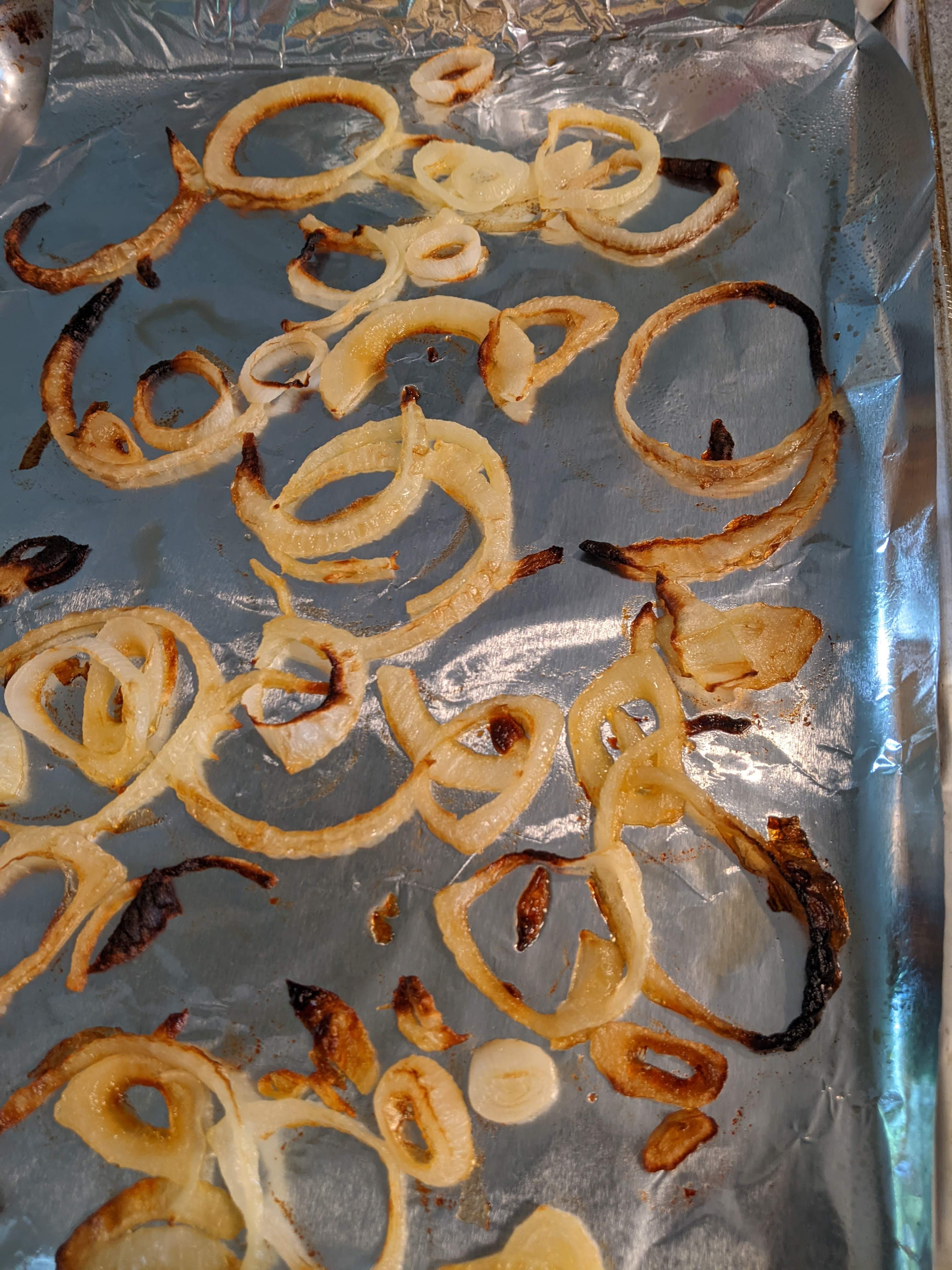 I sliced an onion into about 1/8″ thick slices and then broke them into rings and put about a tablespoon of oil on them and broiled them on a foil lined cookie sheet until brown.