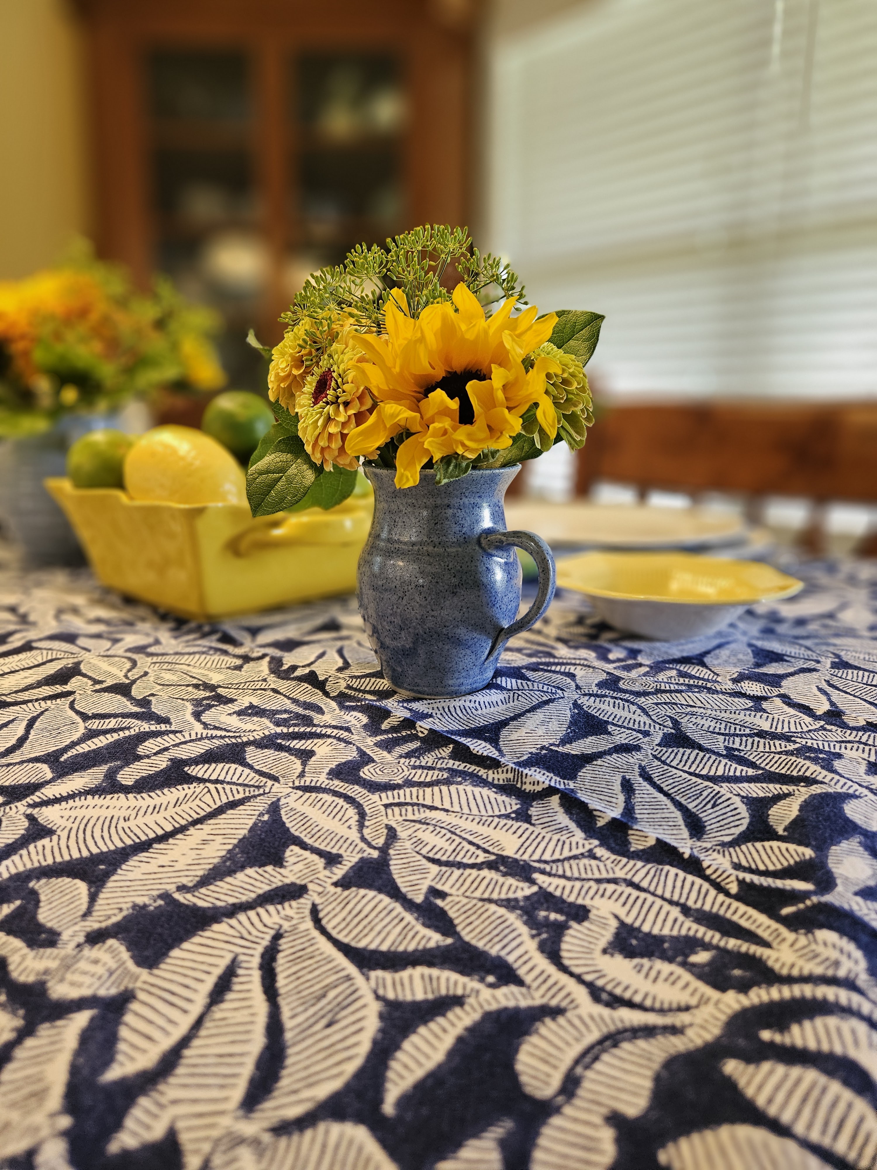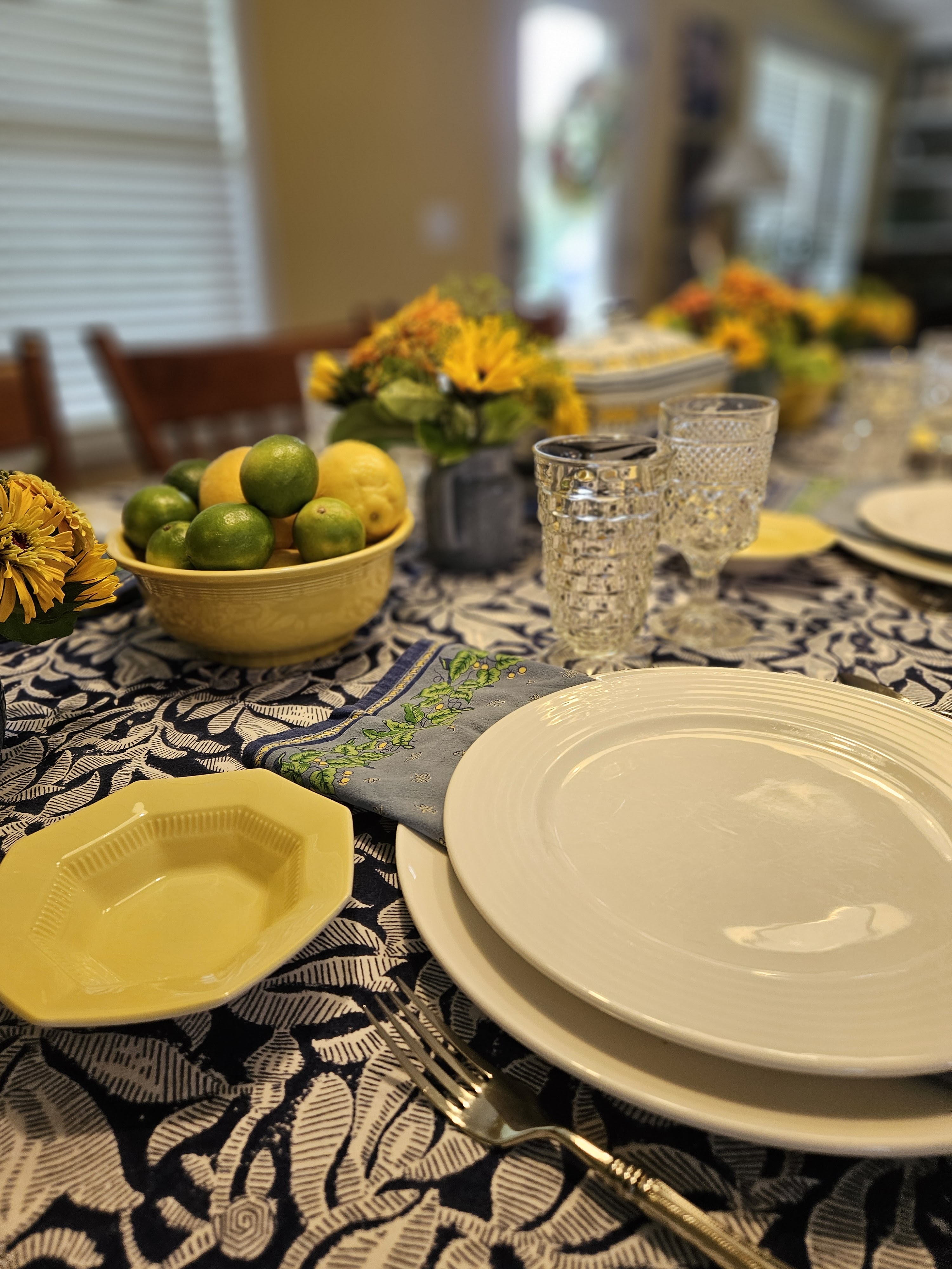 This is a FUN table. I started with a navy blue and white tablecloth. I used my really neat yellow, blue, white, porcelain server; blue pitchers with sunflowers, lemon leaf, zinnias, and dill; and yellow bowls of lemons and limes.