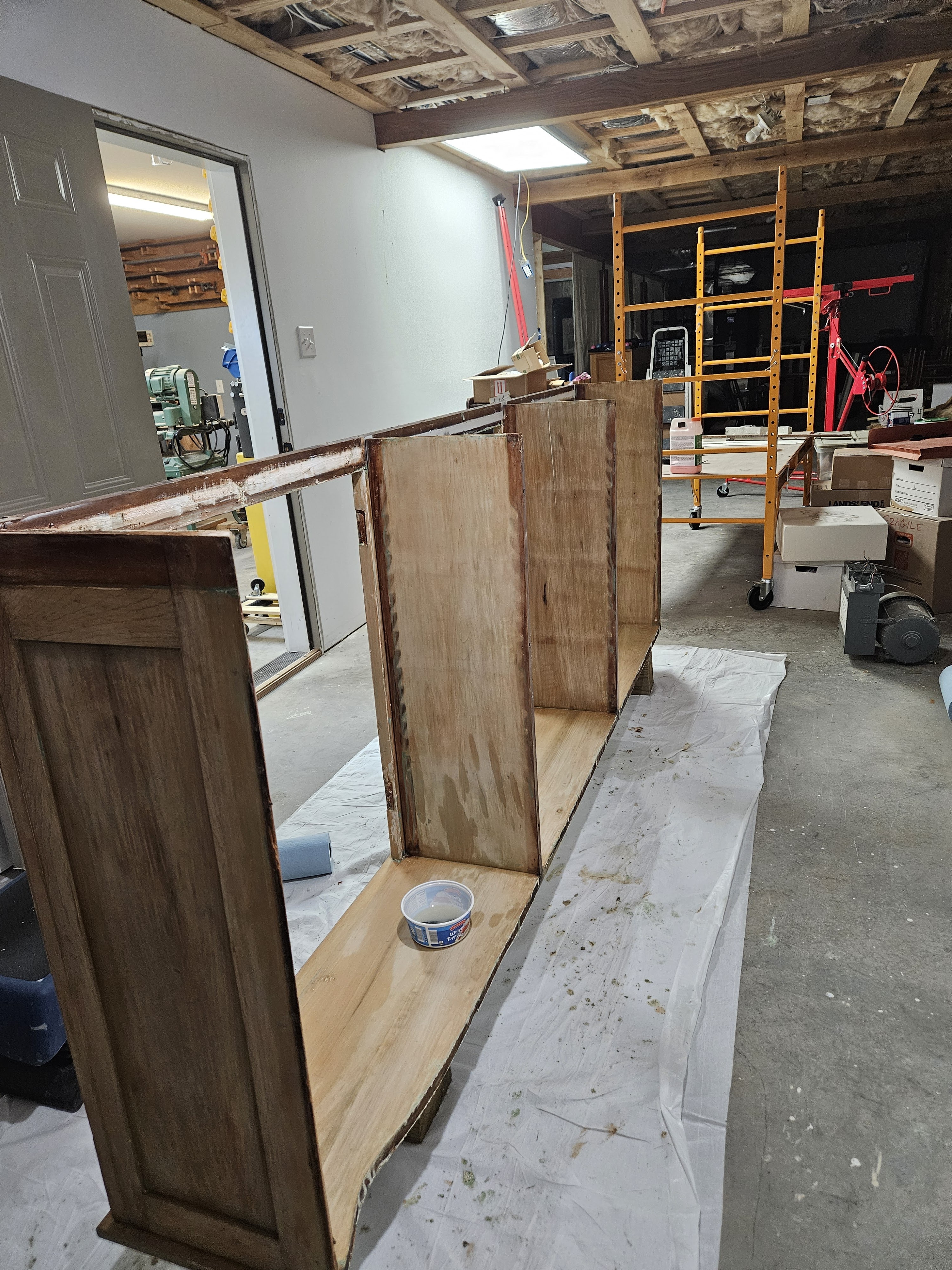 We will have to test fit the doors before we finalize everything to ensure that the openings are square and plumb. We won’t install the doors for good until we get all the bracketry installed and the shelves. I’m expecting to get those back around the beginning of September. Once I have those back, I’ll sand everything well and prime it and paint it before we install them so that we don’t have the goopy mess that they made when they painted the insides of the cabinets with them installed.