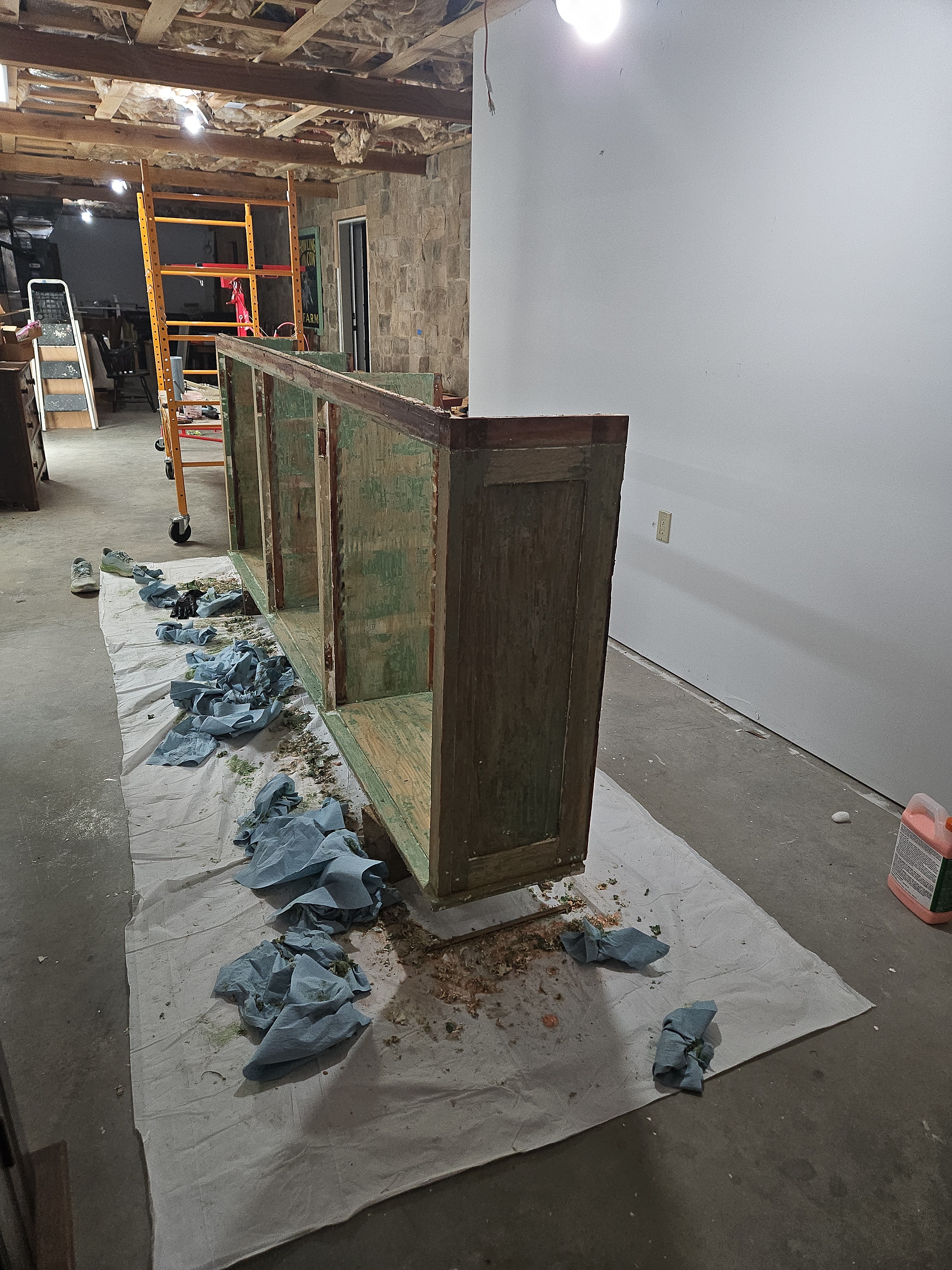 I had my husband help me move the shelf, so that we could put down a new drop cloth because the one I was using was completely trashed. I put another coat of stripper and plastic on it and scraped it again with my handy little detail scraper. I also scrubbed with a little detail brush and mineral spirits and wiped that off with shop towels. And here’s how it looked after that.