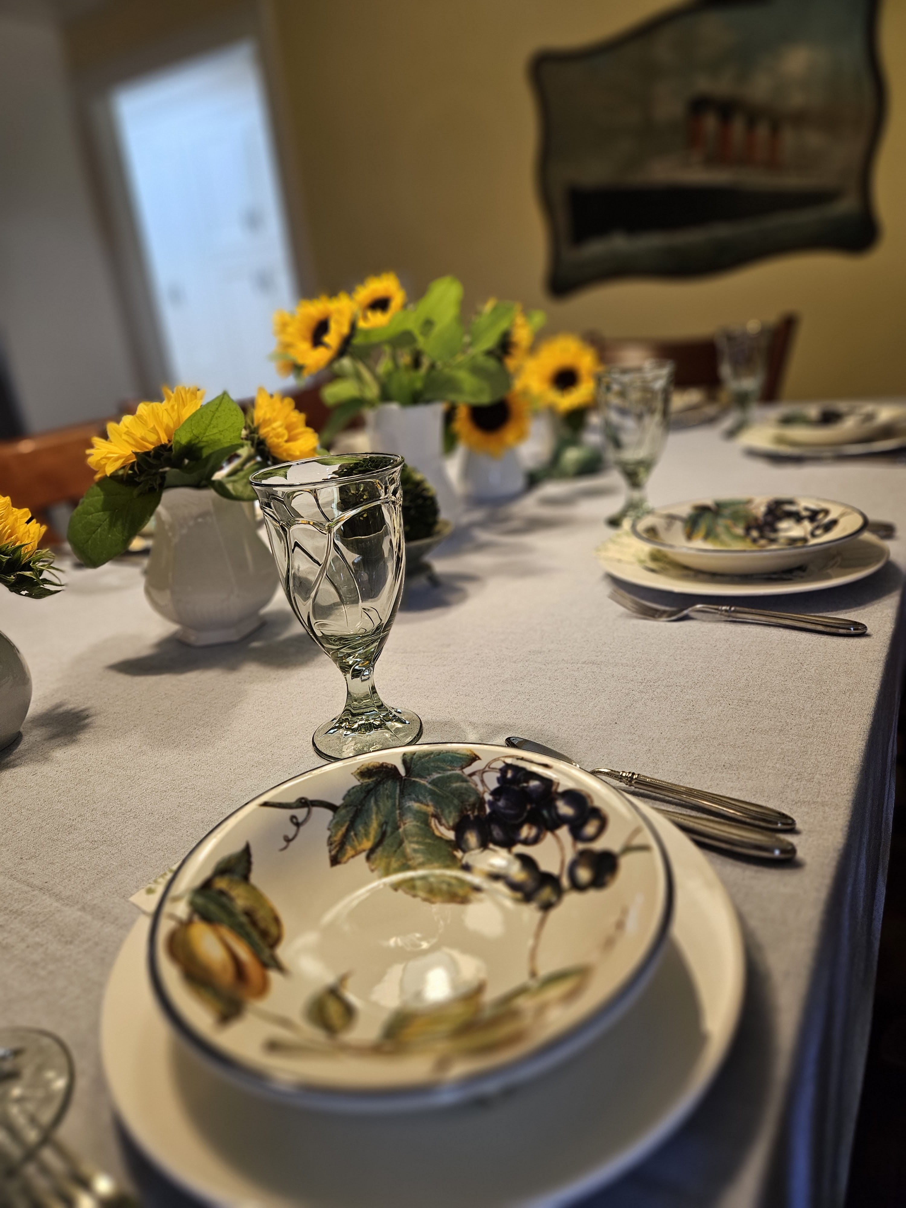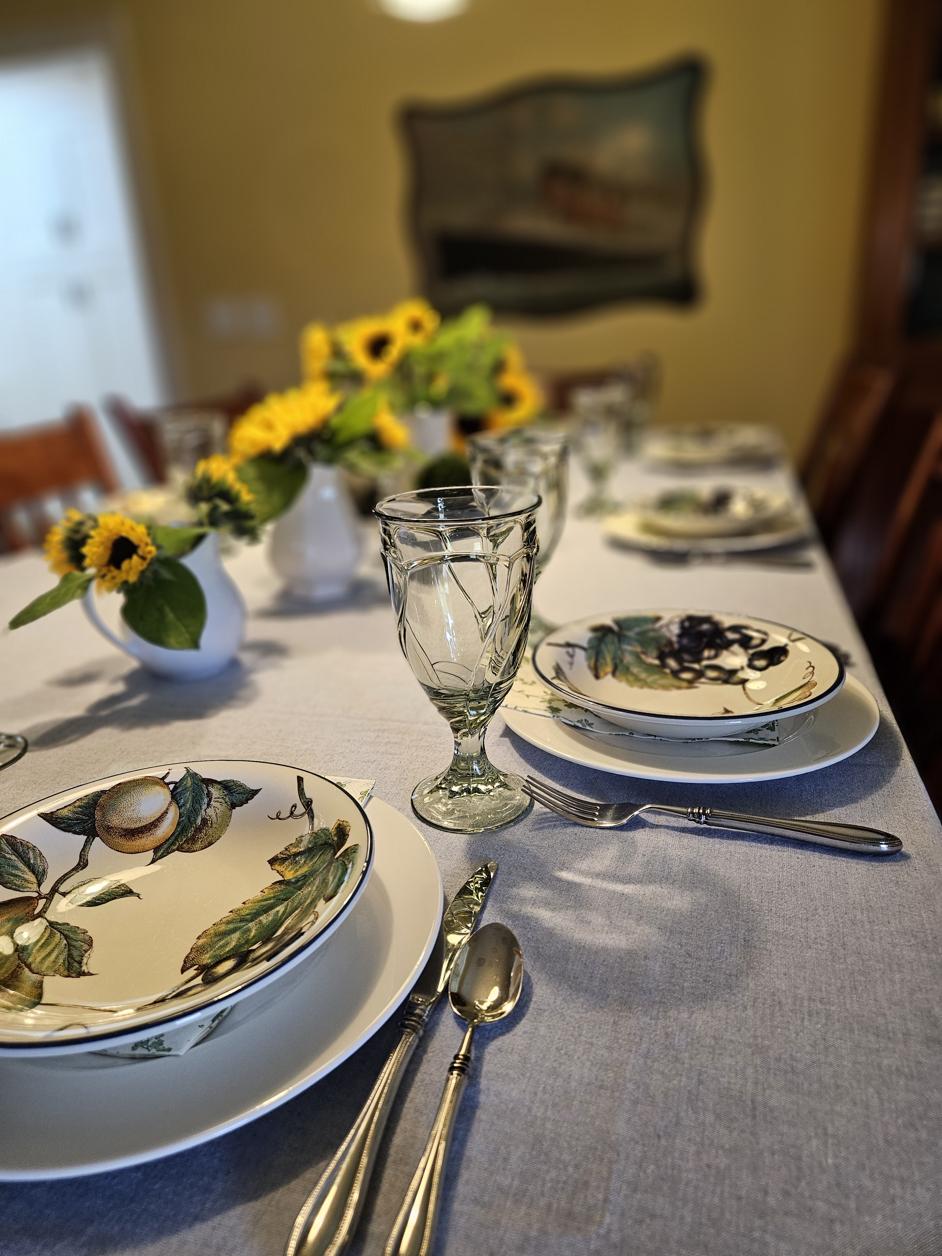 My brother and his family visited with us last week from Germany. I ordered a bunch of sunflowers from Costco and I bought some Lemon Leaf from the grocery. For this table, I did my plain rimmed Villeroy and Boch dinner plates, and paper napkin with a leafy design and Pier One MacIntosh bowls for the salad. The glasses are Sweet Swirl by Noritake. These wear like iron if you ever need to replace some glasses and they come in all the different shapes and size and a big selection of colors.