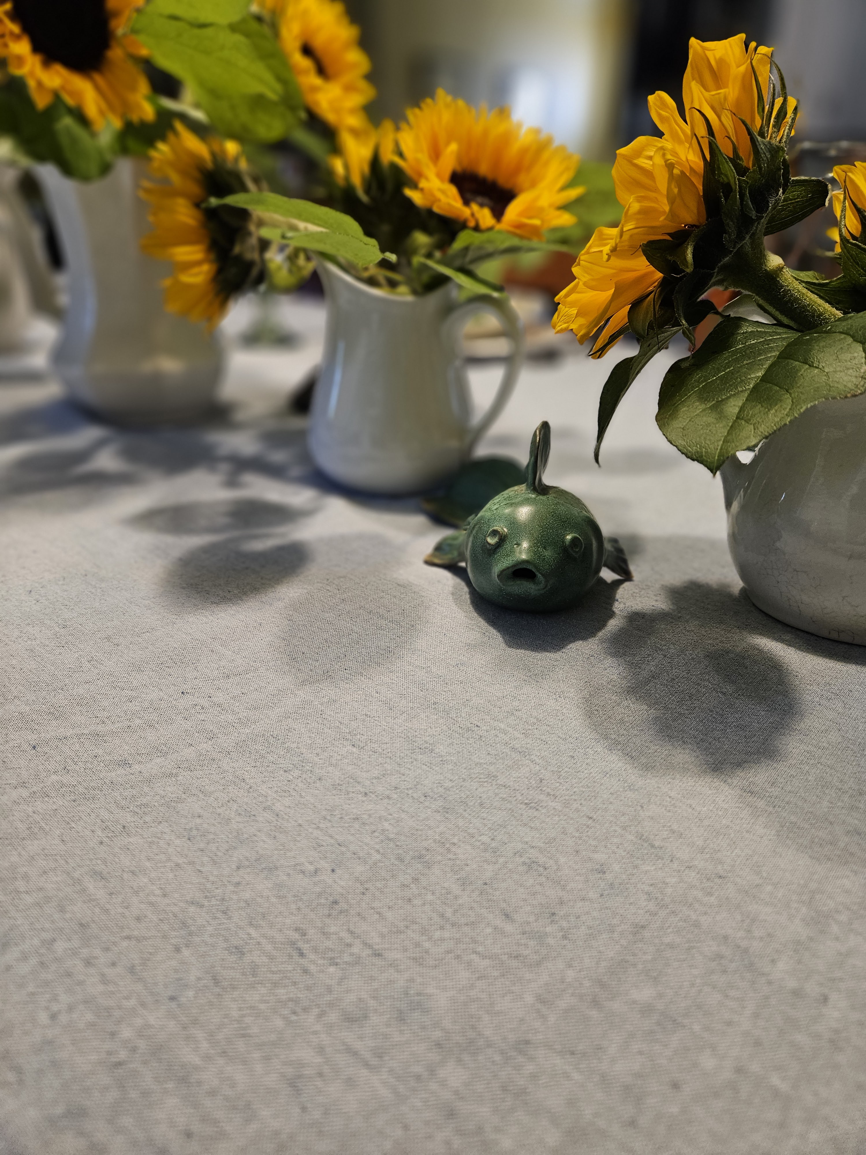 For the centerpiece, I put sunflowers in white pitchers and had a little greenery ball in a green dish, a ceramic fish (I have to be so careful with him because he is FRAGILE), and a metal frog.