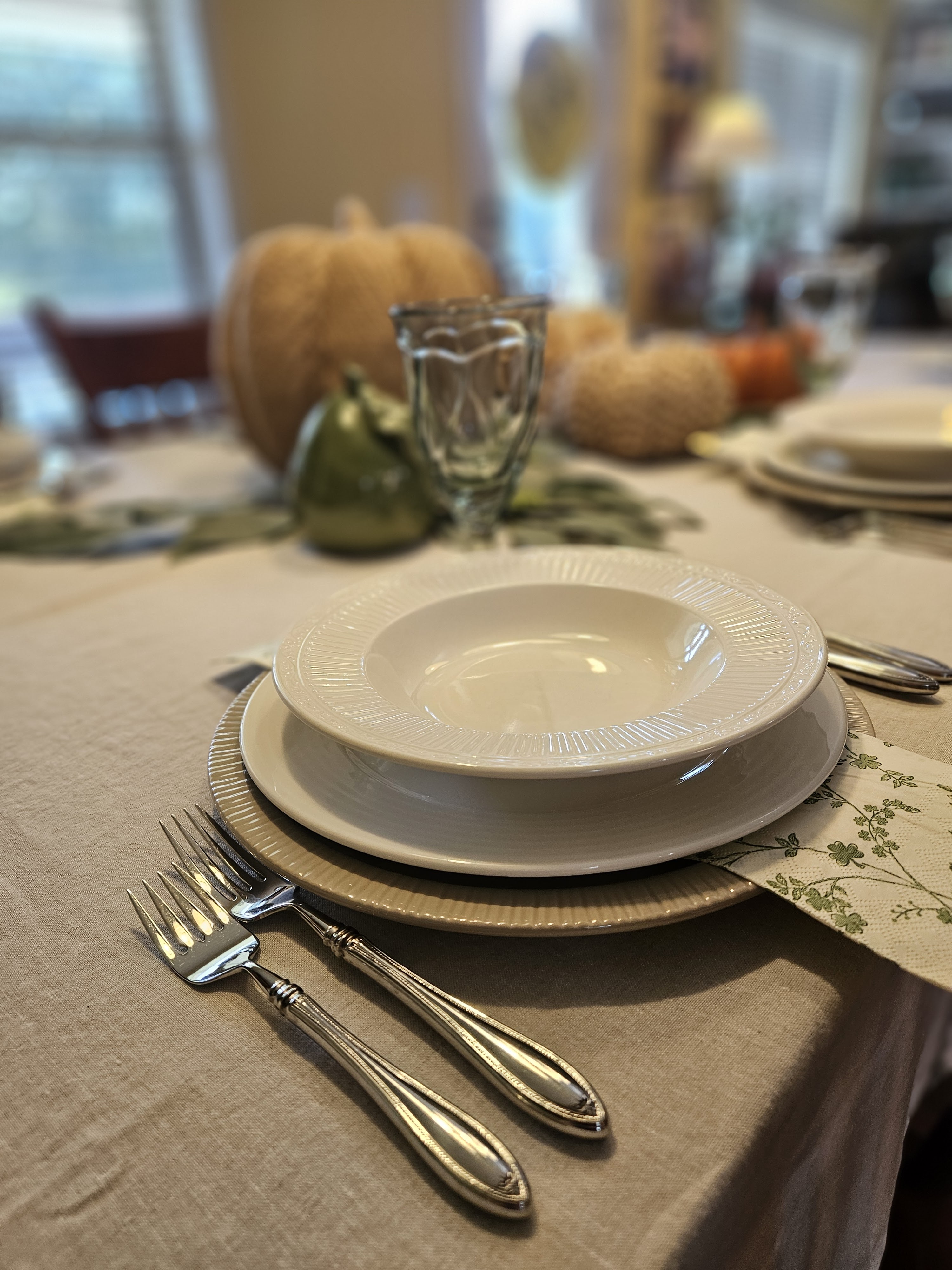 I used Ballard design plates as the base. I am pretty sure that these are dinner plates, but they are large enough to use as service plates. They I used some buffet plates by RAK and Mikasa Italian Countryside rimmed soup/salad/pasta bowl. I wanted to pull in a color, and the pumpkin and the pear have some green, so I used some paper napkins with a green leafy pattern. I also used my green Noritake Sweet Swirl iced tea glasses.