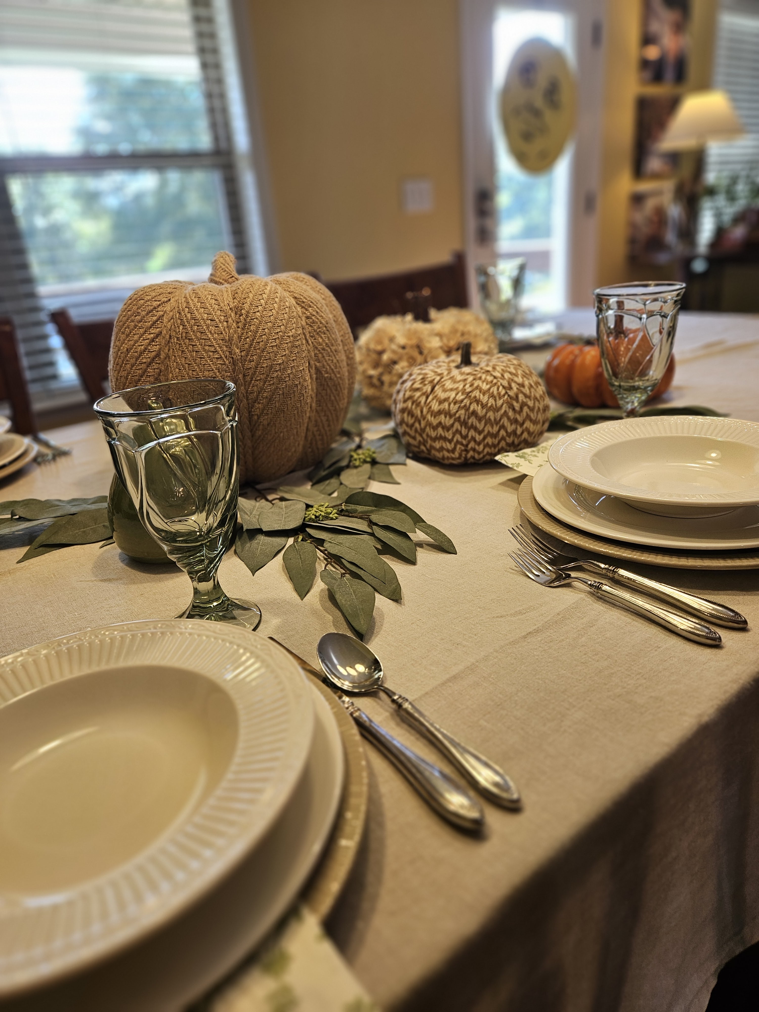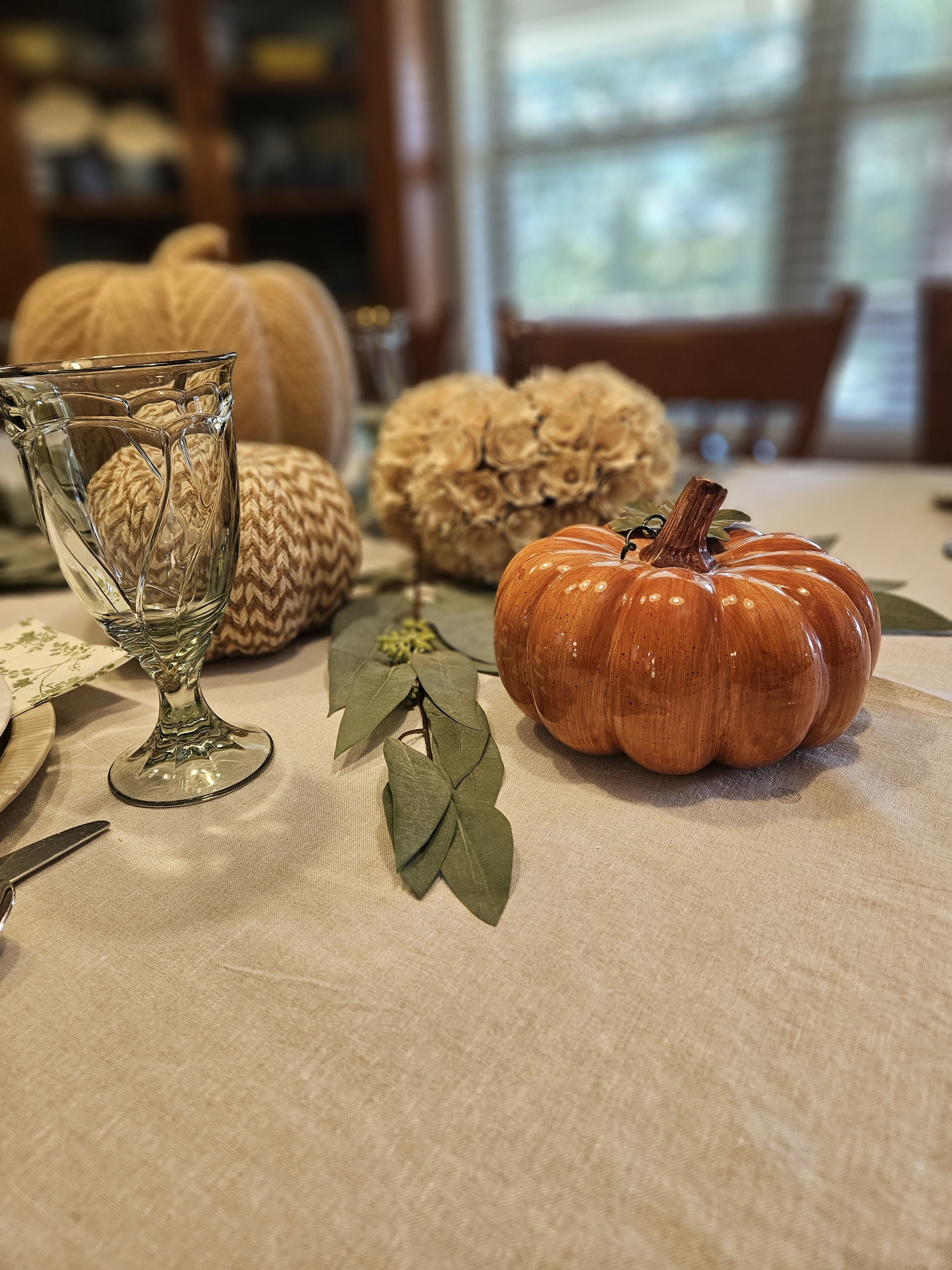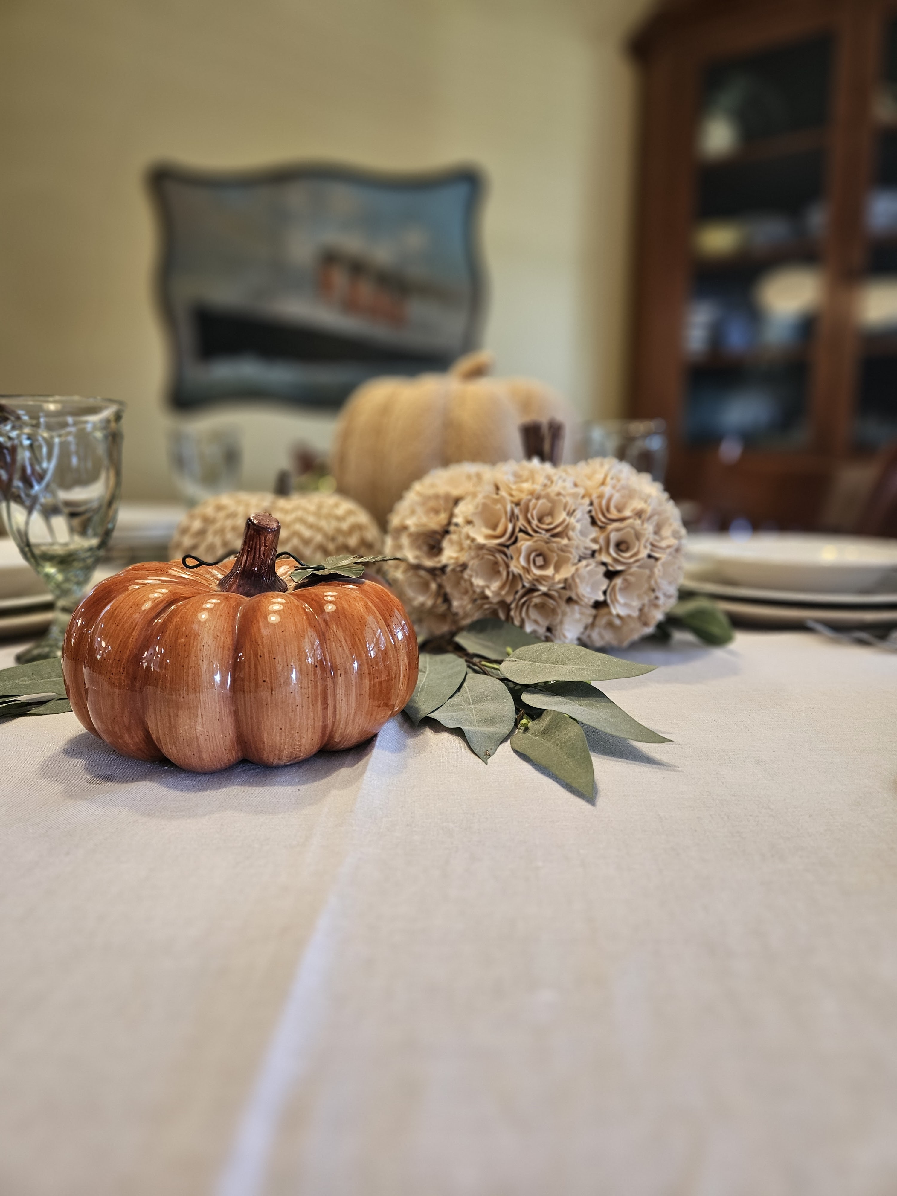 I have found some neat fall decor at the thrift store and I have a great natural linen tablecloth that I bought from Williams-Sonoma. (I have a wide table (42″) and it’s difficult to find cloths wide enough most places.) I also have some really cool neutral dishes that I have found at various thrift stores over the years. So, I put all of it together.