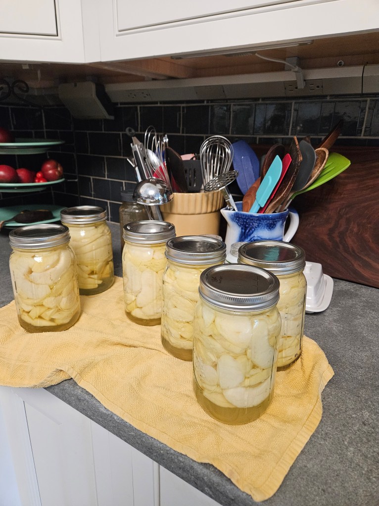 Pack them into hot jars leaving 1/2″ headspace. Add the syrup leaving 1/2″ headspace and remove any bubbles with a thin spatula. Wipe the rims and screw on lids and rings until they are finger tight. Process them in a hot water canner for 20 minutes–same amount of time for quarts and for pints. I did quarts.