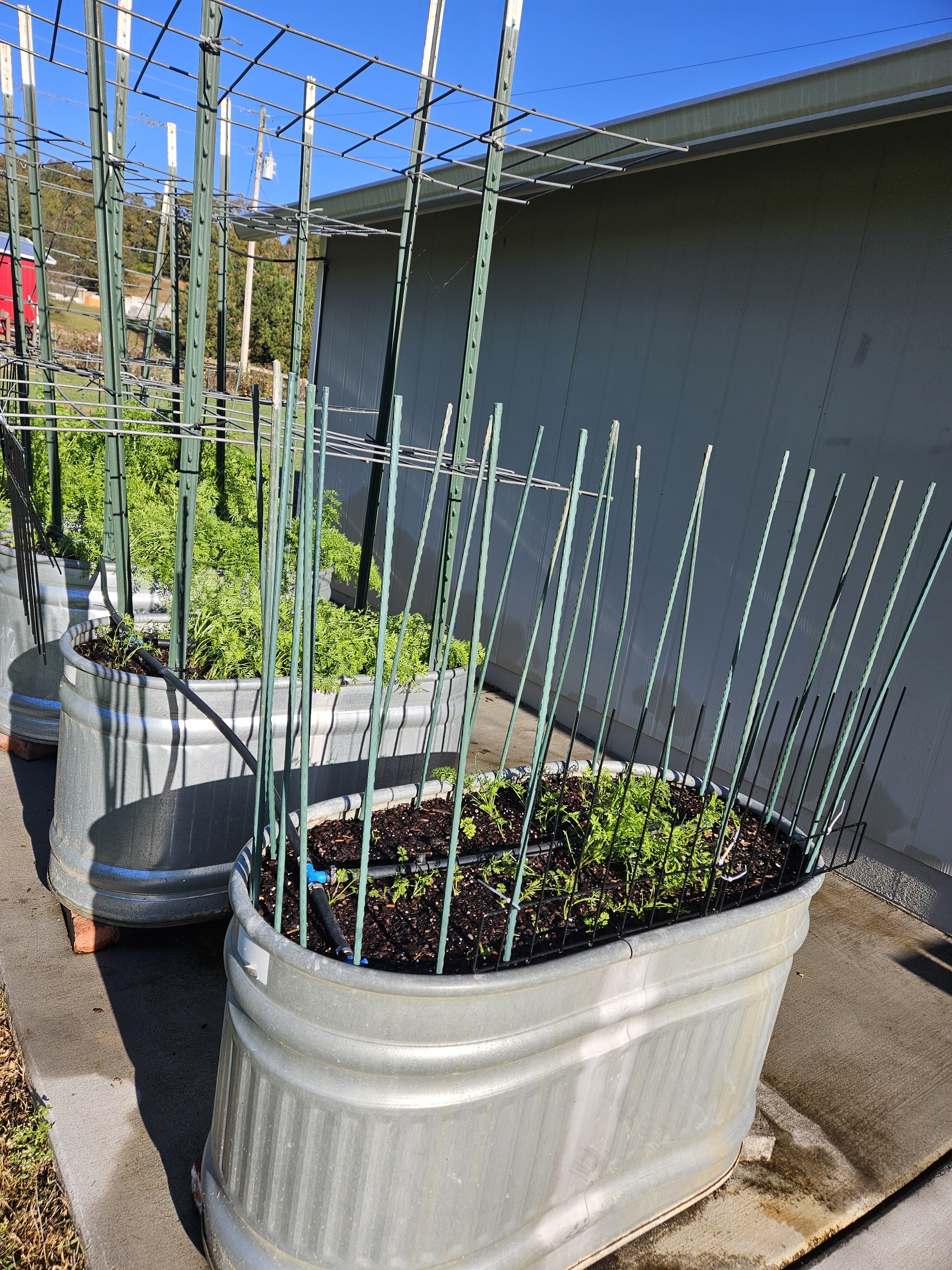 This year, I grew the greens on the south side of the house, so that I could use all the troughs behind the garden shed. We planted red, purple (the original color of carrots), and orange carrots back in mid-August. We haven’t gotten a lot of rain in the interim, so I had to water them pretty diligently, especially at the beginning. They are notoriously difficult to get to sprout, but watering every day got the job done.