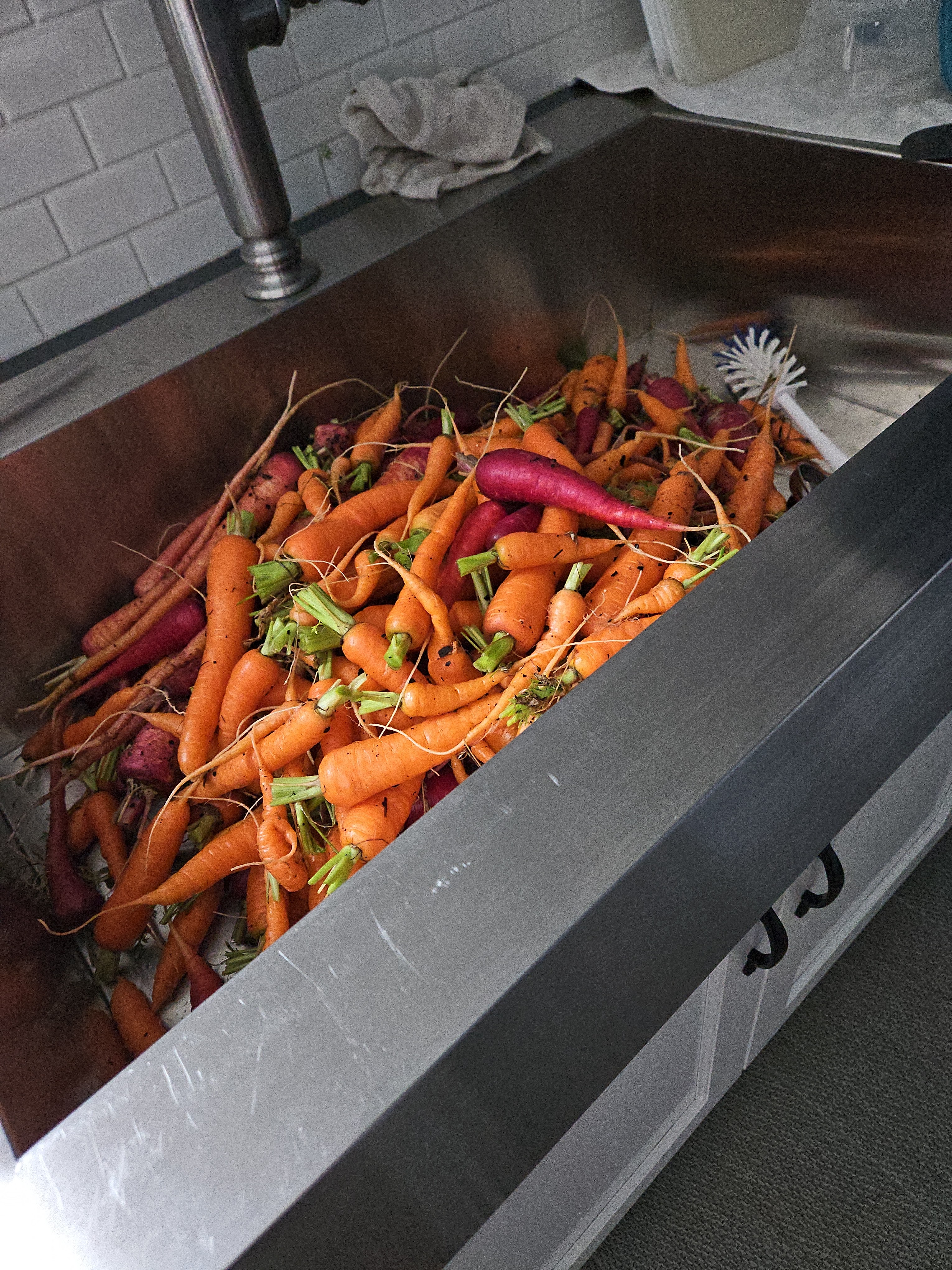 The deer around here have discovered my gardens, and have been nibbling on things. They especially like carrot tops, and have been pulling some of the carrots up with the tops, sooooo, I decided that I needed to harvest the carrots.