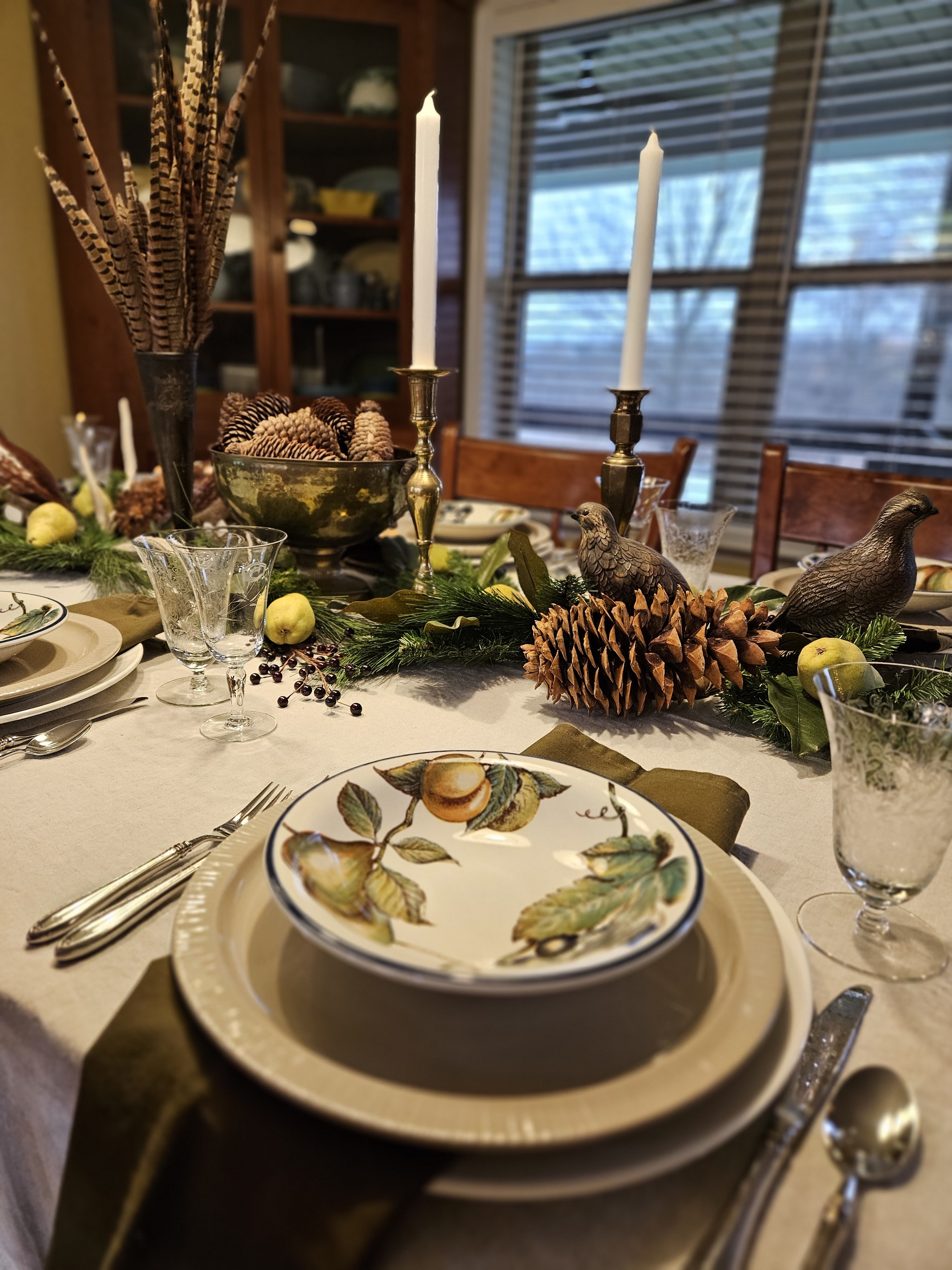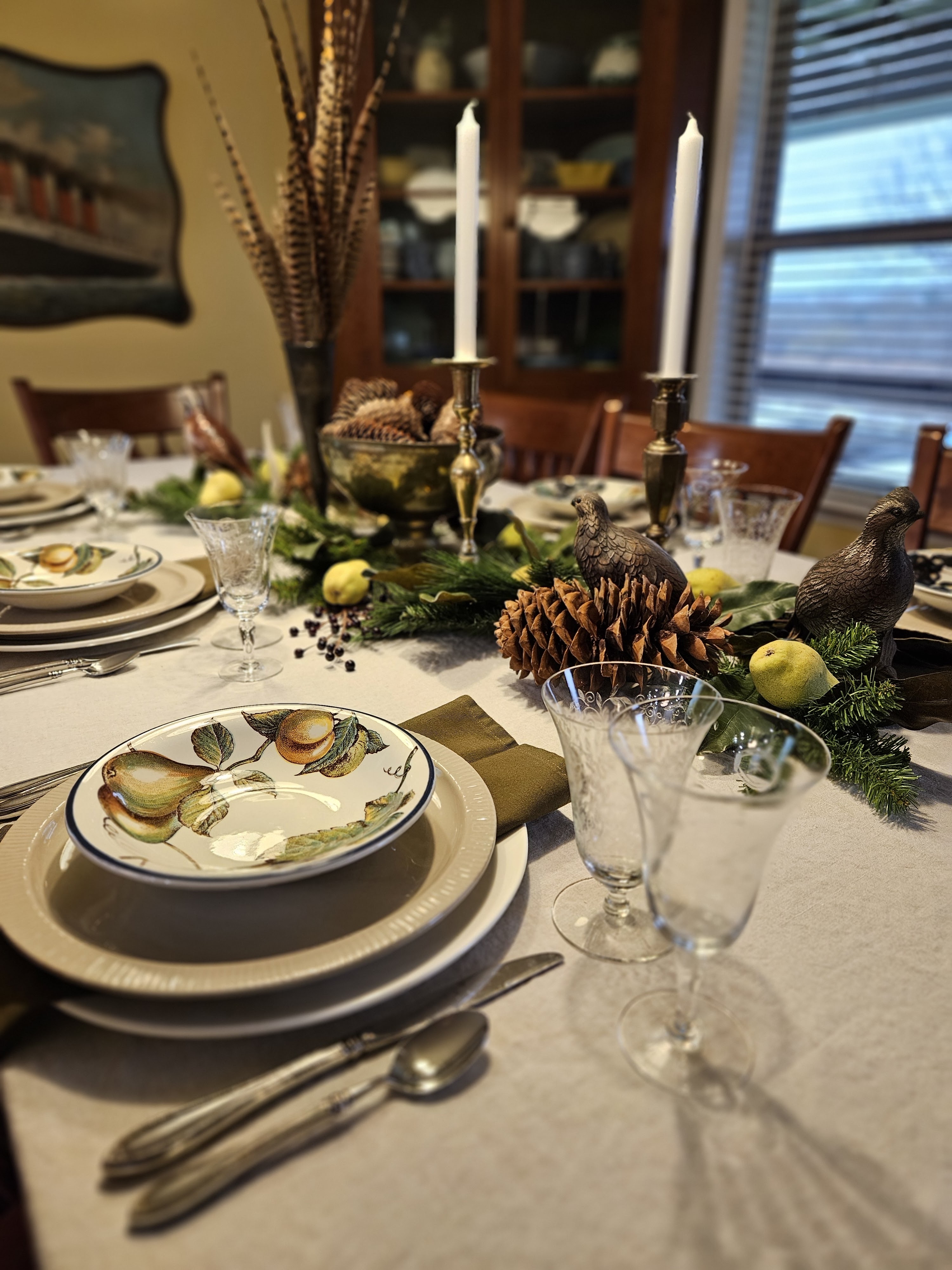 This table is basically the Nature’s Bounty table from Thanksgiving, turned into a Christmas table. I think quail are pretty similar to partridges and I had both pears and bowls with pears on them, so I had to do a little visual nod to the classic Christmas carol.