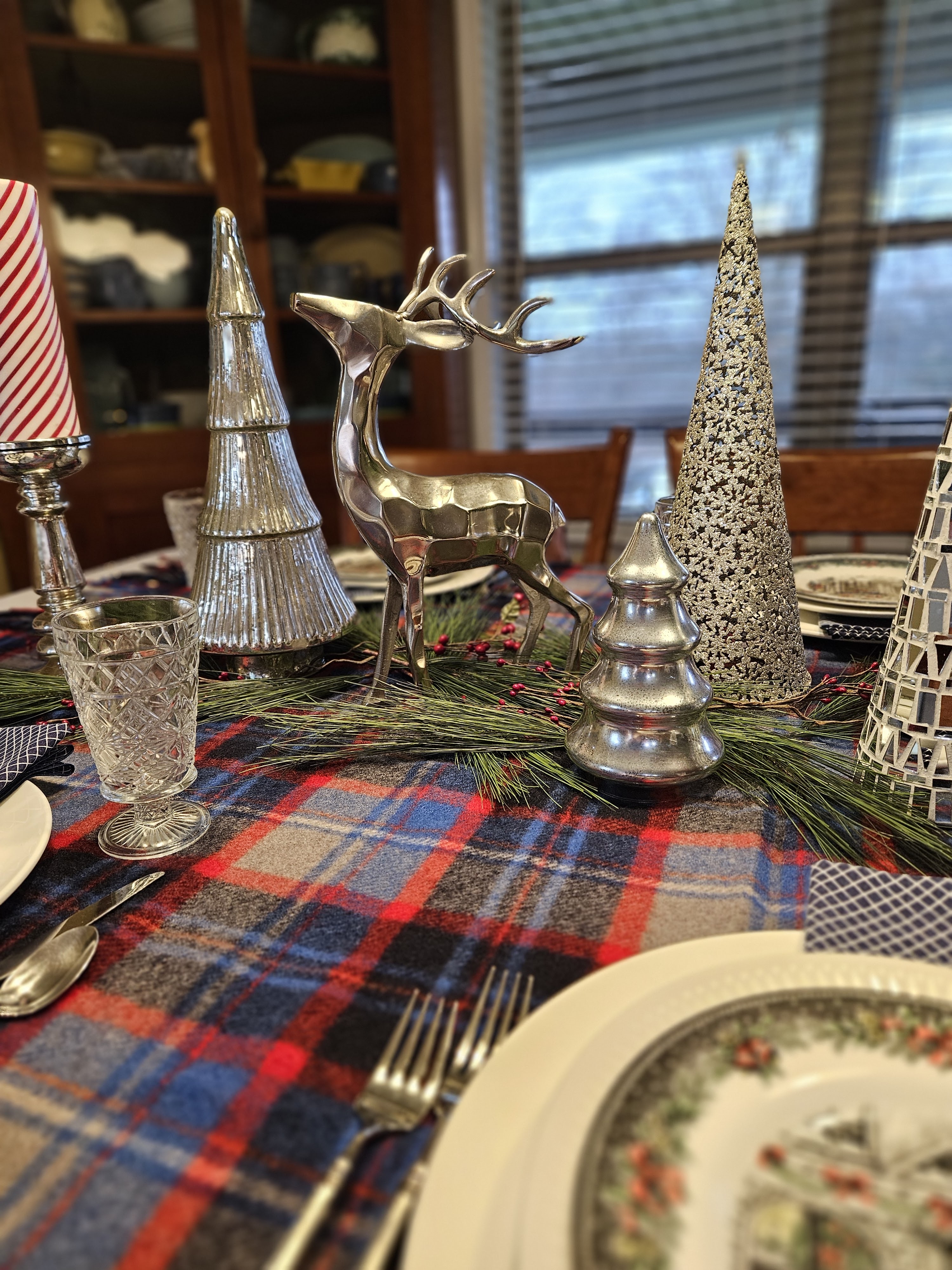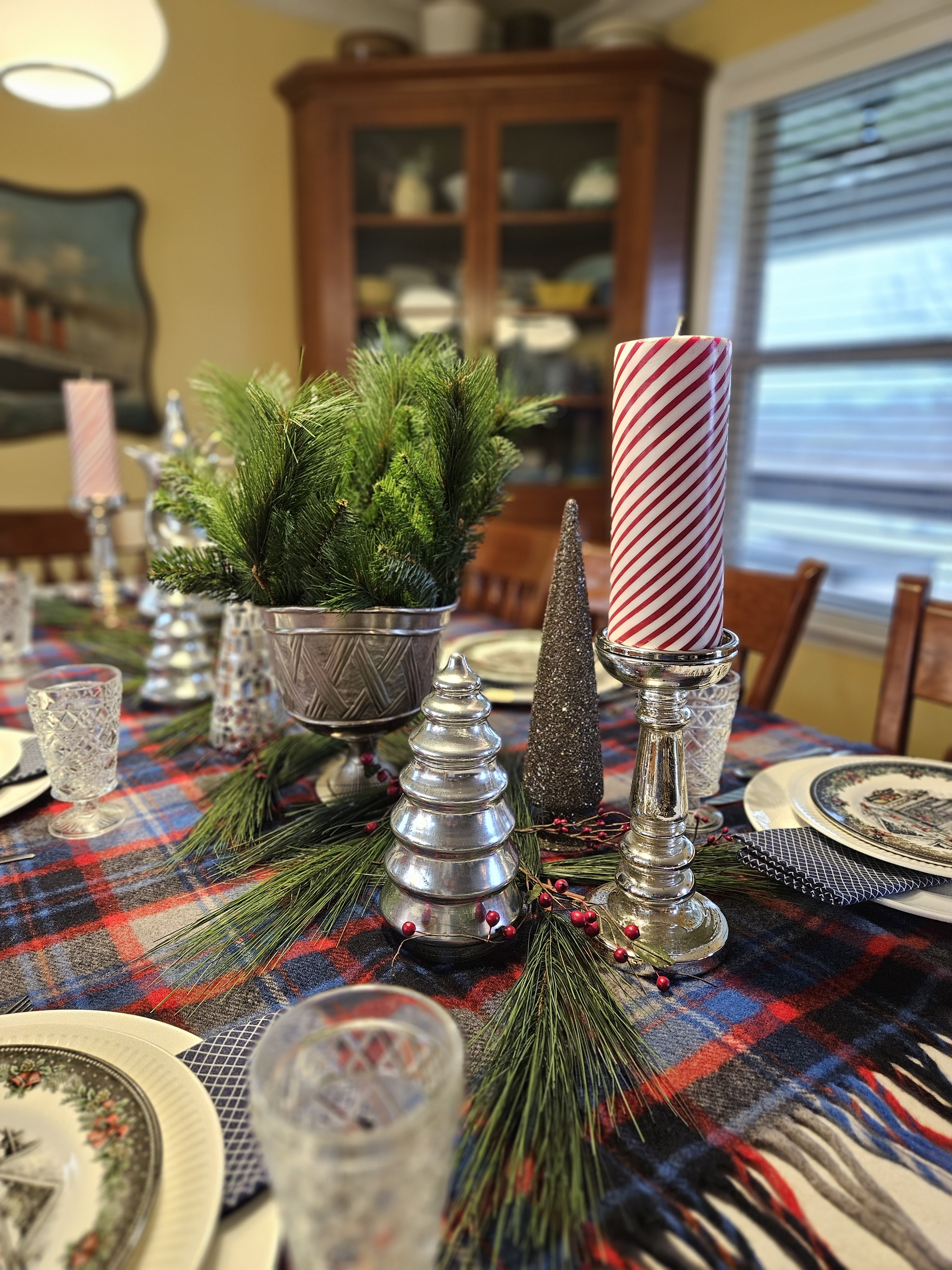 I started this table with a Pendleton throw that I bought on eBay. I added a silver tone reindeer, some mercury glass trees, some faux greenery and berries, a metal footed bowl with faux greenery, and my peppermint striped candles on mercury glass candle holders.