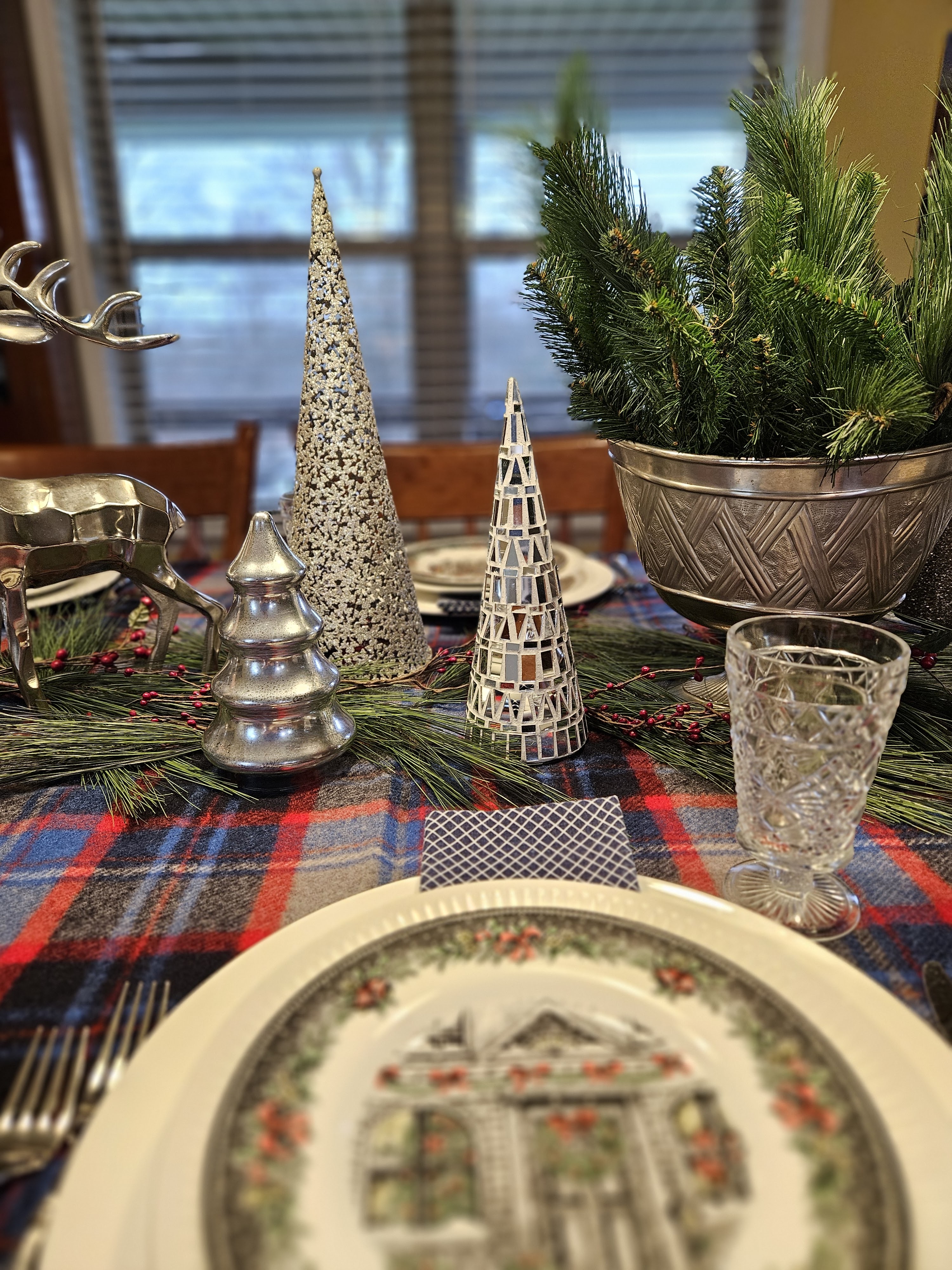 The place settings are the Wedgwood Service plates, Royal Stafford Christmas salad plates, and Johnson Brothers “Athena” dinner plates with Hazel Atlas Big Top Peanut Butter iced tea glasses and patterned navy and white napkins.