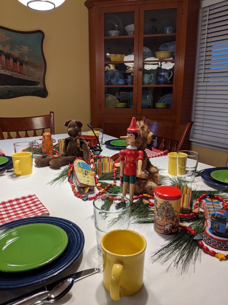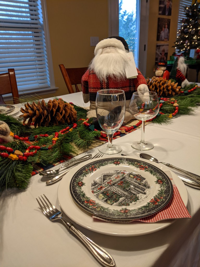 I started this table with a rustic table runner with green, reds, and blue stripes on an off white/beige background. I added my large Woof N Poof Santas, a handmade Santa, a little Swedish gnome, and a German incense burning Santa. I surrounded them with artificial greenery topped with the wooden bead garland, and the two large pine cones.