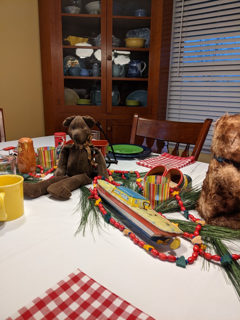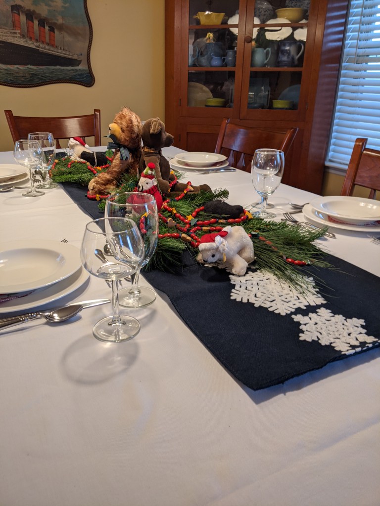 I noticed that I had a lot of large bear ornaments which inspired this Beary Merry Christmas table. I started with the navy and embroidered snowflake runner, and began with my oldest son’s and my childhood teddy bears, and then added some handmade felted black bear ornaments, two Stieff polar bears, and a couple of overstuffed white bears wearing red sweaters and hats. I topped it with the wooden bead garland.