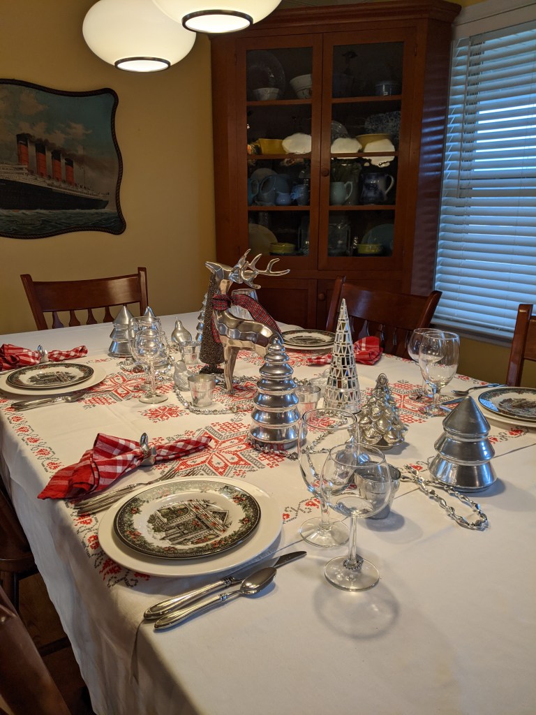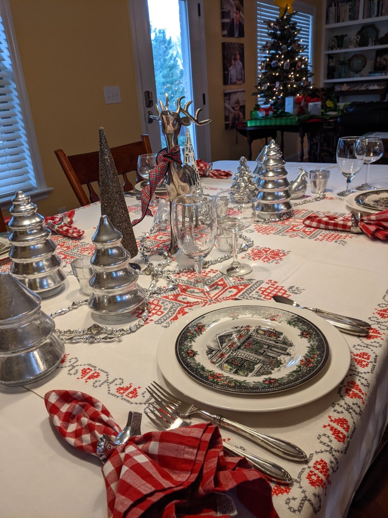 This is the table that started the whole idea of doing a bunch of different tables. It’s a bunch of mercury glass trees and glittery trees and a nickel reindeer sporting a checked “scarf” and a vintage embroidered table cloth in greys and reds. I completed the look with white dinner plates and holiday salad plates, red and white checked napkins with hen napkin rings, flatware and glassware.