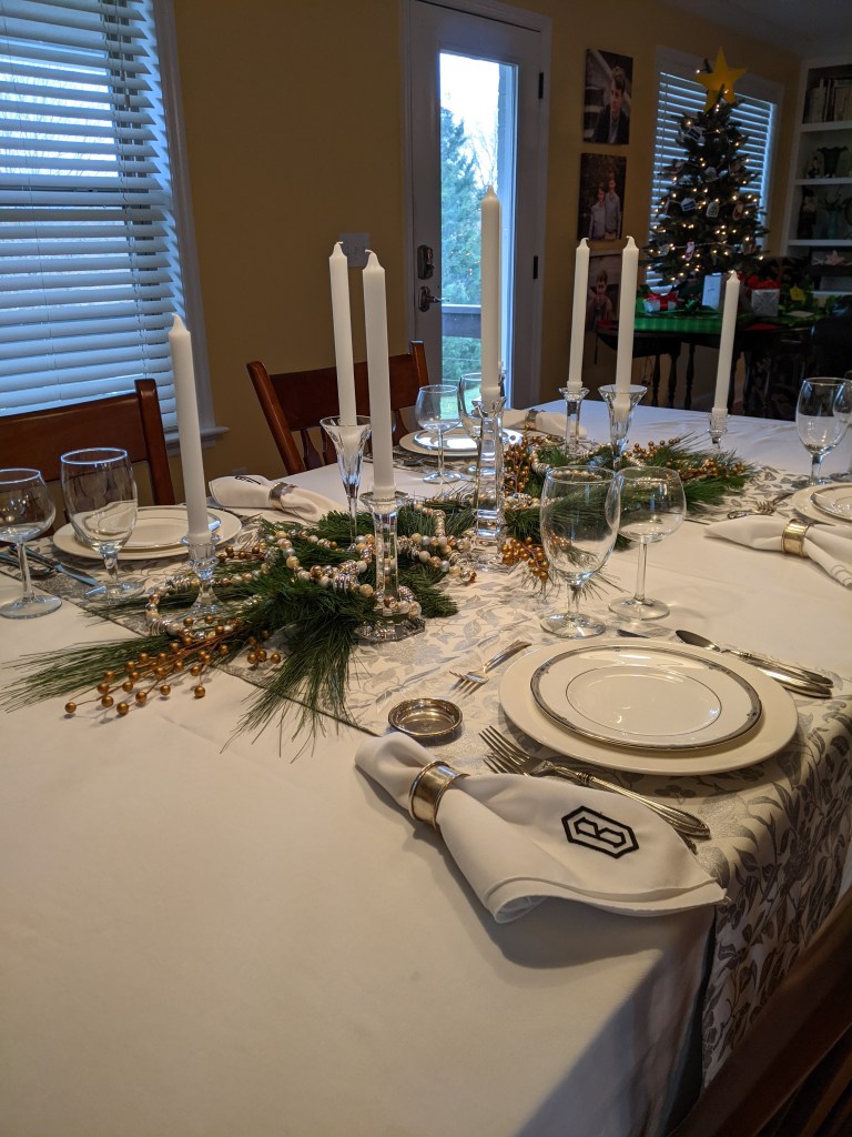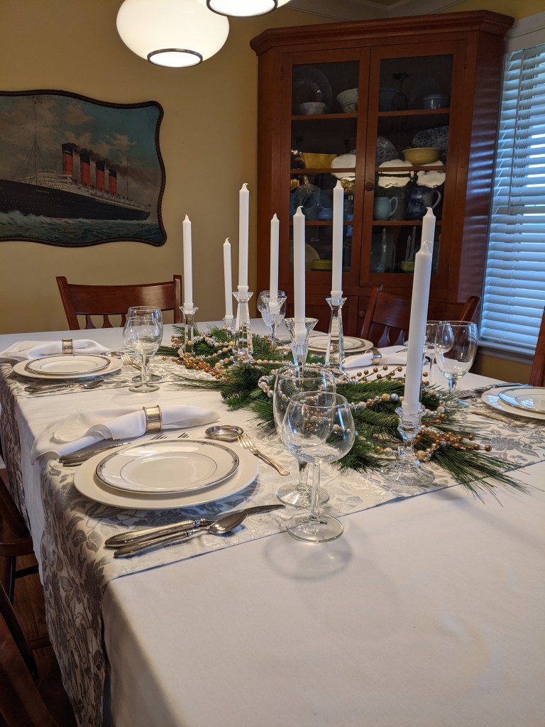For this table I pulled out all my crystal candle sticks and dramatic white tapers and created a dazzling silver and gold themed table. Here I used a pair of 72″ white table runners covered with a silver leaf pattern, artificial greenery, gold berry picks, and Christopher Radko “shiny brite” garland with blues, silvers, and golds. Just a word about table runners–I love them. You can add color and texture to your table without having closets full of different table cloths. I have loads of runners and small decorative table cloths that I can use to change the look of a table.