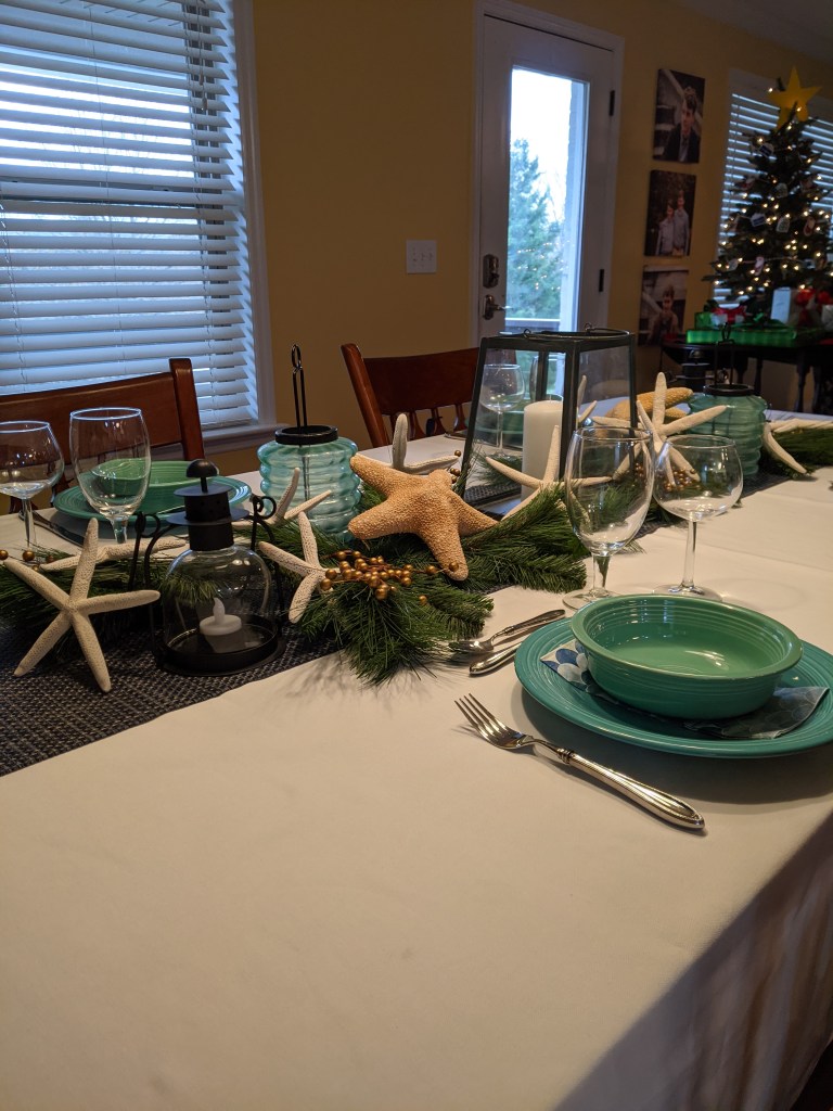 This is my seasons greetings from the seashore table. I started the look with a navy woven vinyl table runner topped with a large rustic glass and steel lantern, two aqua glass and metal lanterns, and two small black metal and glass lanterns. (Lanterns are another of my go-to items when creating a tablescape–they add height and keep your candles protected.) I interspersed artificial greenery branches and artificial long leaf pine sprigs among the lanterns and topped them with gold berry picks. Then I used loads of starfish to finish the look.