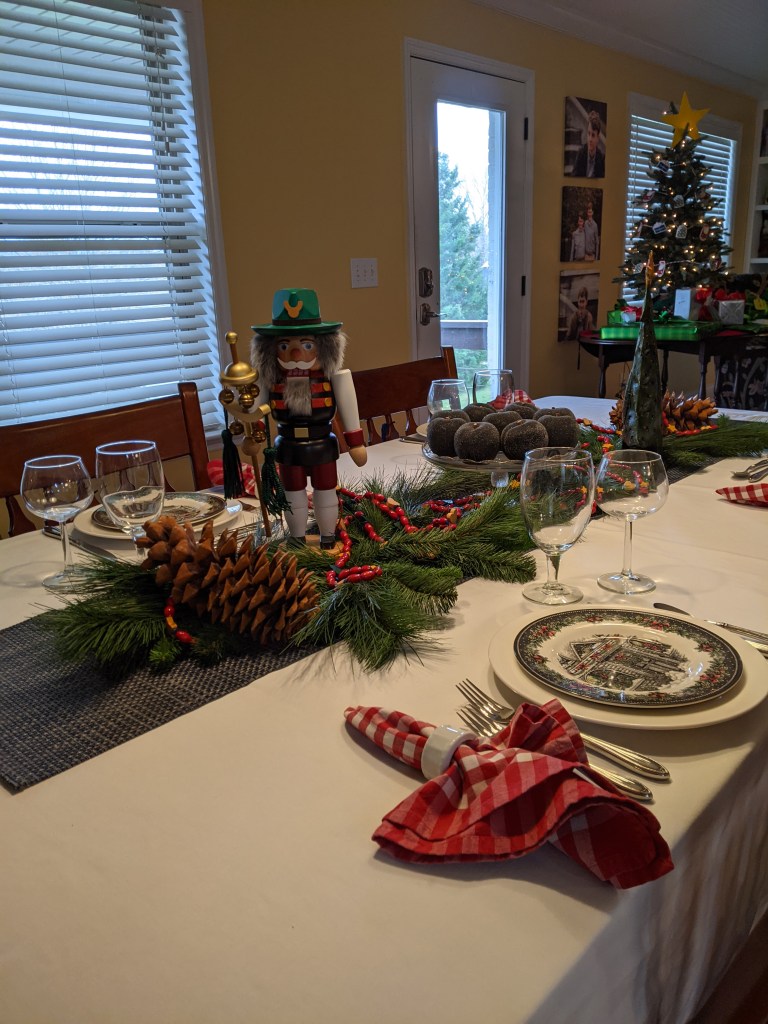 The theme for this table is the Nutcracker Suite with the extra large wooden nutcracker, large metal Christmas tree and sugar plums. I used the navy woven vinyl runner for this table, artificial greenery, wooden bead garland and extra large pine cones to anchor the ends of the runner.