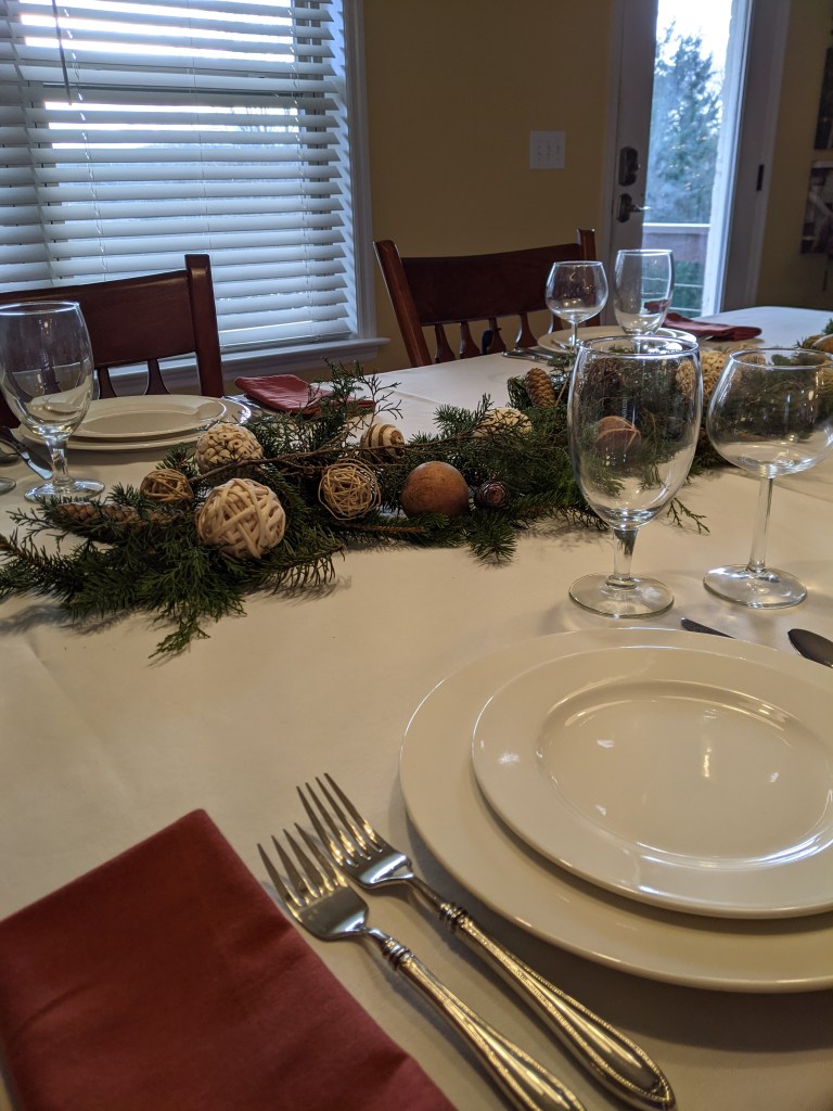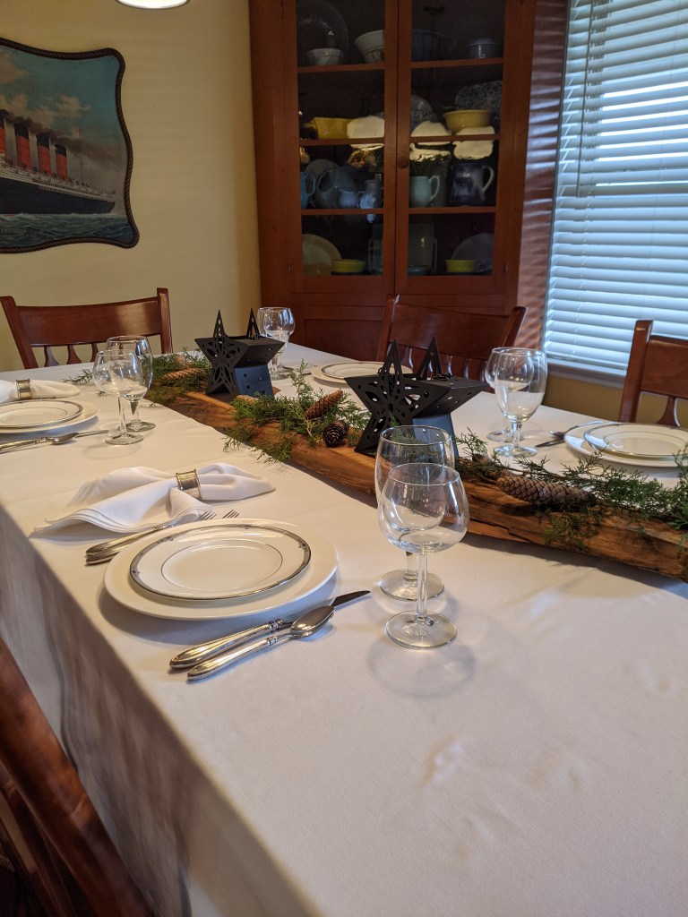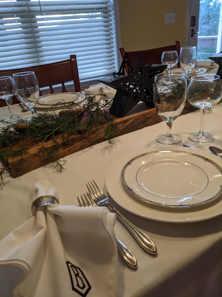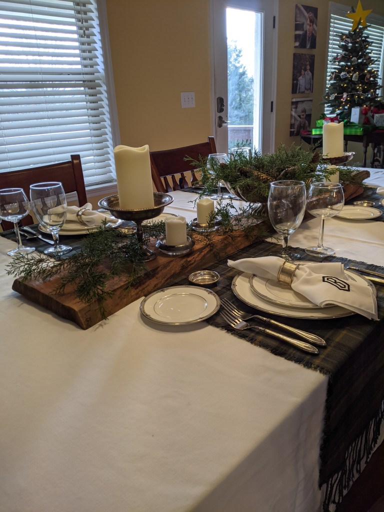 This is another look I created with the rustic wooden “runner”. This time I used old silver pieces with fresh cedar and pine cones to build a rustic elegance table. (The candles are flameless, so we won’t burn our house down.)