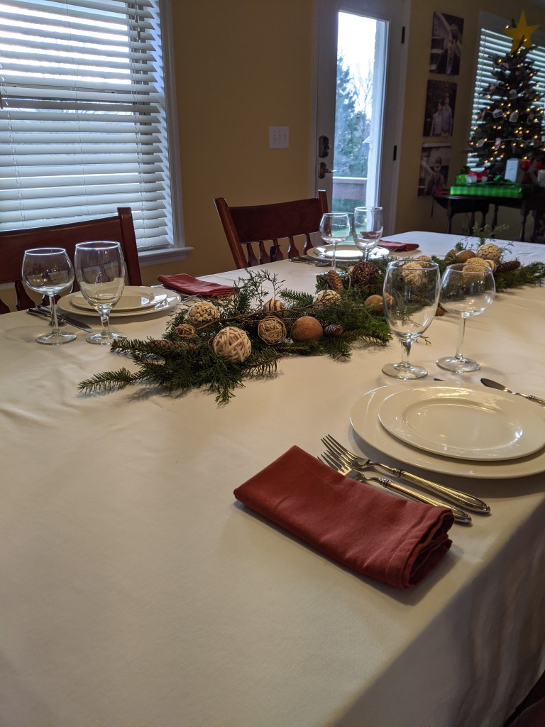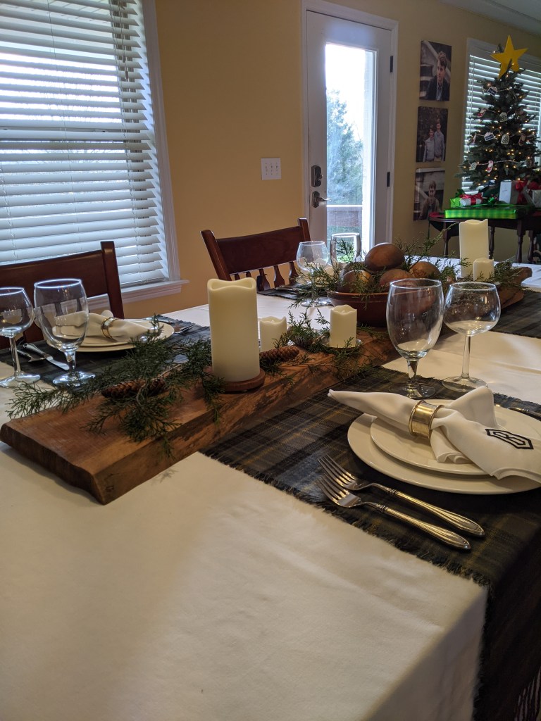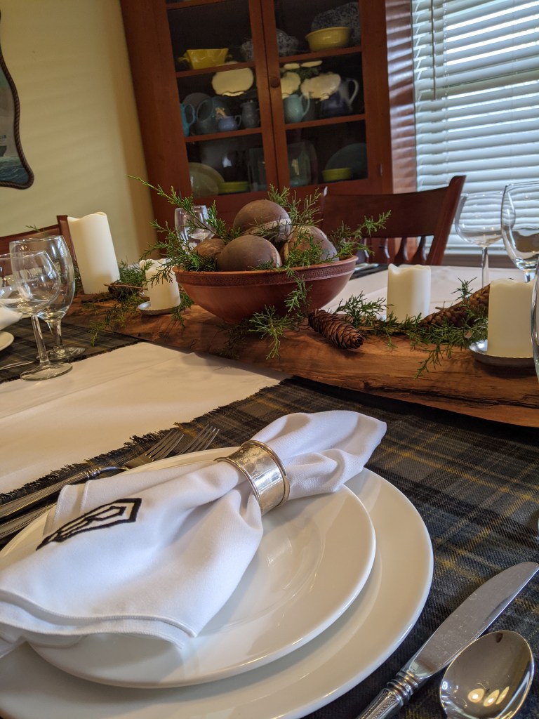 We built a wood shed this past summer so that we could get all of Mike’s lumber out of the storage building. We finally got all the wood moved into the shed and I found this slab of black walnut and it looked like a table runner to me, so I used it along with some men’s wool scarves to create a rustic holiday table. I used wooden coasters and aluminum coasters for candle “holders”, with fresh cut cedar and pine cones around a wooden bowl filled with old croquet balls that remind me of Christmas balls.
