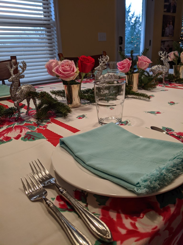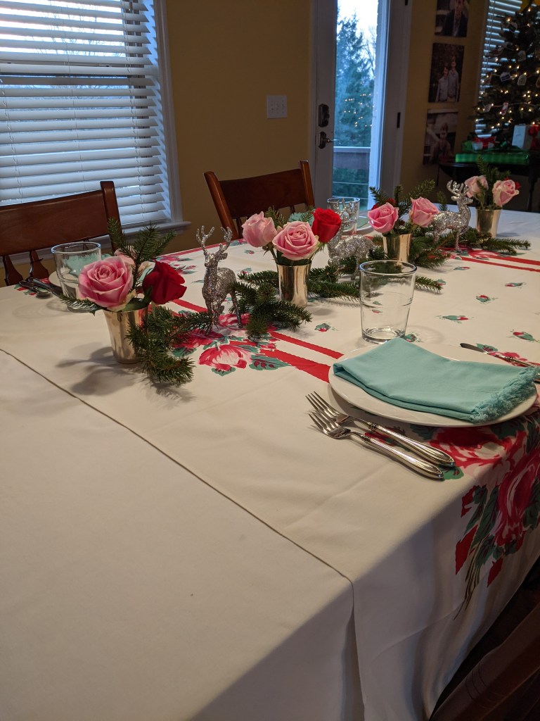 I have been planning to use this table cloth because of the great red and green pattern. I thought that I would be using my jadeite colored vases with pink and red flowers, but when I put the jadeite on this cloth, they were too yellow. The green in the cloth is really an aqua color. So I switched gears and used silverplate julep cups with pink and red roses, glittery silver reindeer, and simple greenery.