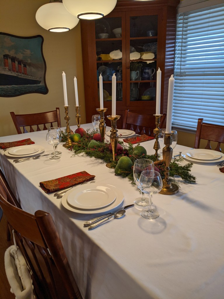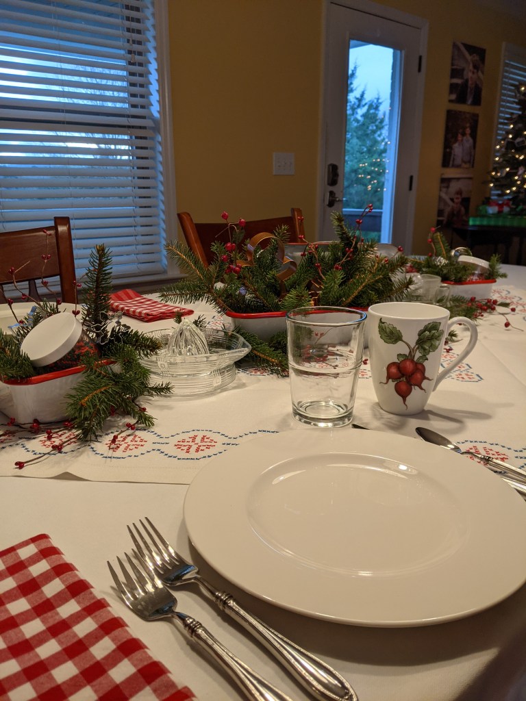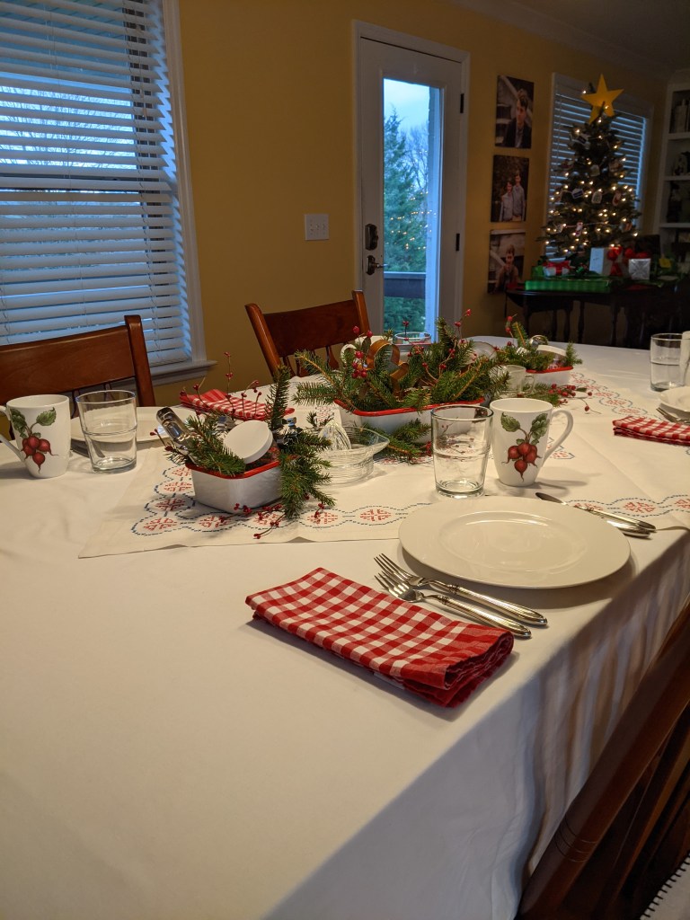 The place settings consist of white dinner plates with holiday salad plates, red checked napkins with white porcelain napkin rings, flatware and glassware. A word about napkin rings–I found these and the silver ones that you’ll see in these posts at a local thrift store for 25 cents each.