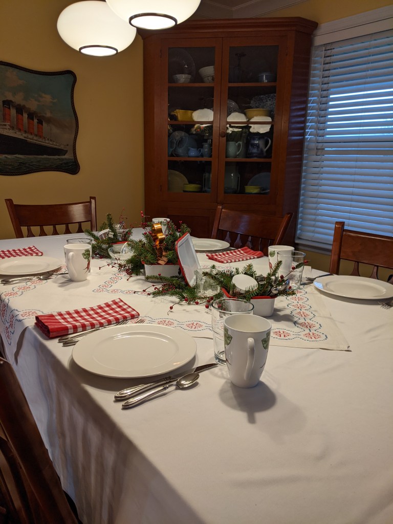 The table is set for breakfast with white plates, mugs and glasses, flatware, and red checked napkins.