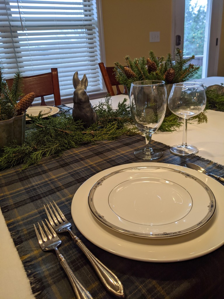 This is a monochromatic woodland table design. I started with the men’s scarves and topped it with some verdigris containers filled with pine and pinecones and nestled a couple of ceramic bunnies amongst the greenery on the table.