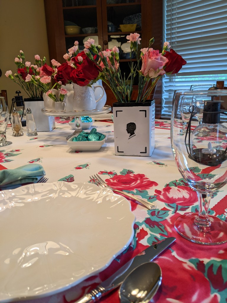 I used red and pink roses and cotton candy pink mini carnations for the flowers. I will add some greenery, but they didn’t have any where I bought the flowers. I had some dark chocolate mints in gorgeous aqua foil left from the baby boy baptism table I did, so I put those in some white dishes.